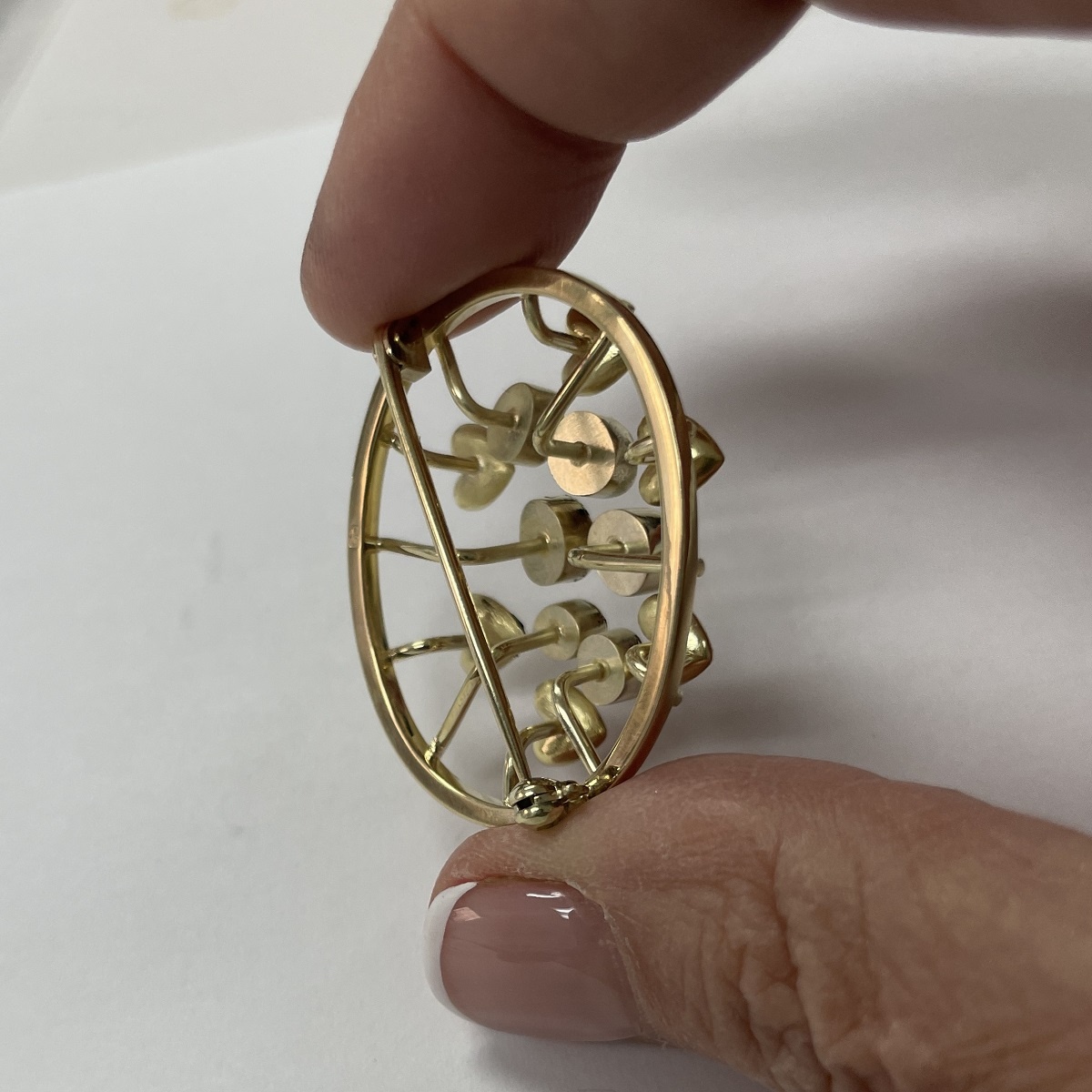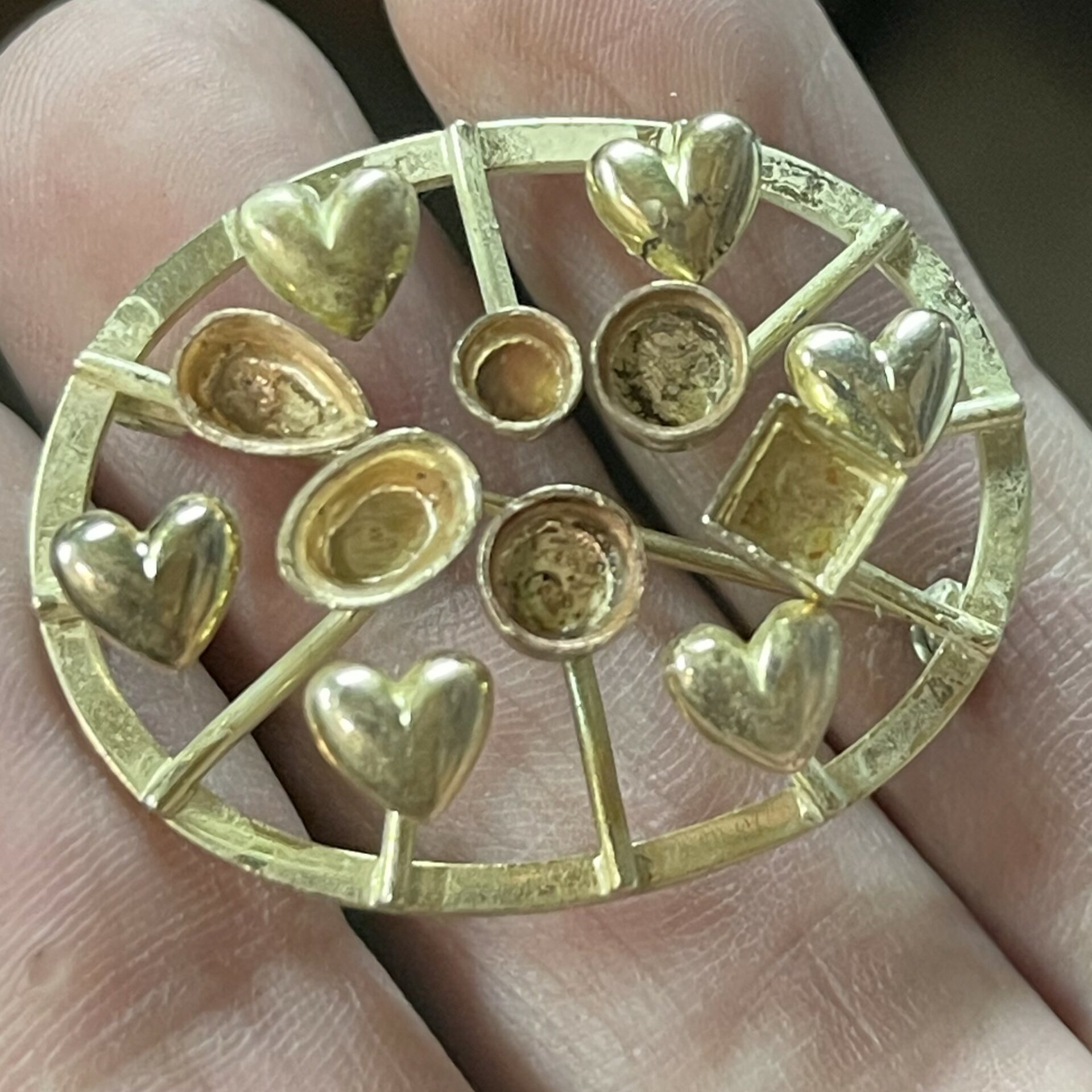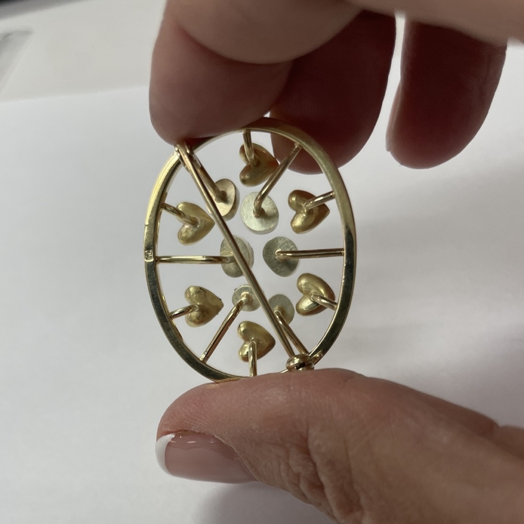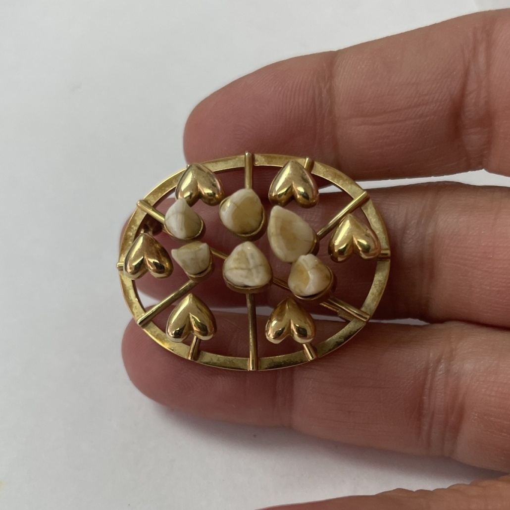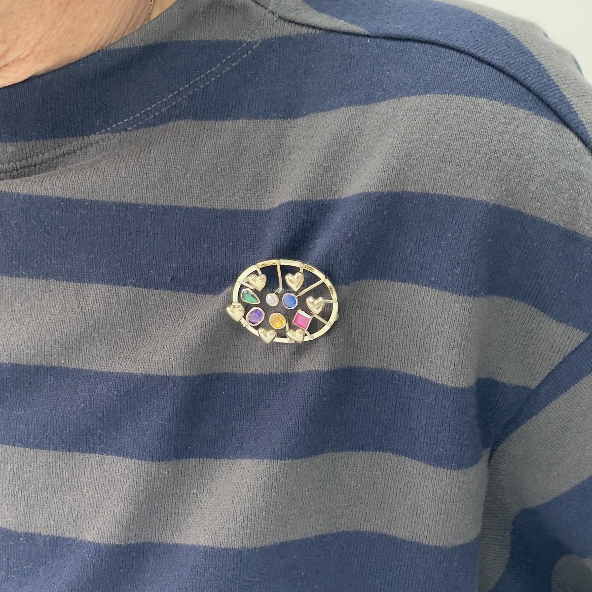 14k yellow gold family heirloom of teeth brooch redesigned with emerald, ruby, sapphire, amethyst, citrine, and a diamond.