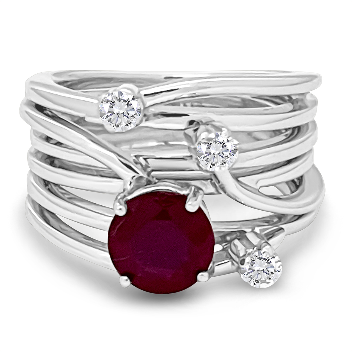 An artful blend of movement and brilliance, this sculptural ring features a vibrant ruby nestled among fluid waves of polished white gold and accent diamonds.