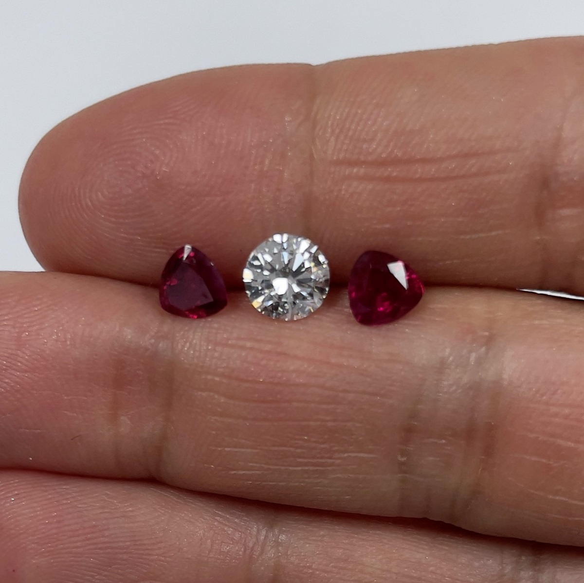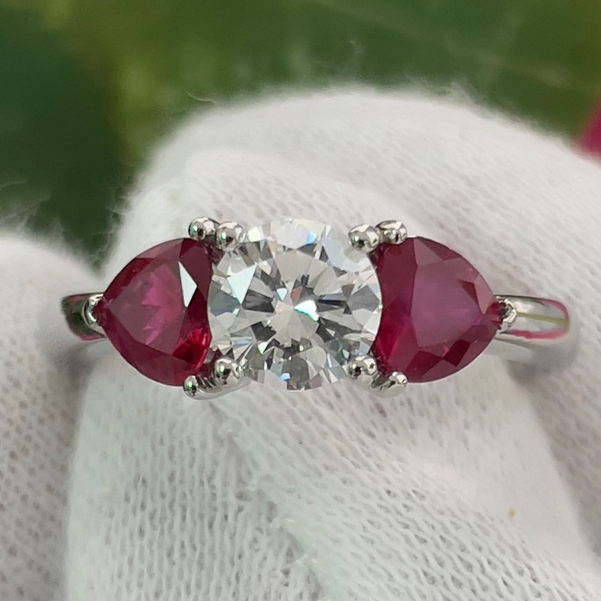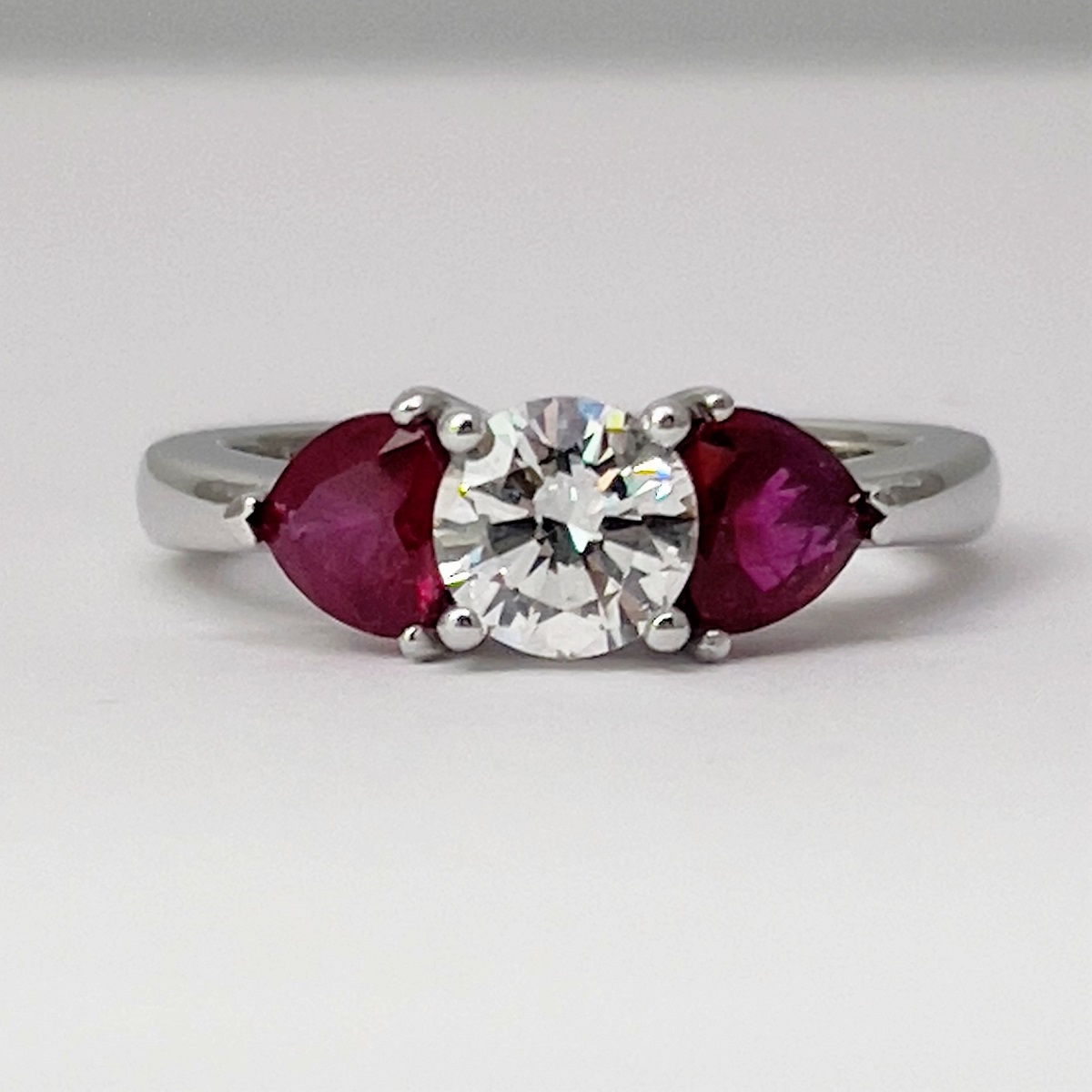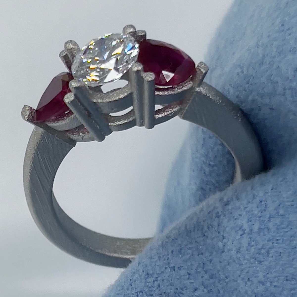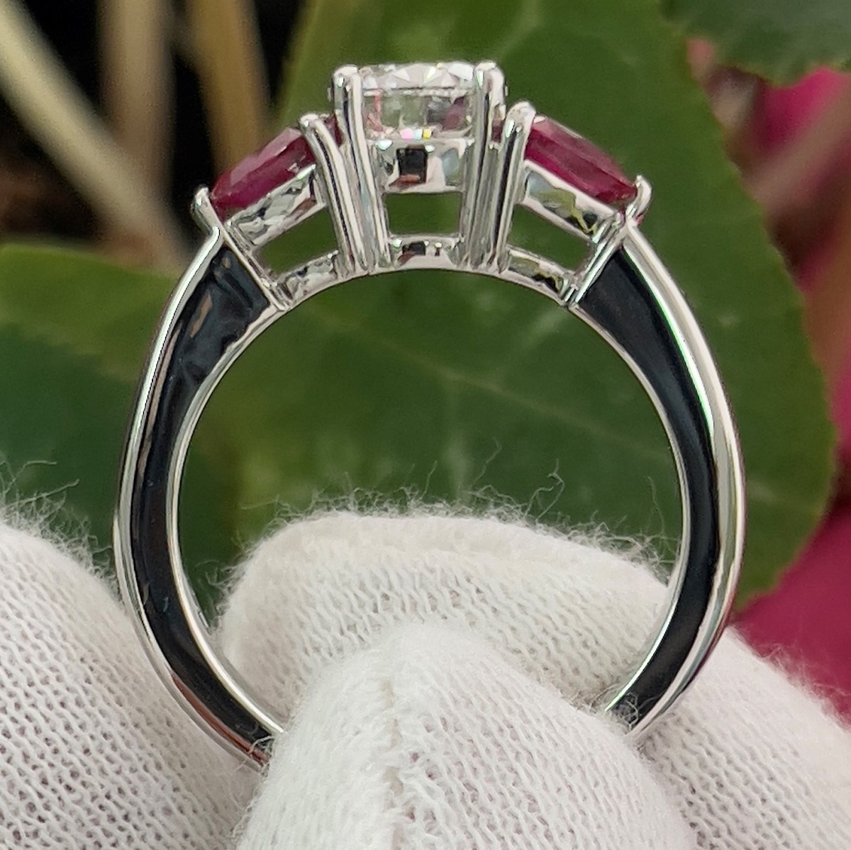 Platinum Ring With Diamond In The Middle And Two Rubies On The Side Uniquely Held By V-Shape Prongs.