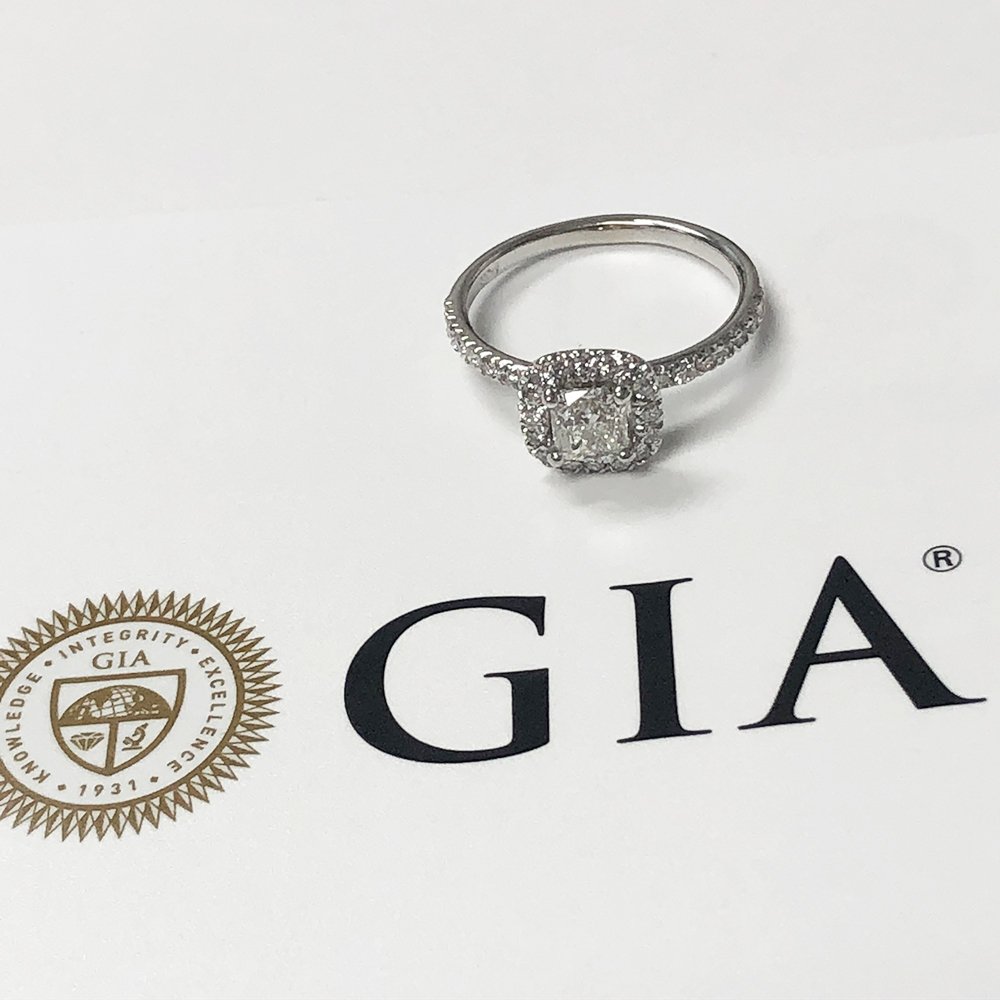 This custom made 14K White Gold Diamond Halo engagement ring features a GIA Certified center stone.