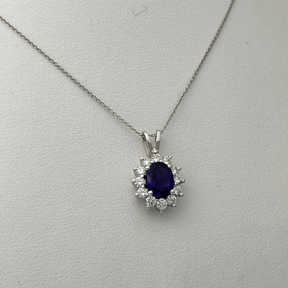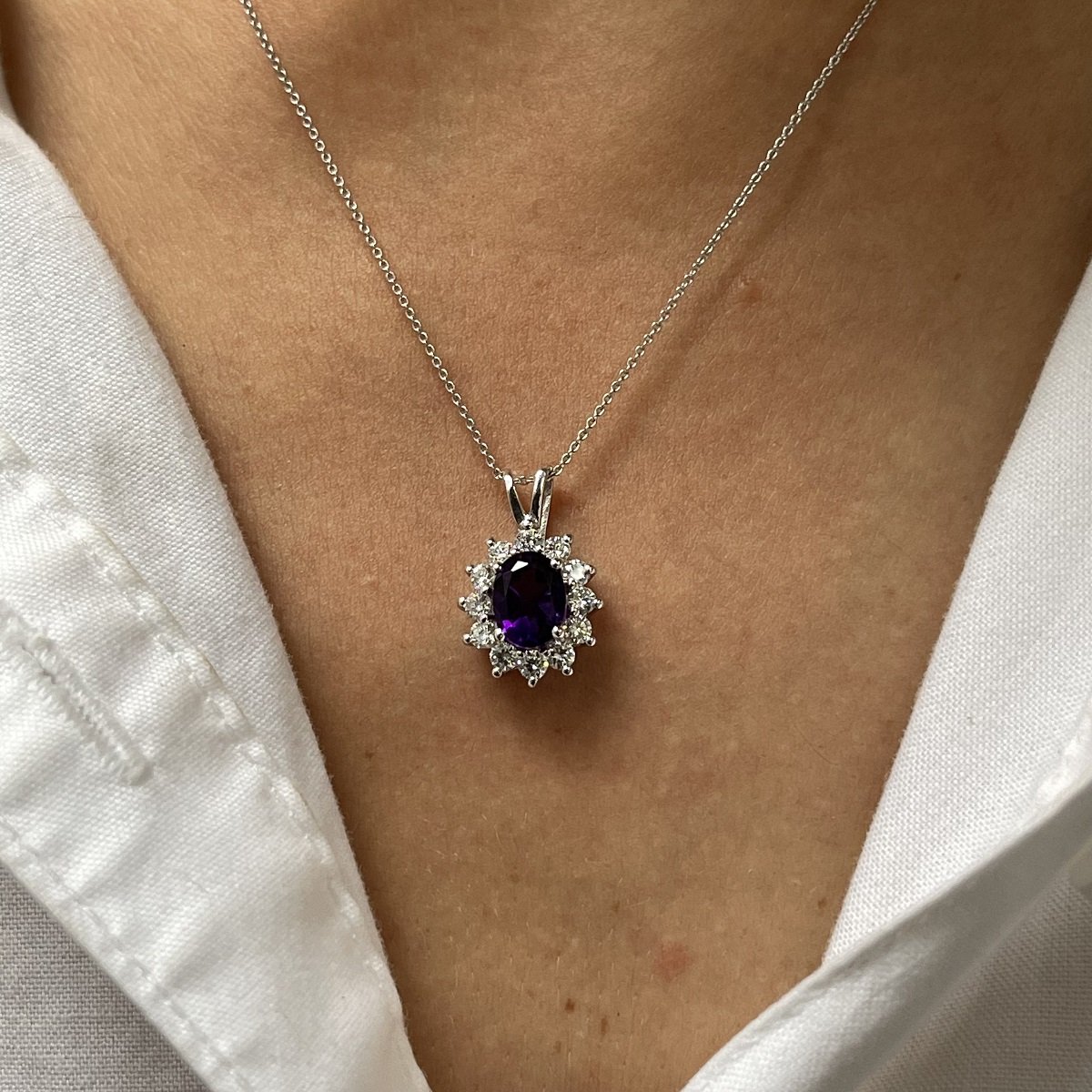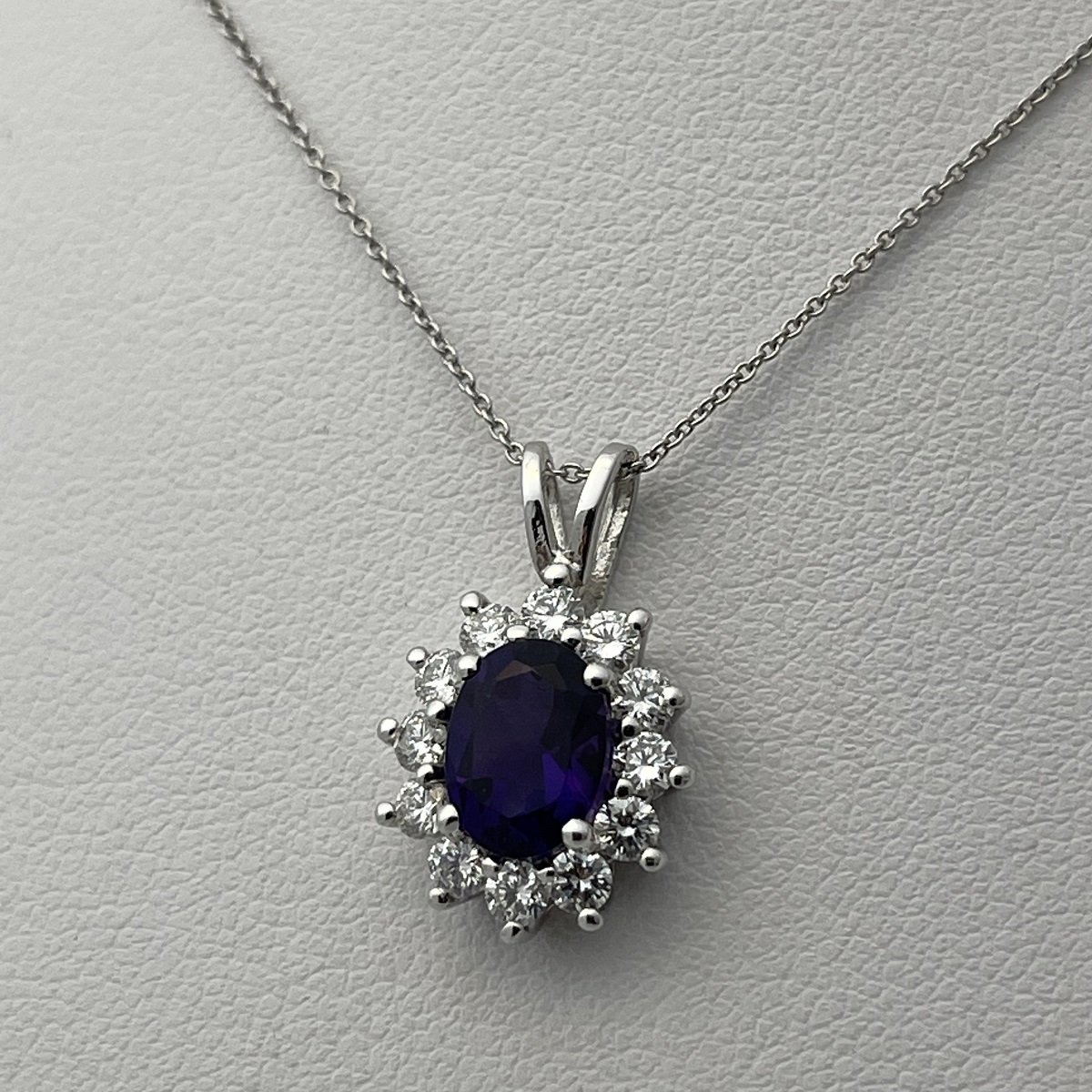 Twelve prong-set natural round brilliant diamonds surround an oval amethyst.