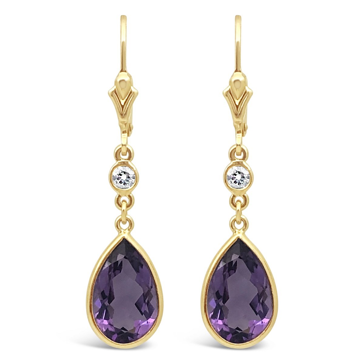These amethyst earrings feature yellow gold Fleur De Lis tops with Diamond Accents that end in beautiful oval amethysts.