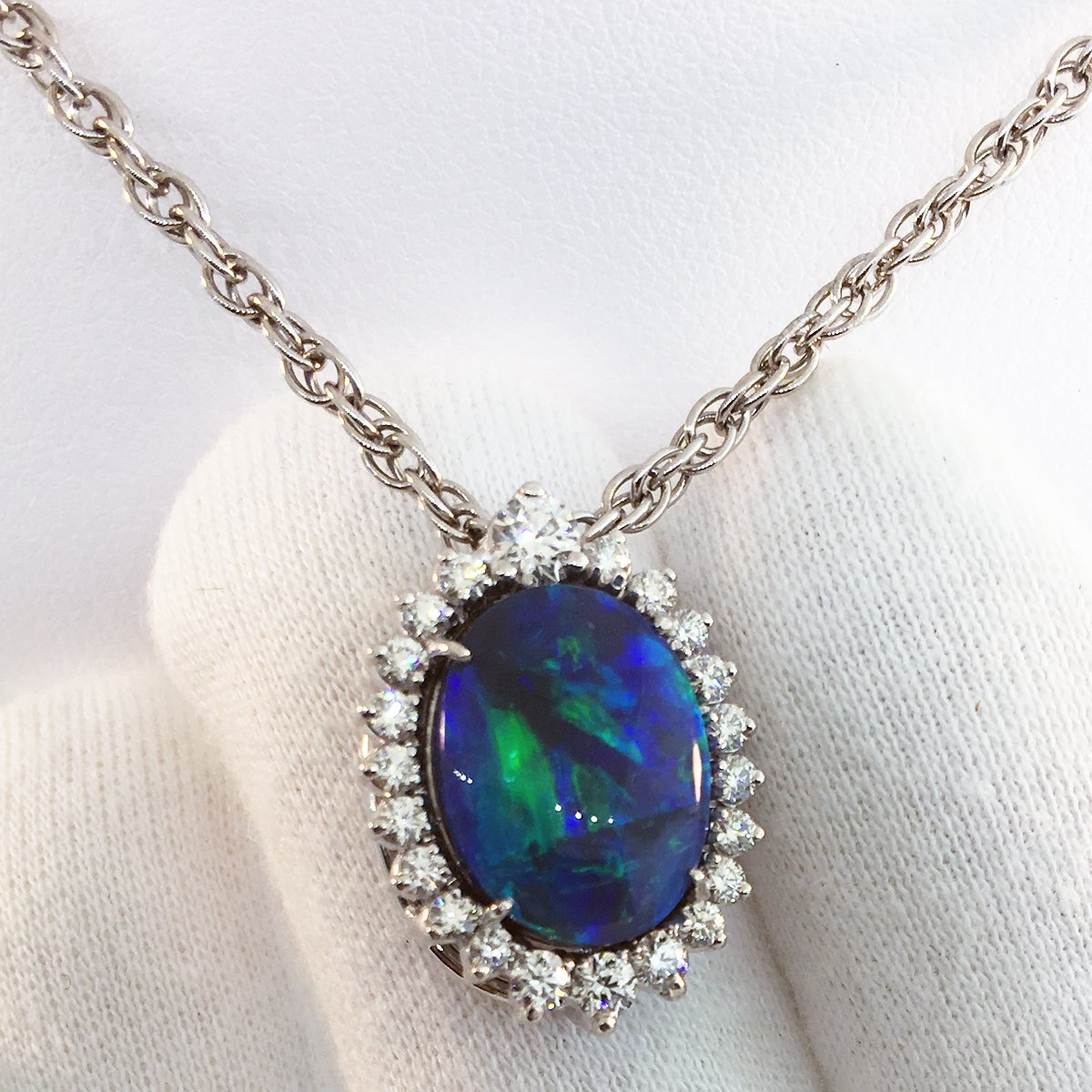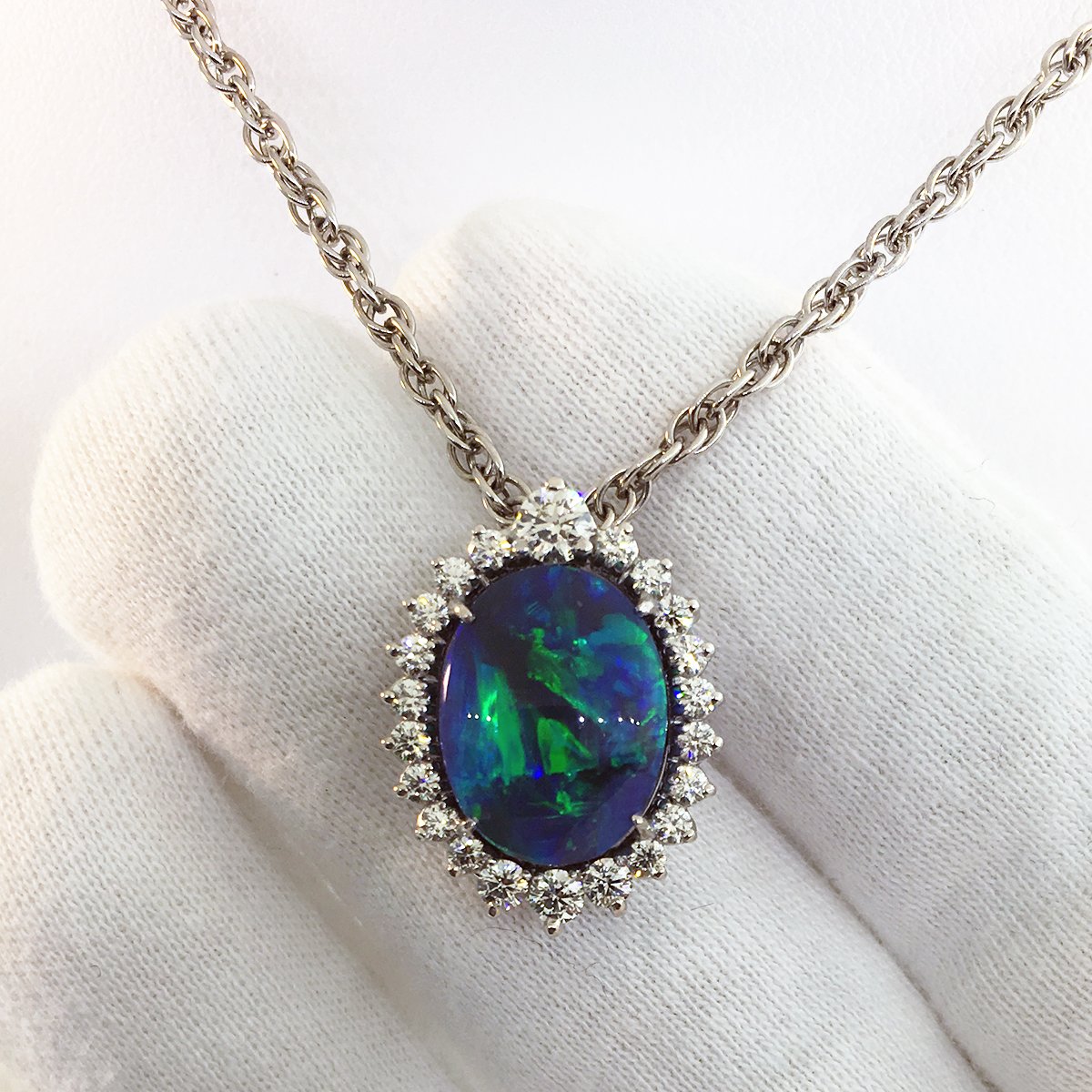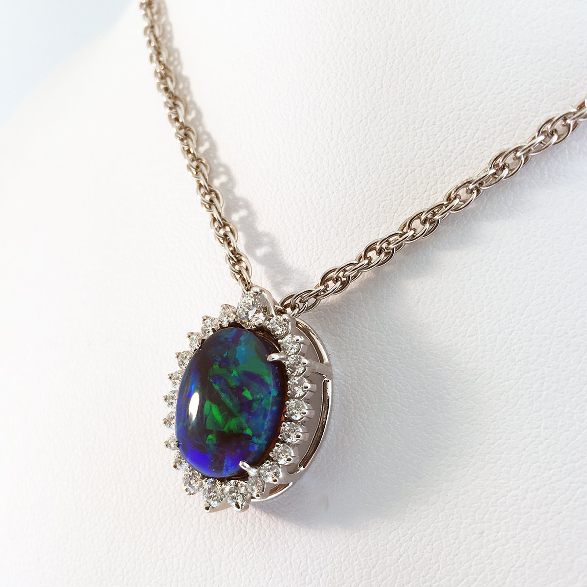 Black Opal and Diamond Pendant, Custom Fine Jewelry, 18K White Gold