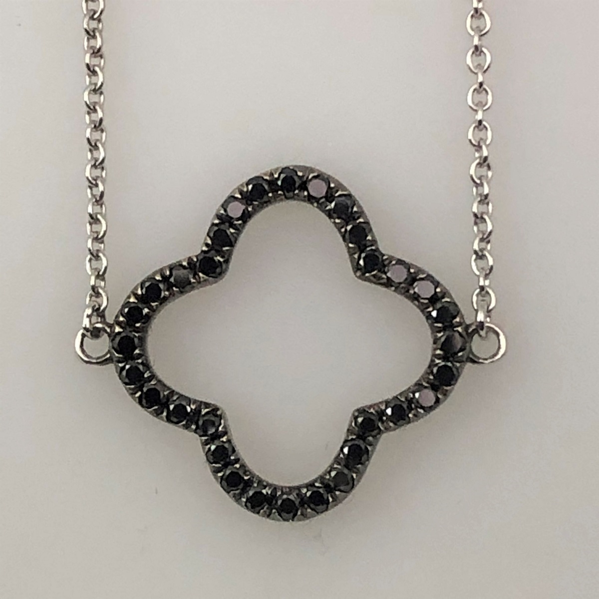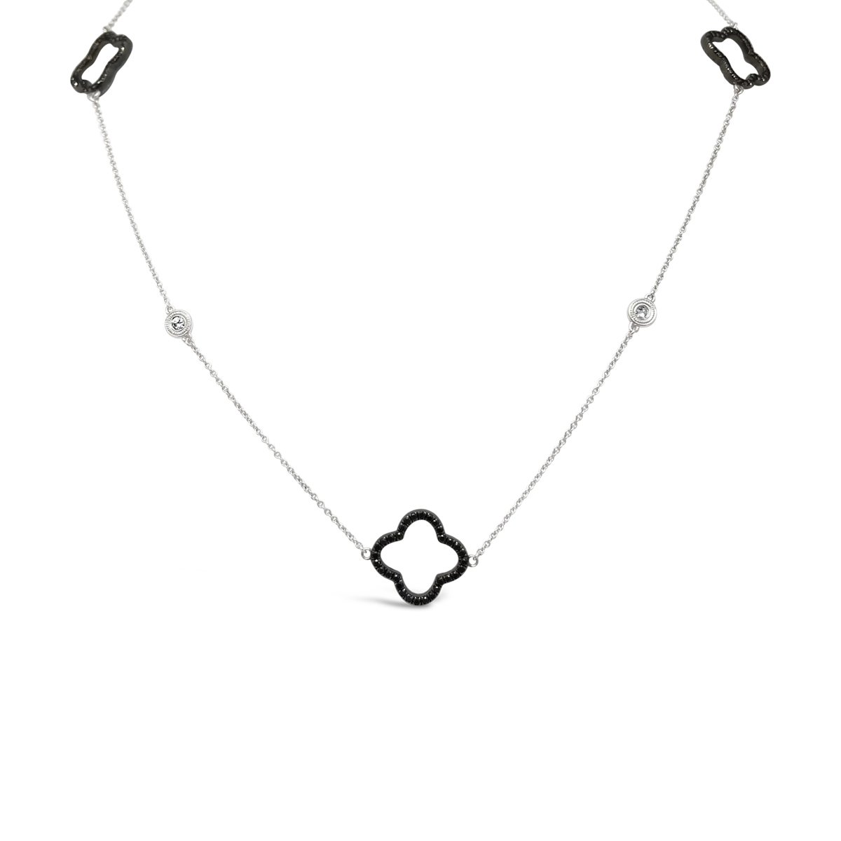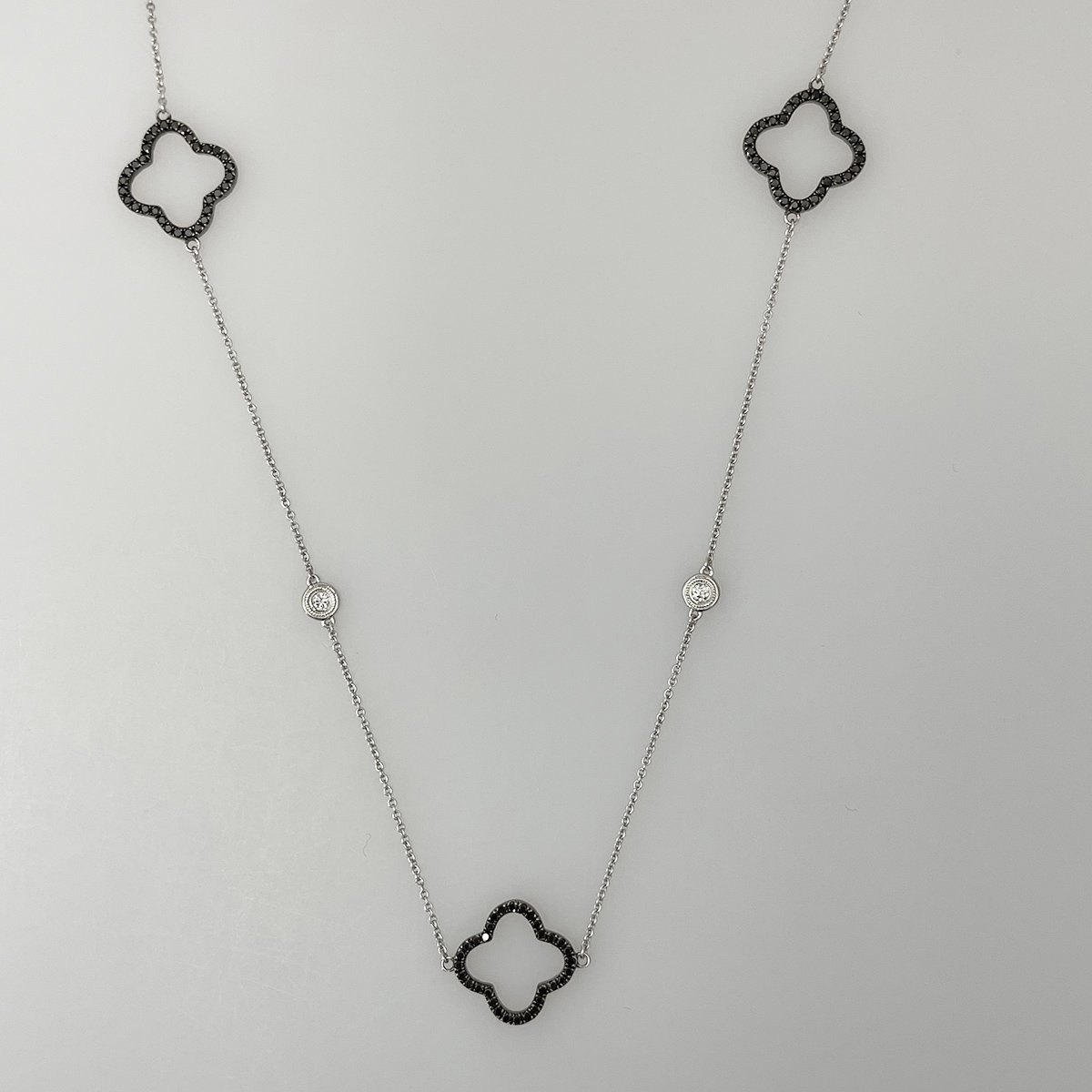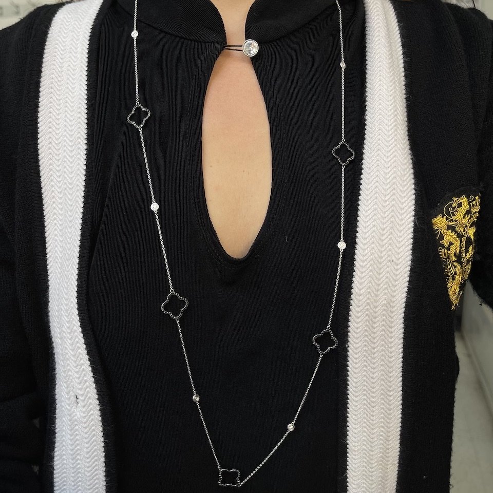 Black diamond trefoils with white bezel set diamonds create an opera length chain that goes with everything in your closet!