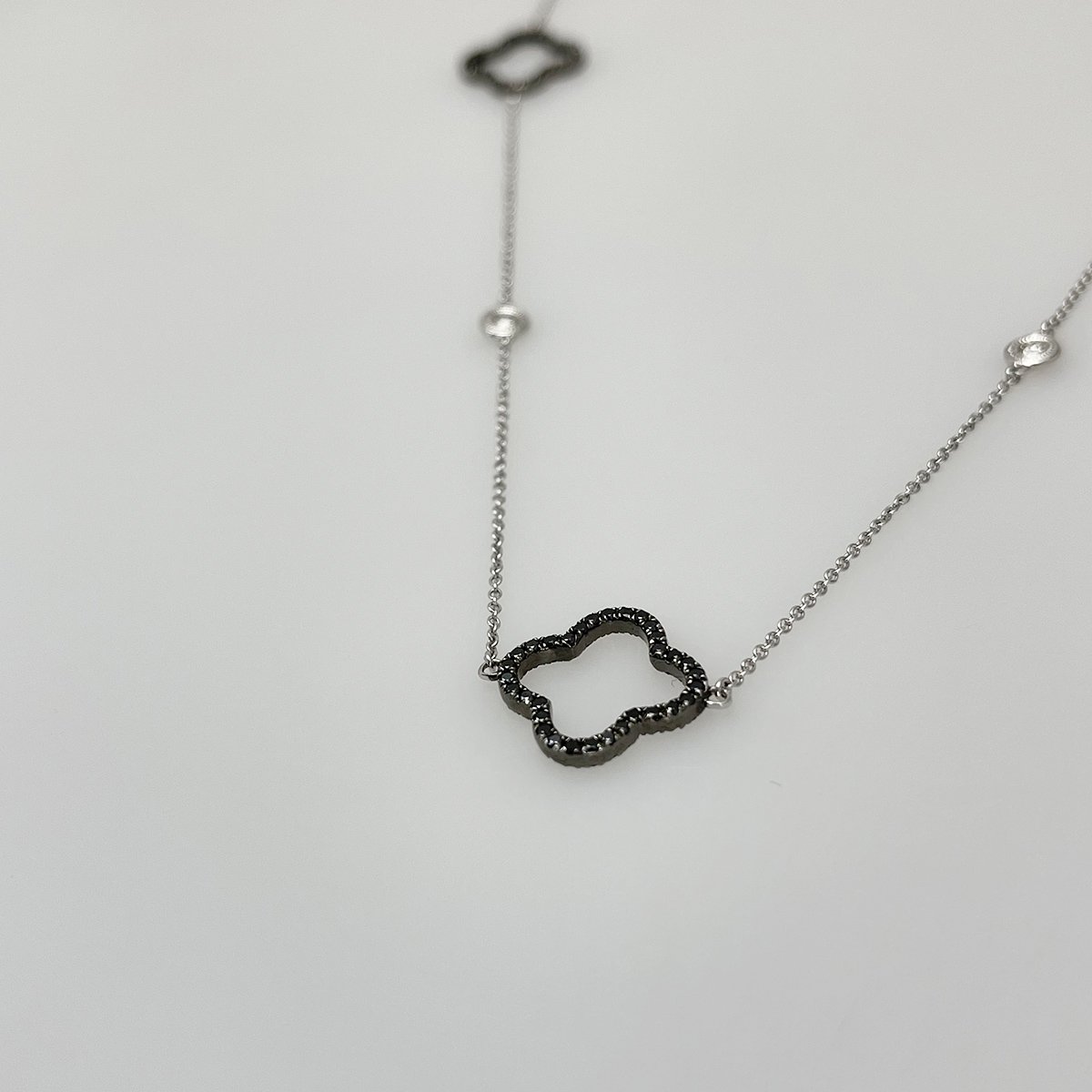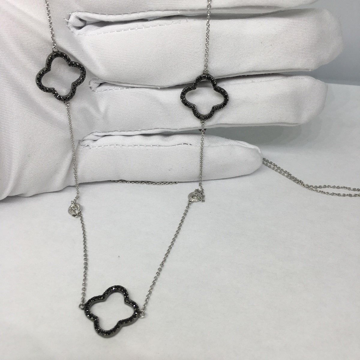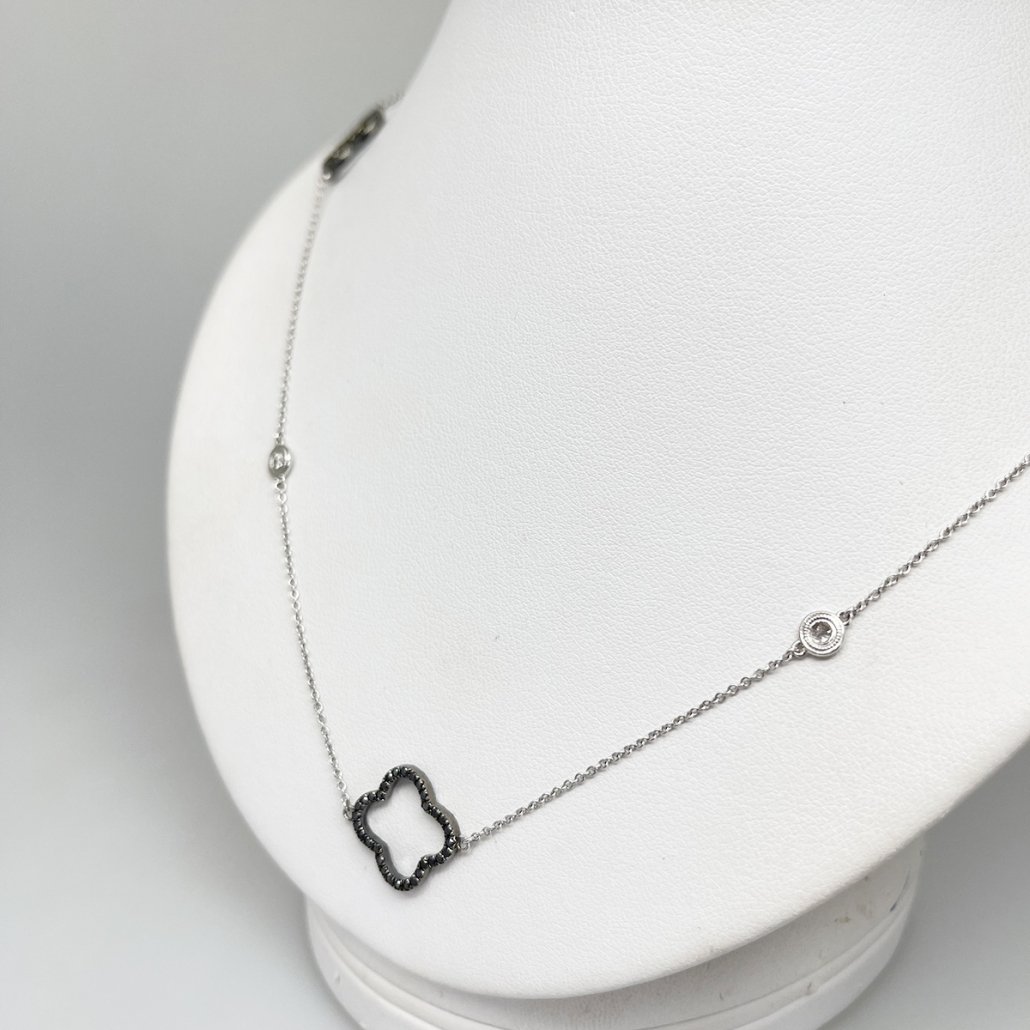 Black diamond trefoils with white bezel set diamonds create an opera length chain that goes with everything in your closet!