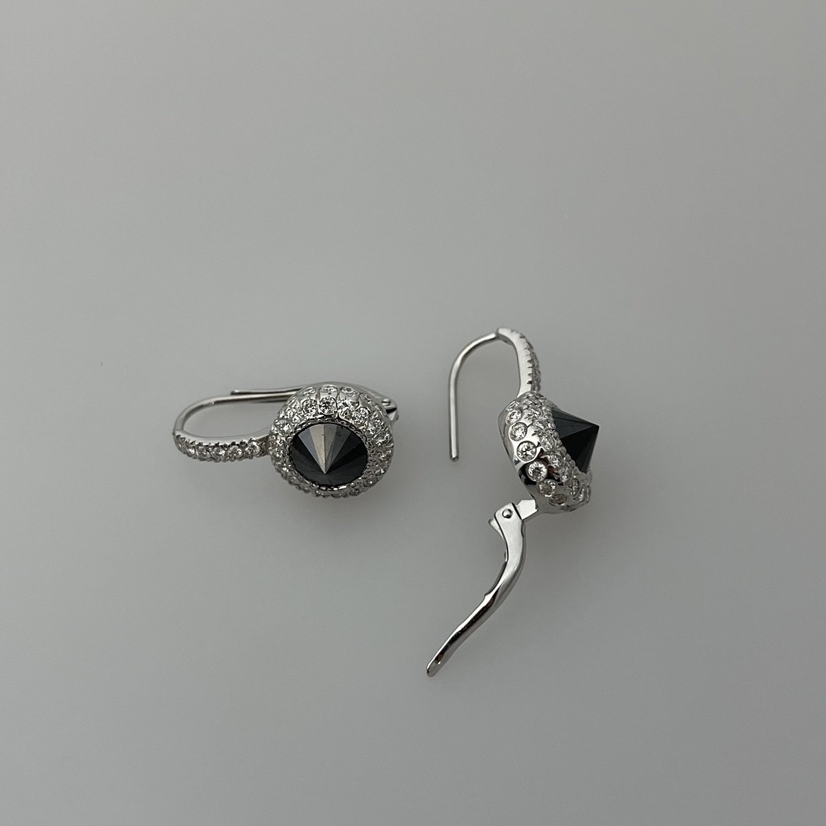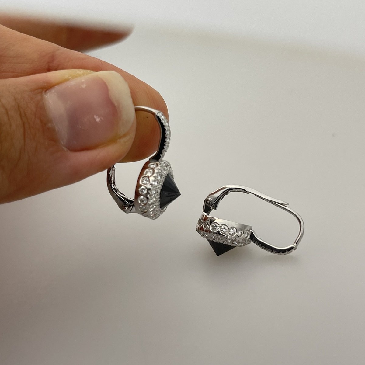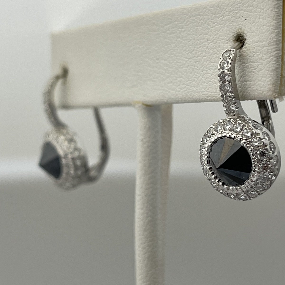 These custom made diamond drop earrings. feature black natural diamonds that are set culet up, or point facing up!