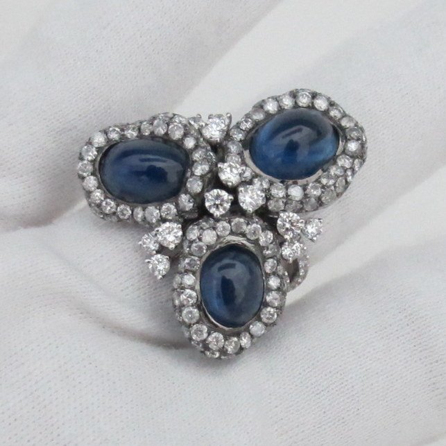 This ring is 18k white gold and weighs 13.50 grams. It contains three large natural oval cabachon blue sapphires and 3.76 carats of natural diamonds.