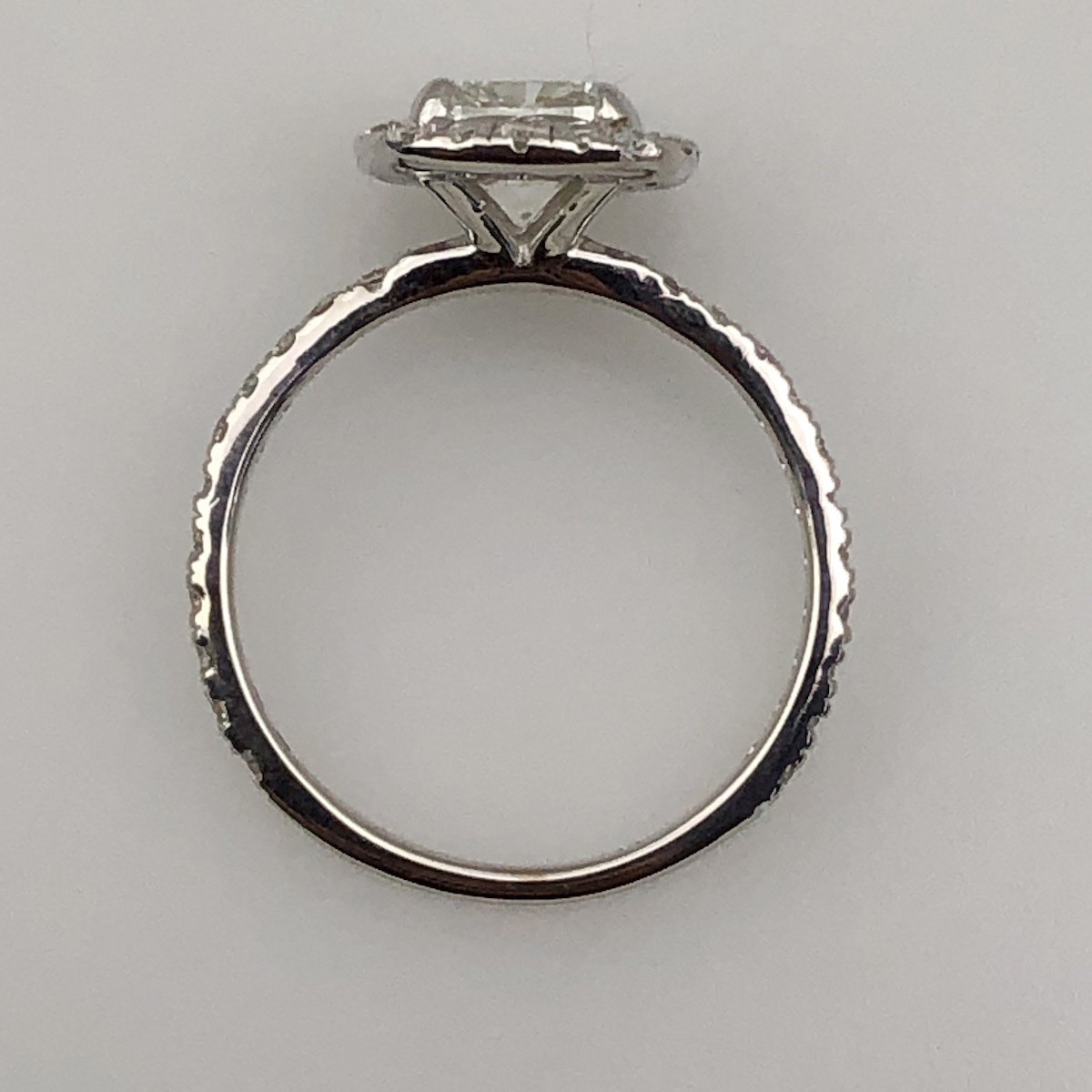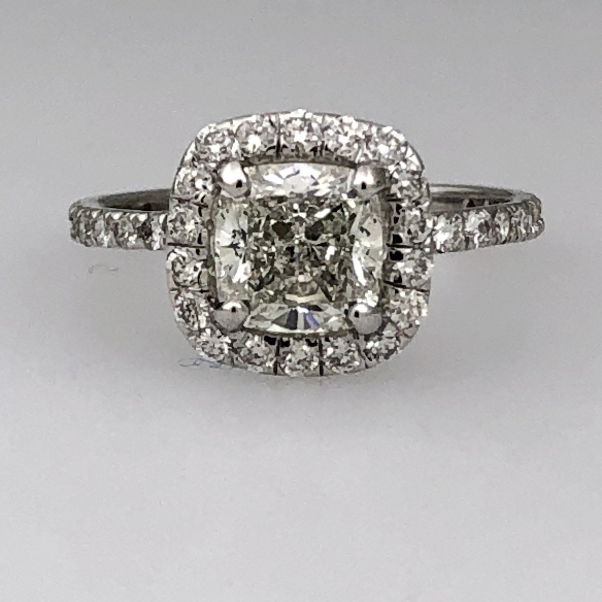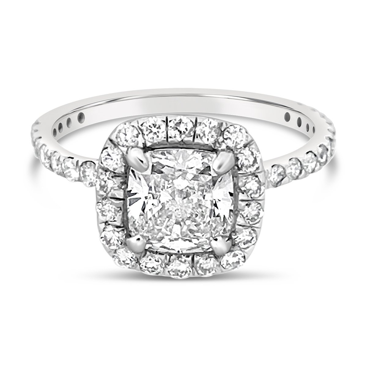 14K White Gold Diamond Engagement Ring; features a cushion cut GIA certified diamond surrounded in a halo of round brilliants, with a diamond set shank.