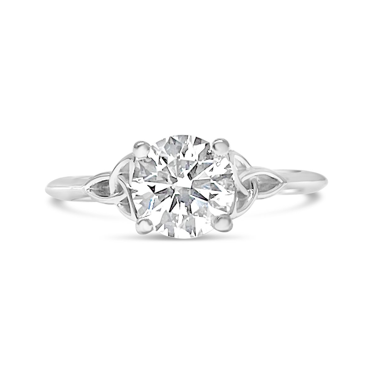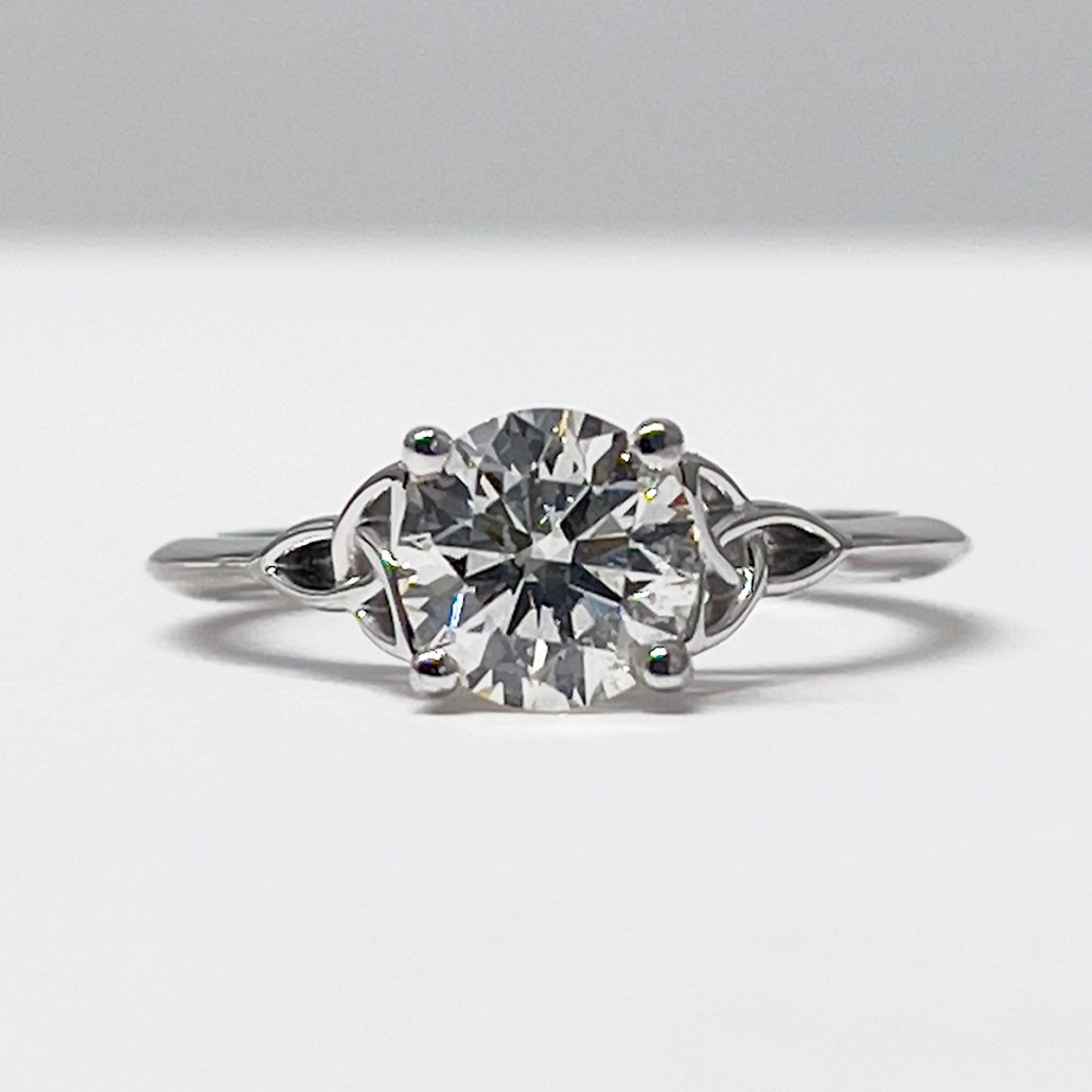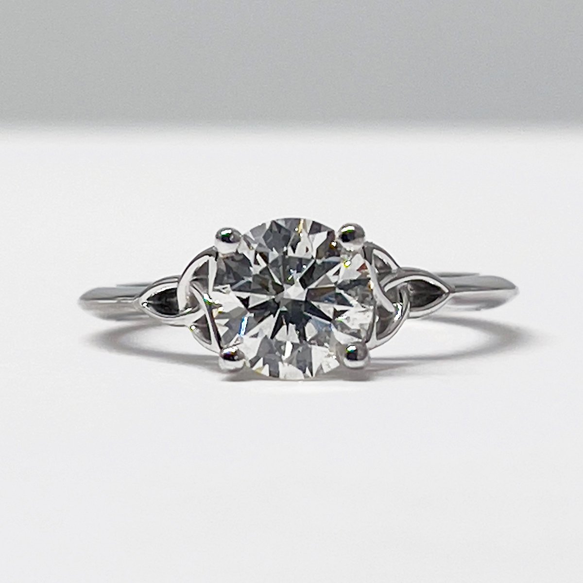 Natural round brilliant diamond set in four prongs. Celtic knots sit under the diamond in this unique ring.