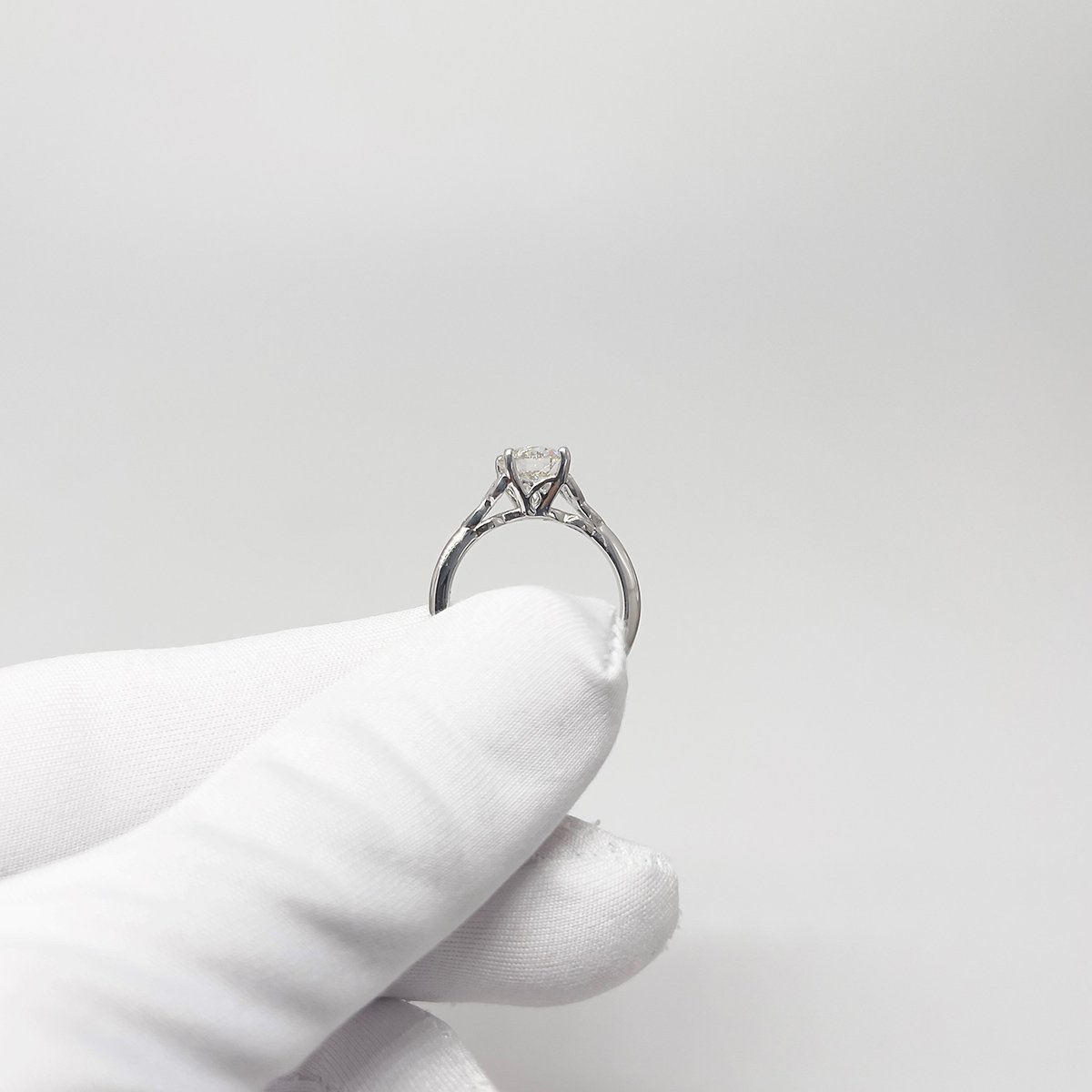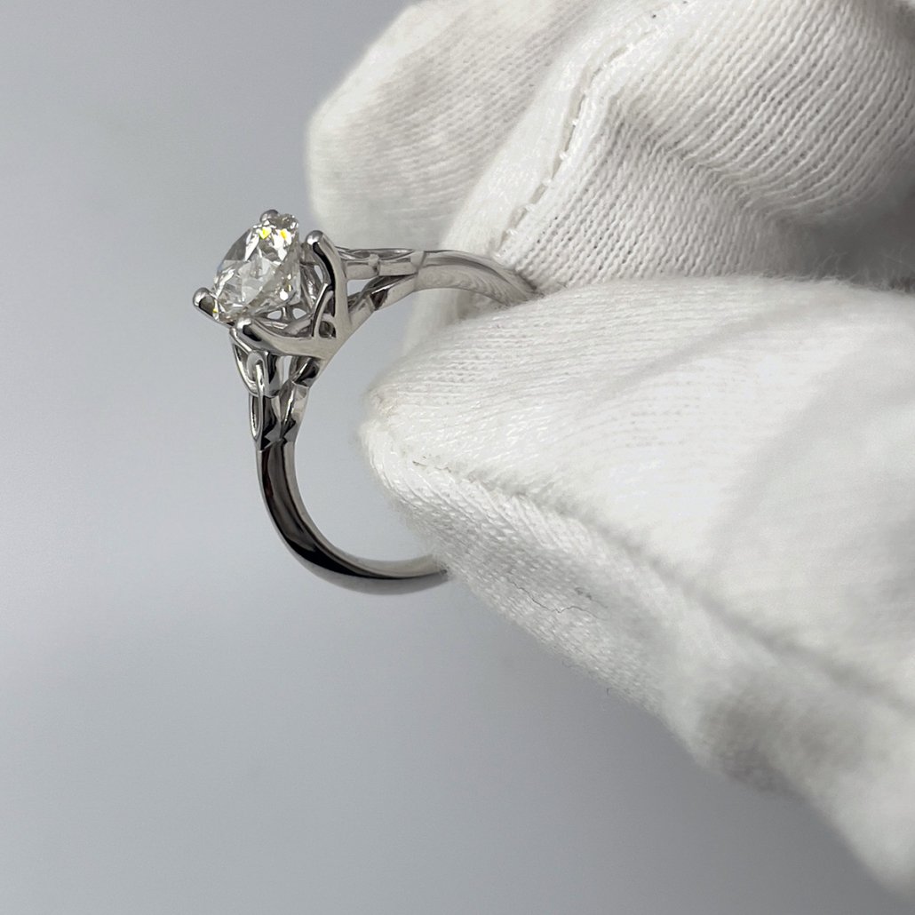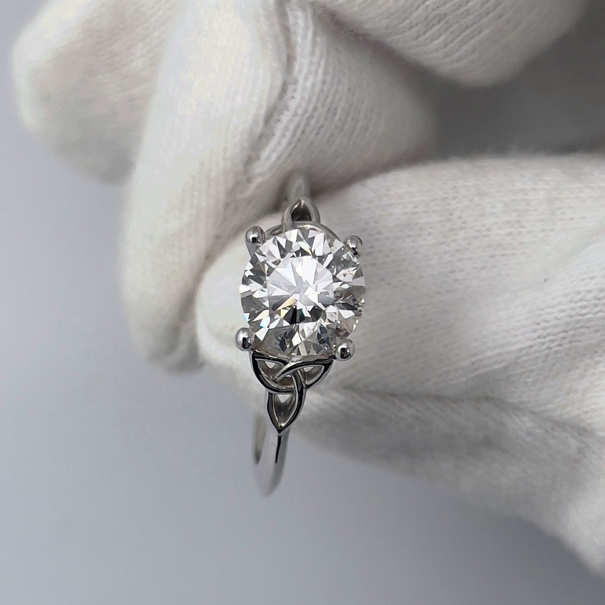 Natural round brilliant diamond set in four prongs. Celtic knots sit under the diamond in this unique ring.