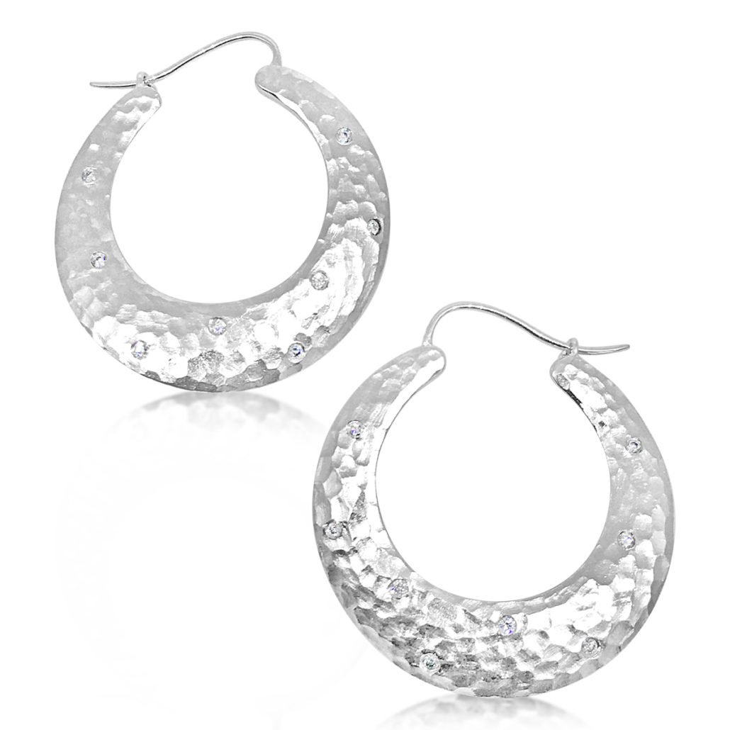These hoop earrings have a round con caved shape and hammered finish. They contain sixteen natural round brilliant diamonds that are burnish set randomly around the hoop. The diamonds have a combined total weight of .25cts. The diamonds are H color and I1 clarity. There is a left and right.