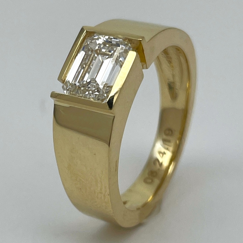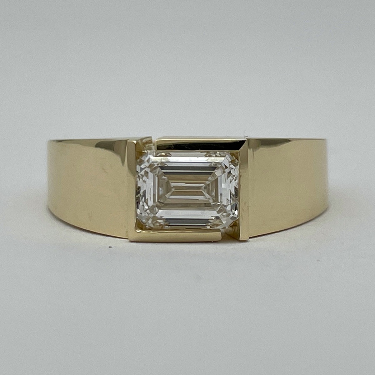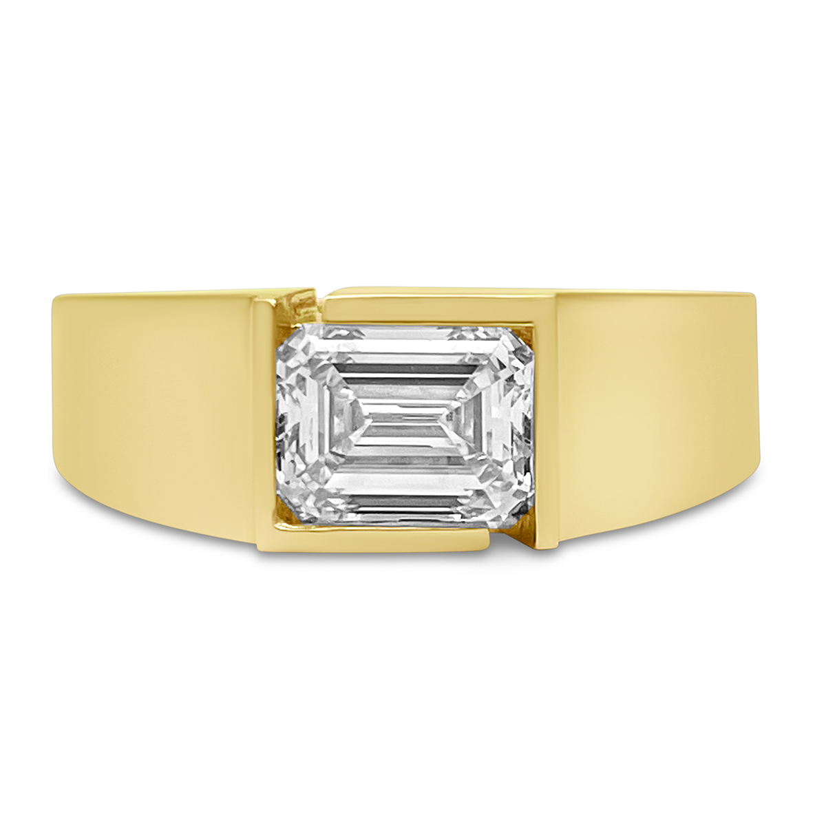 A statement of confidence and clarity, this ring features a striking emerald-cut diamond embraced by a sleek, geometric bezel in polished yellow gold.