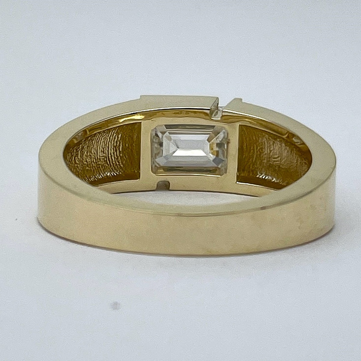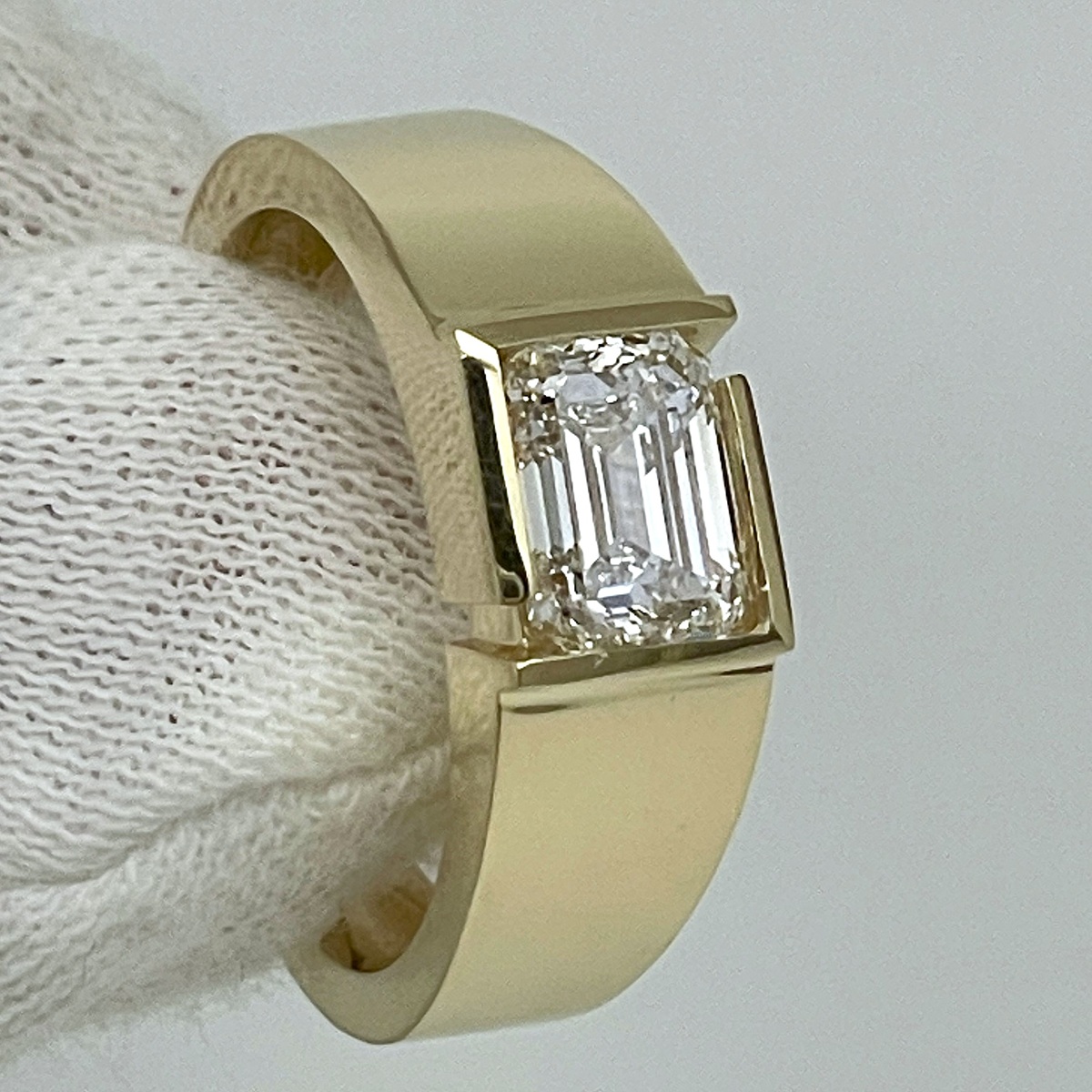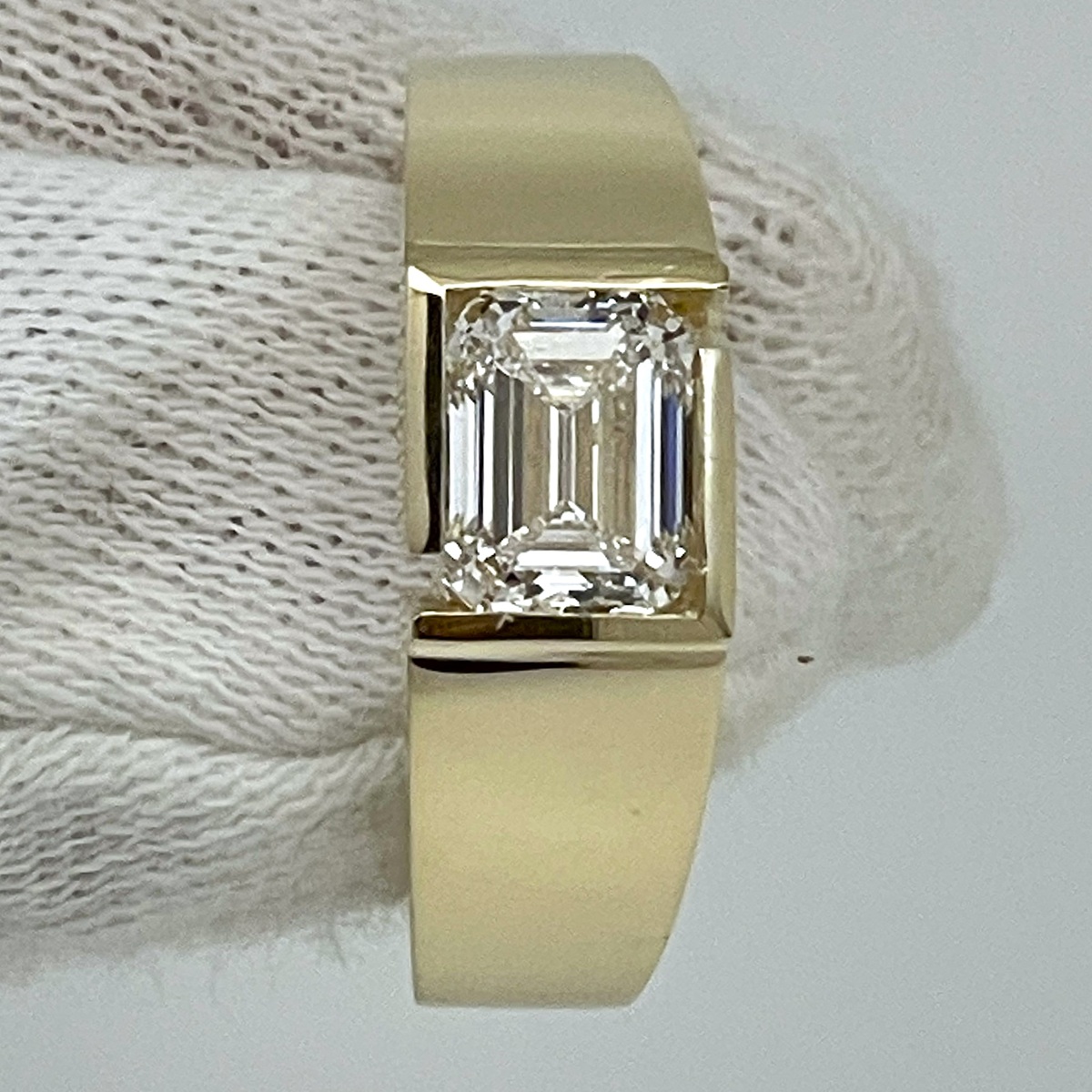 A statement of confidence and clarity, this ring features a striking emerald-cut diamond embraced by a sleek, geometric bezel in polished yellow gold.