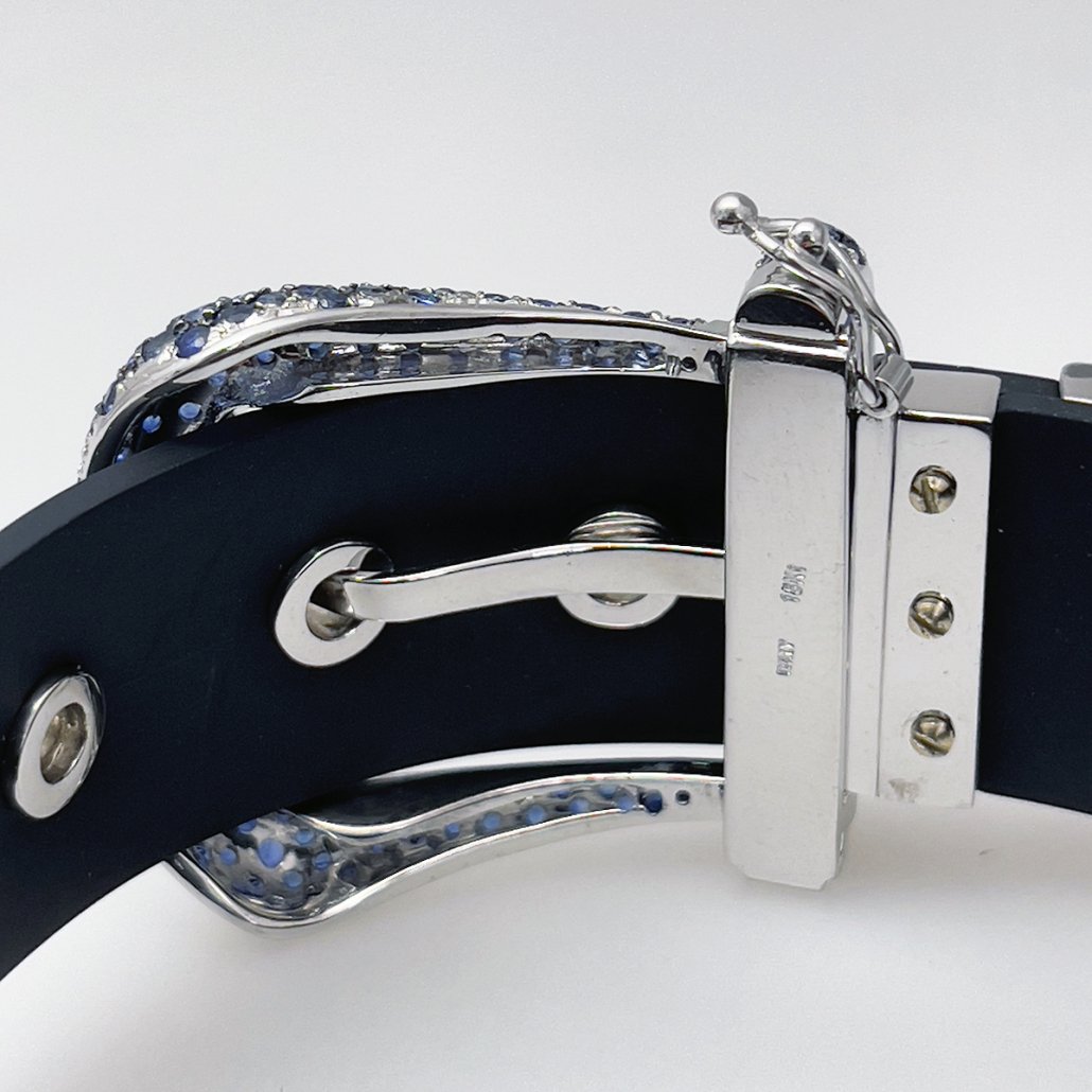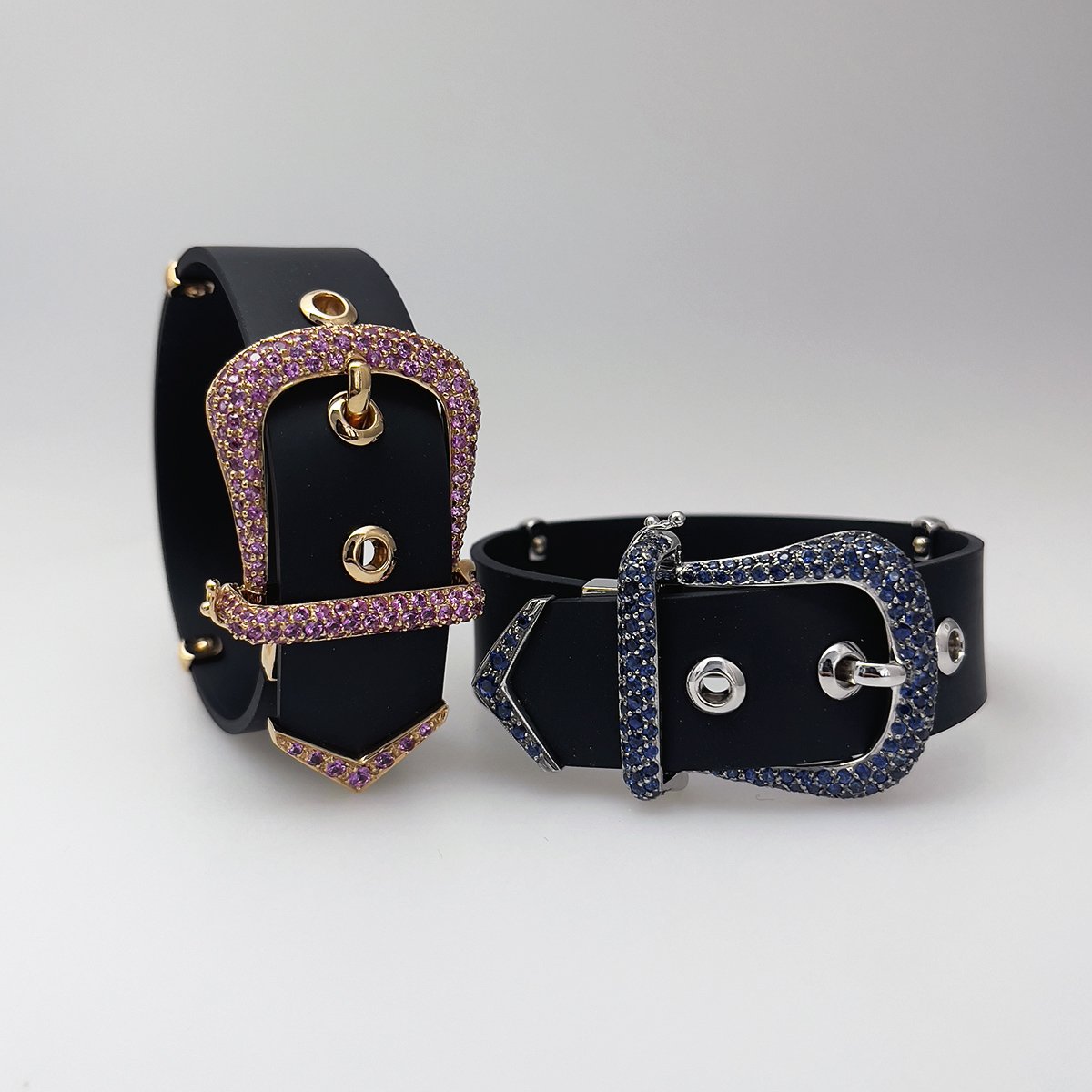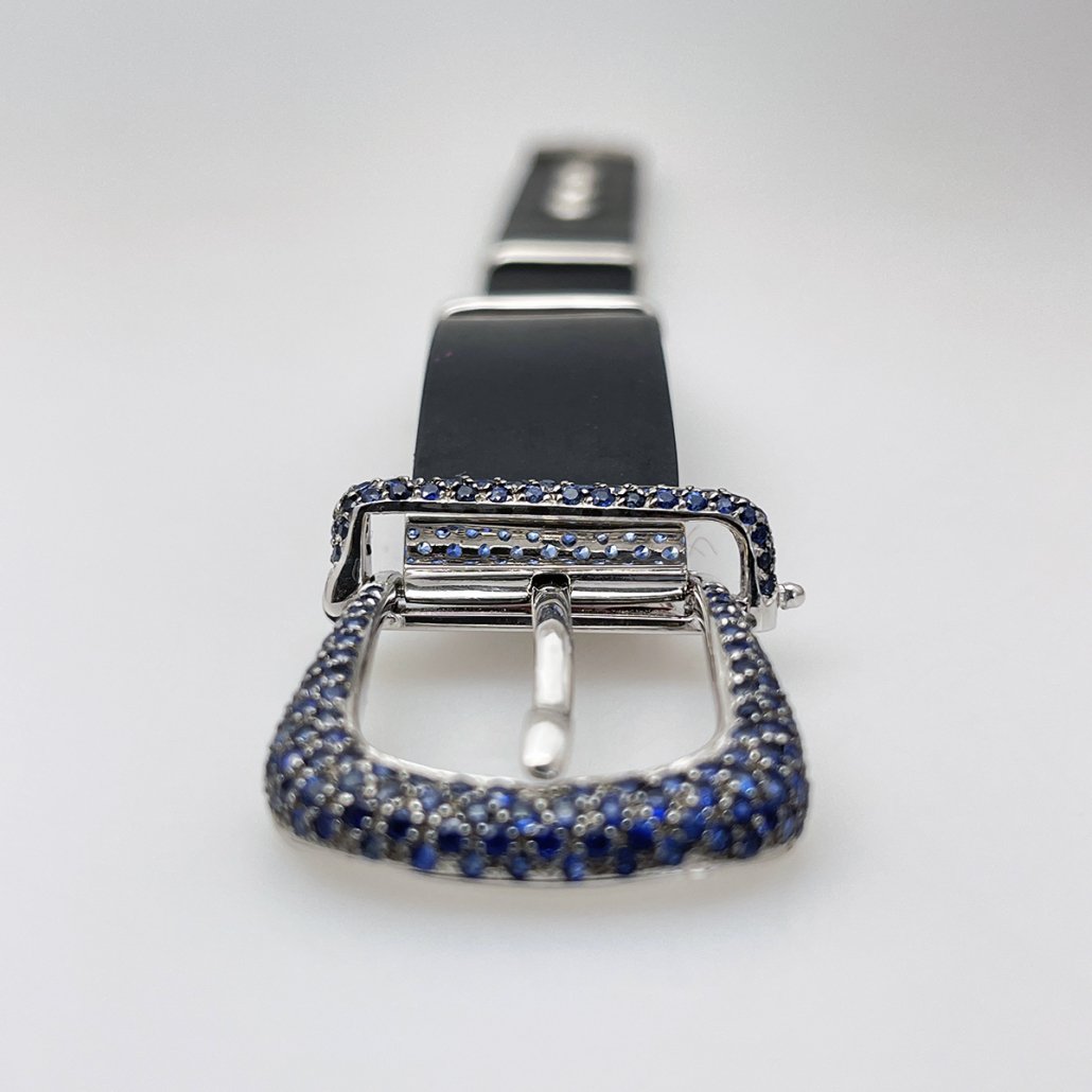 Contemporary, trend-setting design sets this sapphire encrusted buckle bracelet apart from the rest! Available in Pink or Blue Sapphires, with Pink or White Gold.