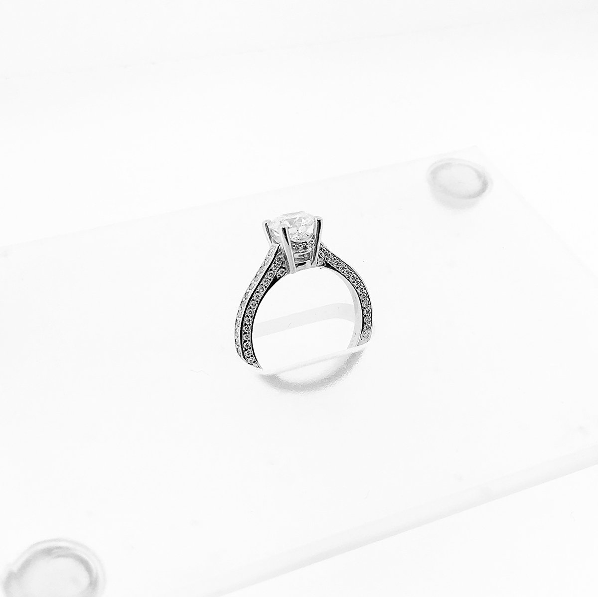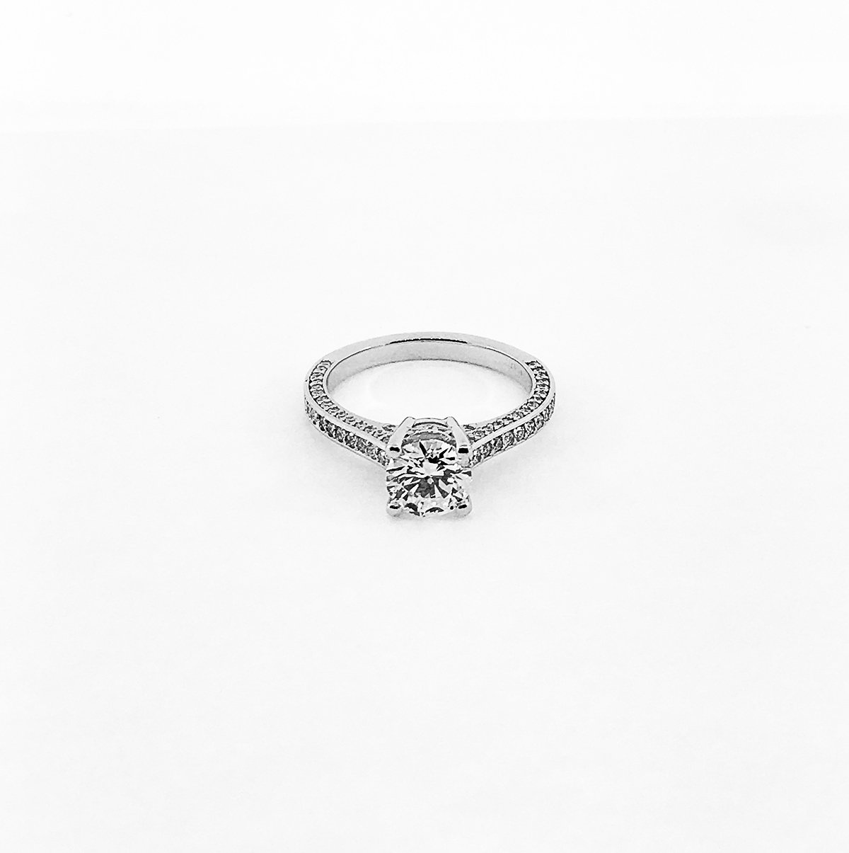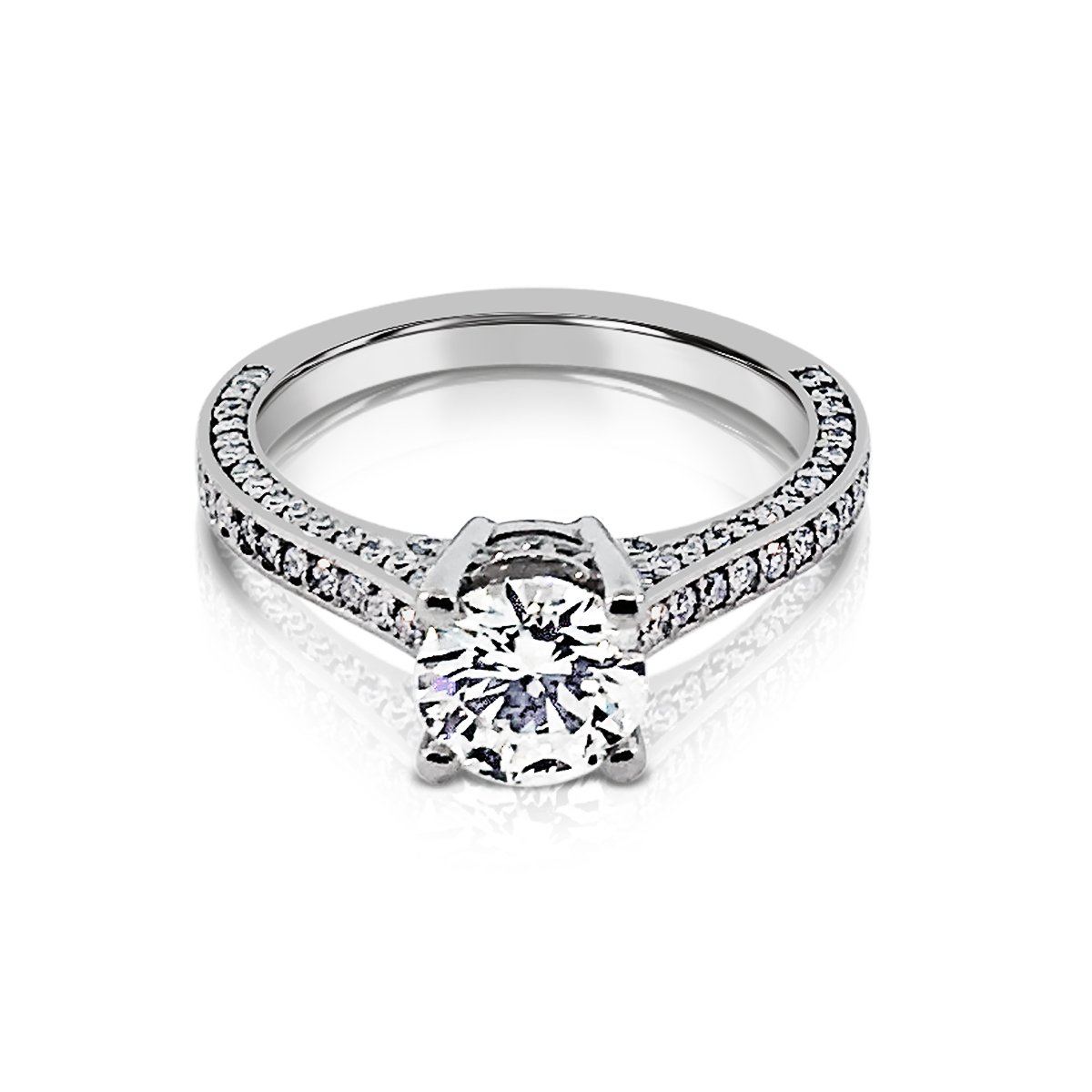 This engagement ring is made of platinum and showcases a 1.04 carat natural round brilliant diamond. 96 additional diamonds are prong set on either side of the shank, and also on the top.