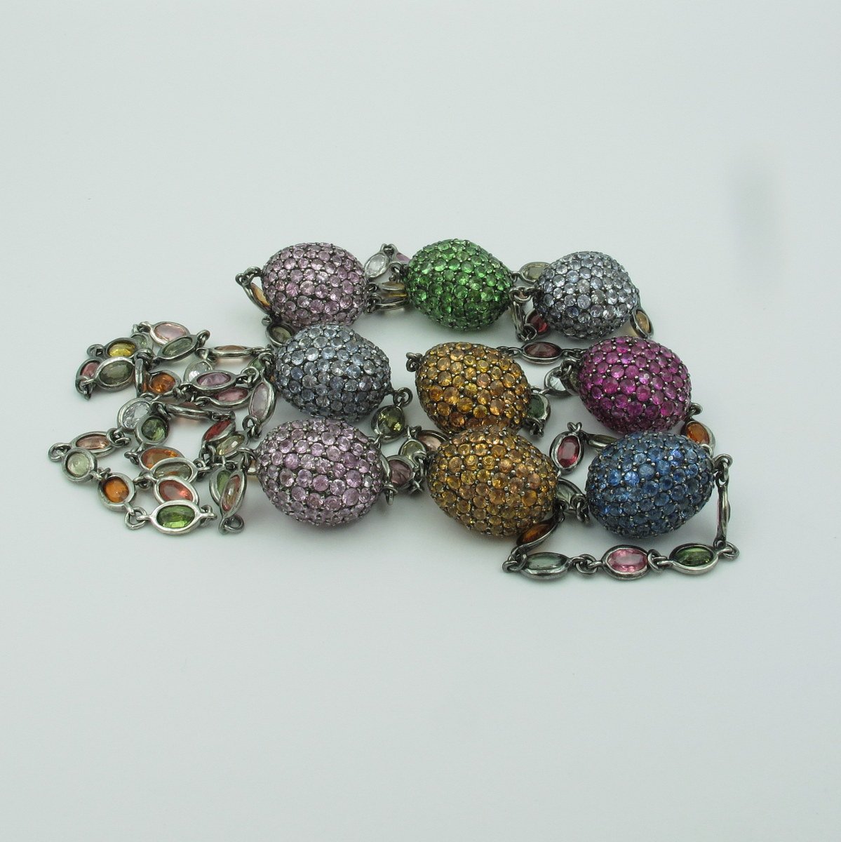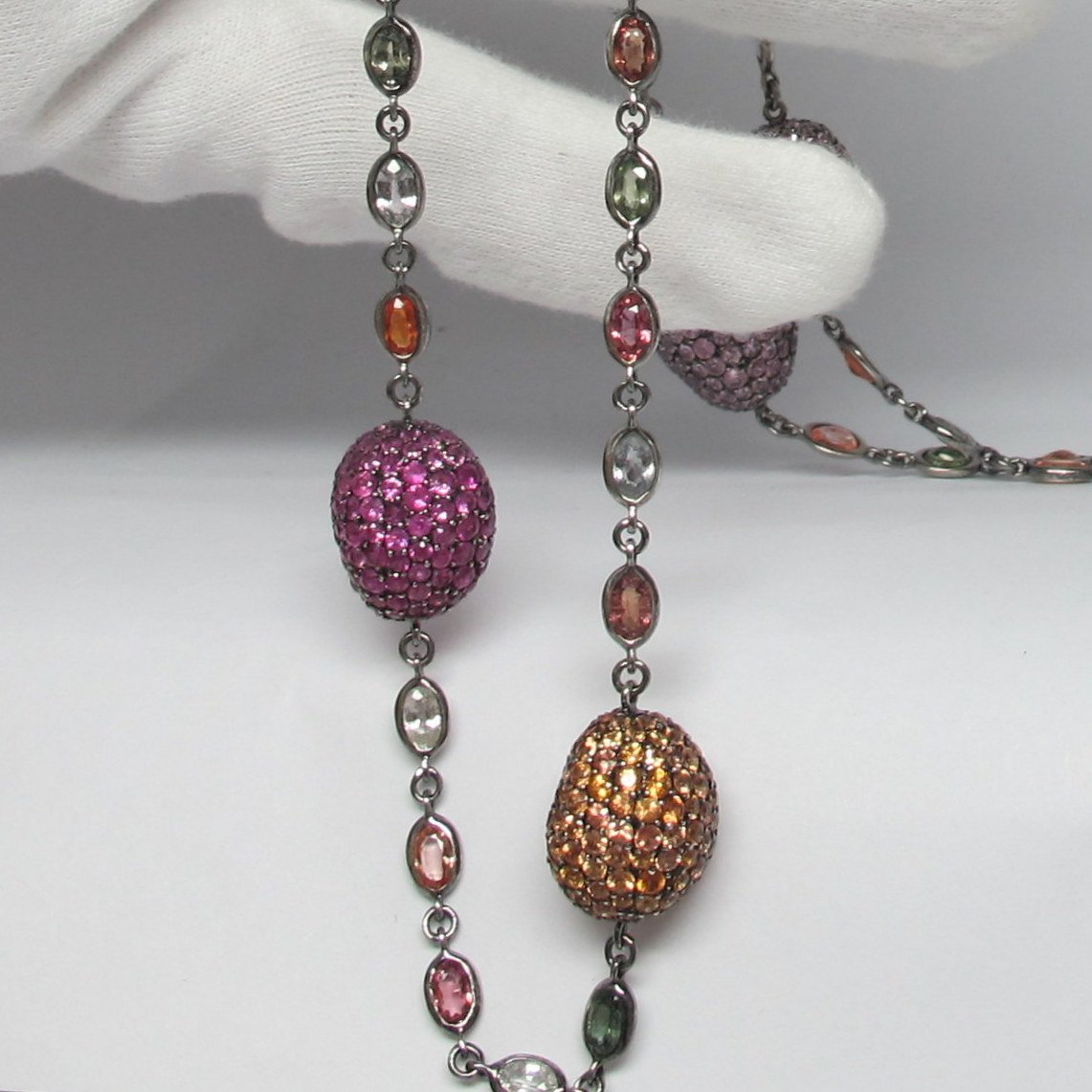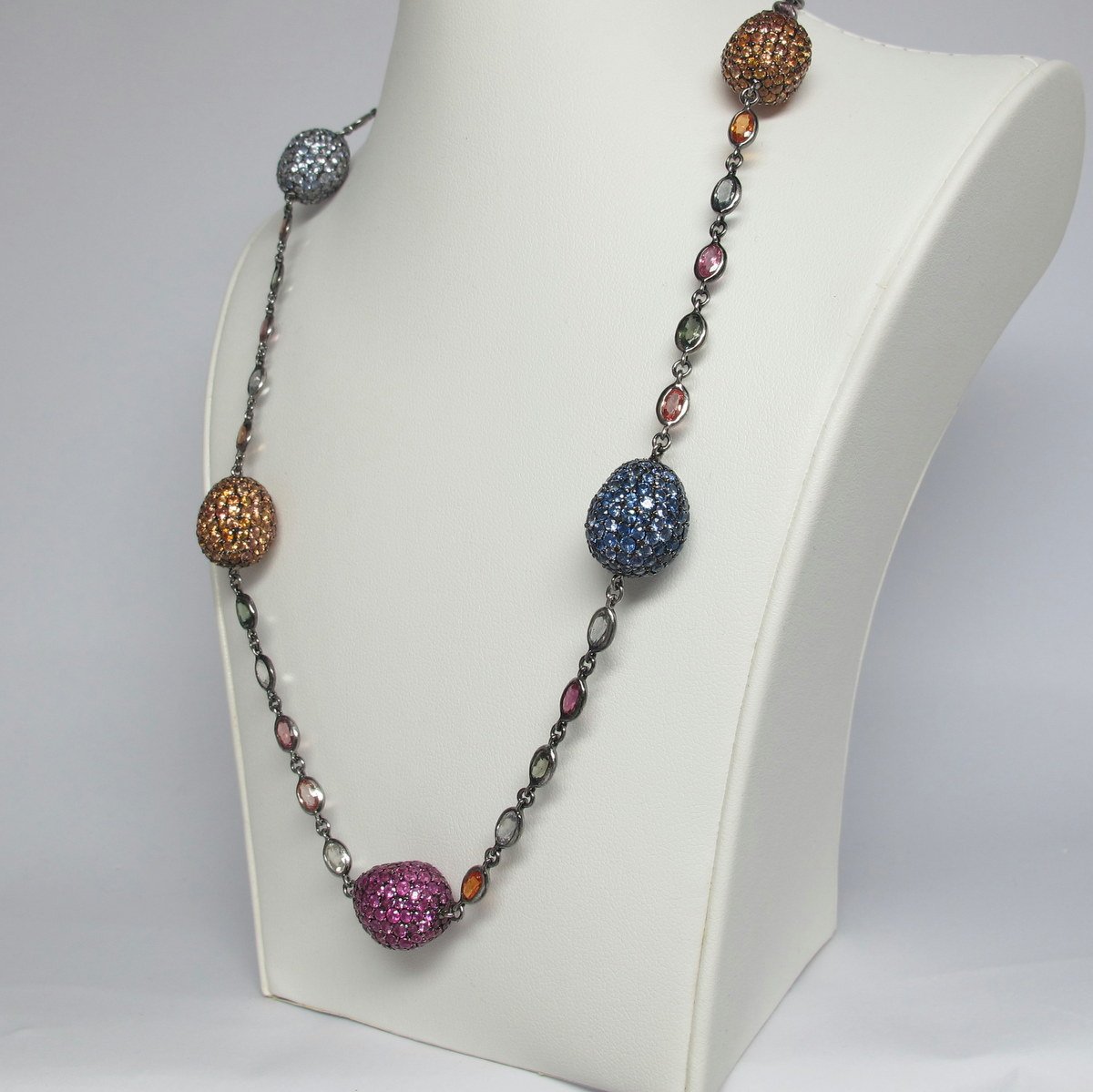 This necklace is 18k white gold with selection of natural rainbow colored sapphires. The sapphires grouped by color in nine spheres and then throughout the necklace in 5×3 oval 5×3 shapes. Each oval is bezel set on the chain. The necklace has a combined total weight of 55 carats. The metal is plated with black rhodium.