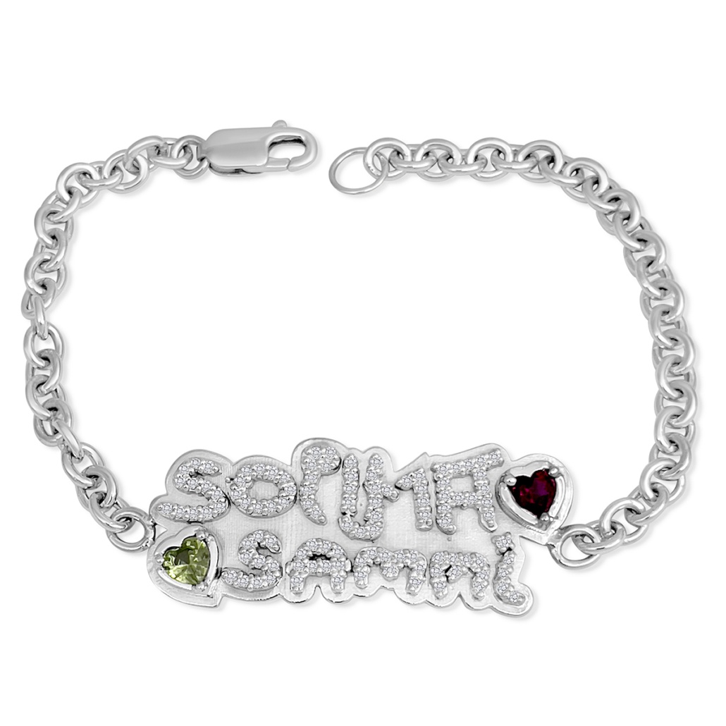 This beautiful and heartwarming bracelet is made with 14k white gold and natural round brilliant diamonds. Next to the children names their birthstones, garnet and peridot. The birthstones are bezel set heartshapes.