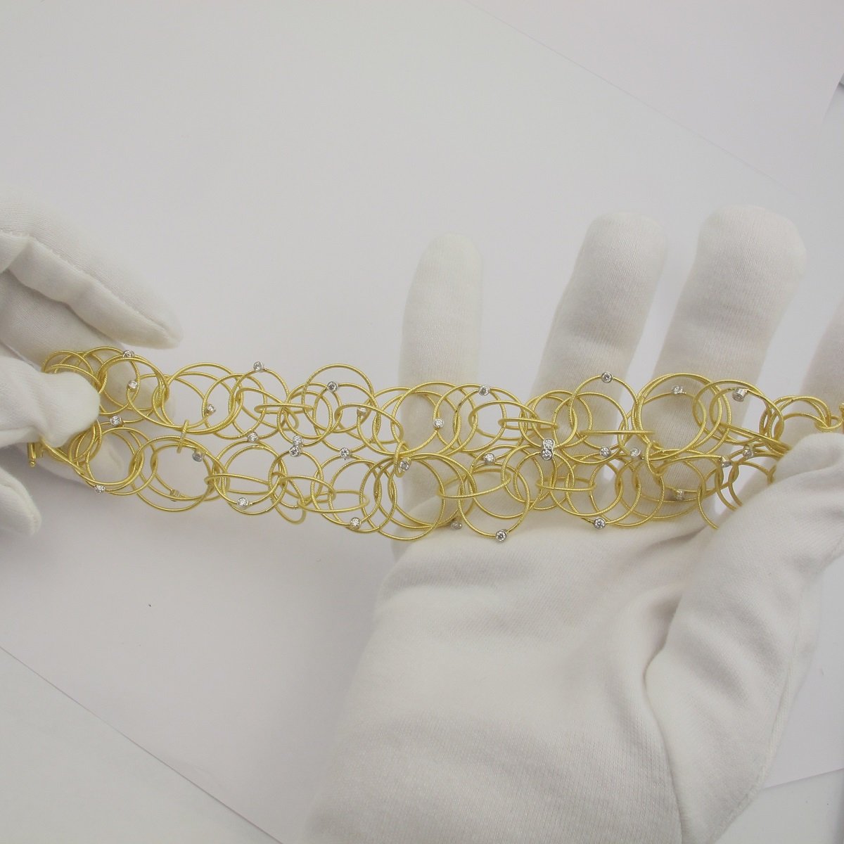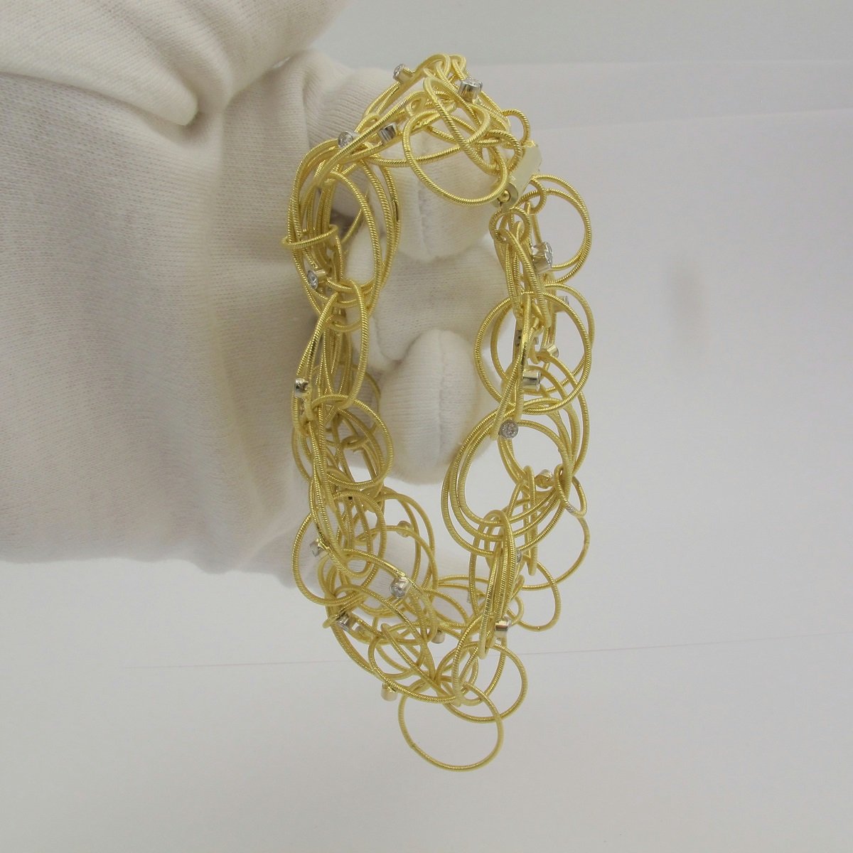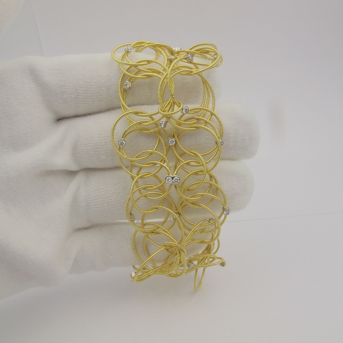 This 18k yellow gold multi-circle design features links that appear to be wrapped in fine gold thread and bezel set natural round brilliant diamonds. There is a silky texture to the design. Hand-made in Italy!