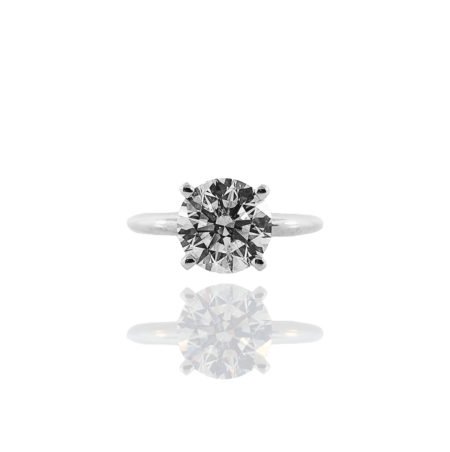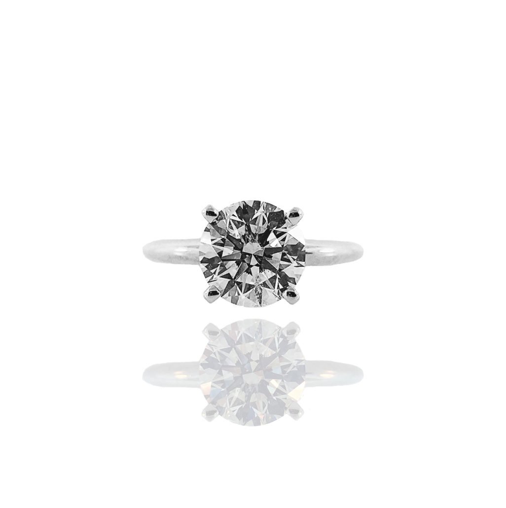 This engagement ring is 95% platinum, 5% iridium and weighs 5.75 grams.  The ring design is a 4 prong knife edge solitaire. The ring is holding a natural round brilliant diamond that weighs 2.33 carats. The diamond is GIA certified and has a color grade of I and a clarity grade of SI2. The cut, polish and symmetry are excellent.