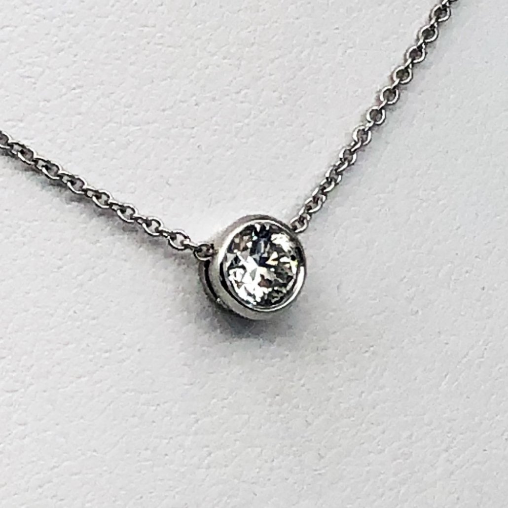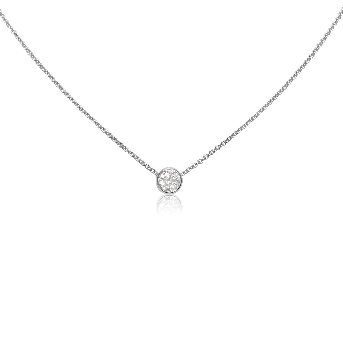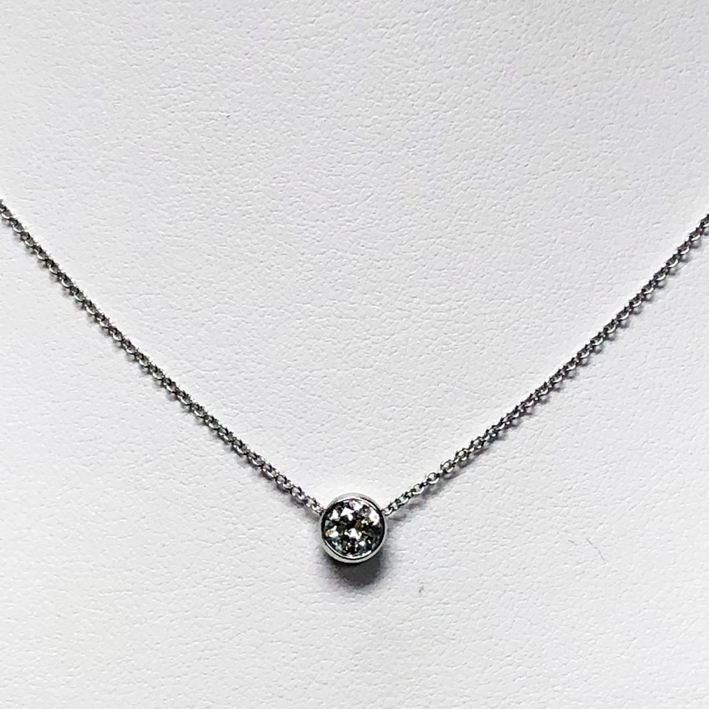 This diamond brings contemporary elegance to her neckline – 14K White Gold bezel setting suspended from an 18″ white gold cable link chain.