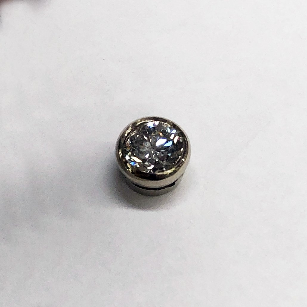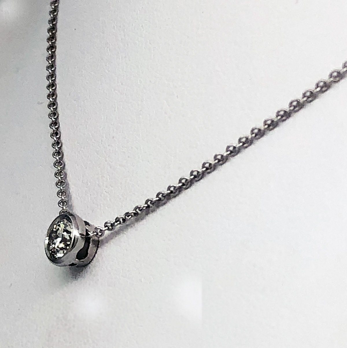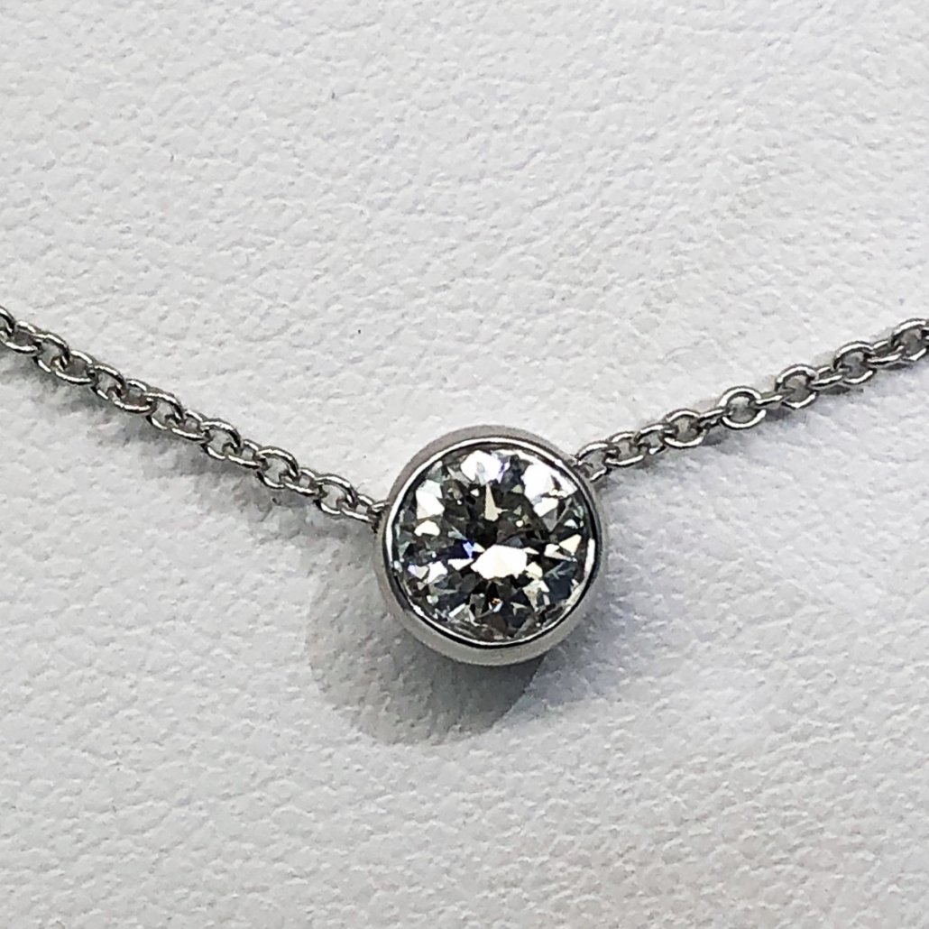 This diamond brings contemporary elegance to her neckline – 14K White Gold bezel setting suspended from an 18″ white gold cable link chain.