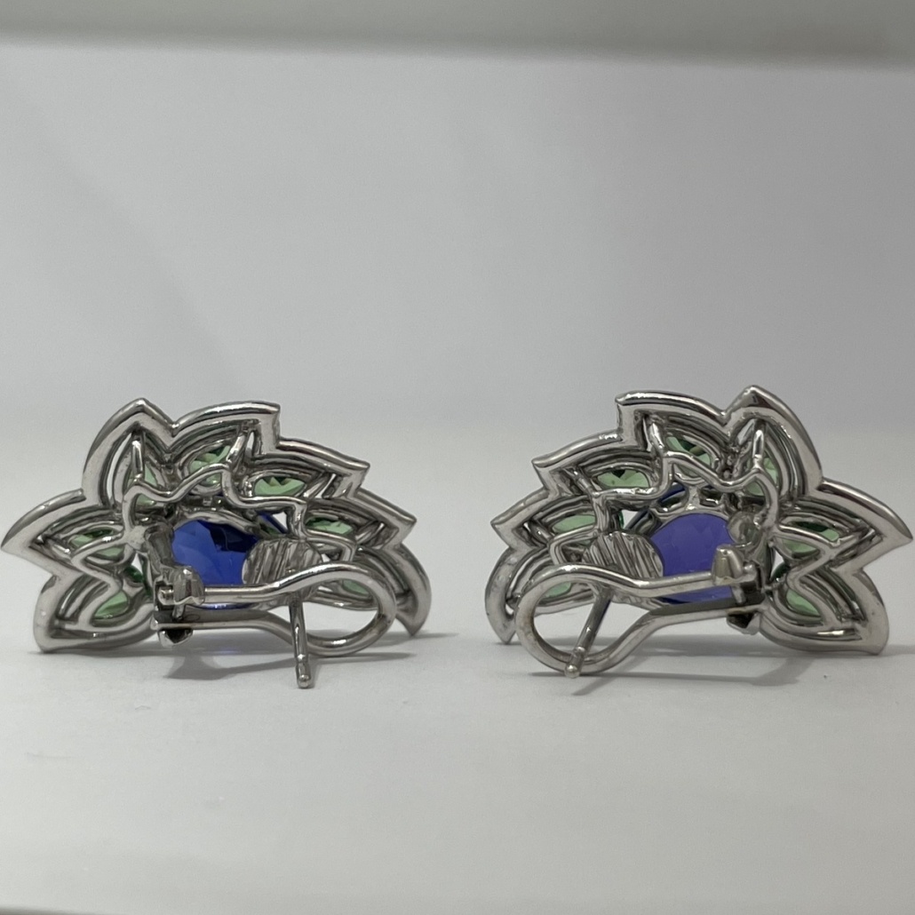 These rare design earrings are made with 18k white gold prong set with natural pear shape tanzanite, natural round brilliant diamonds, and natural round green garnets. The earrings have hidden prong set diamonds in the back with custom made open air line wires. The earrings are secured by omega locks.