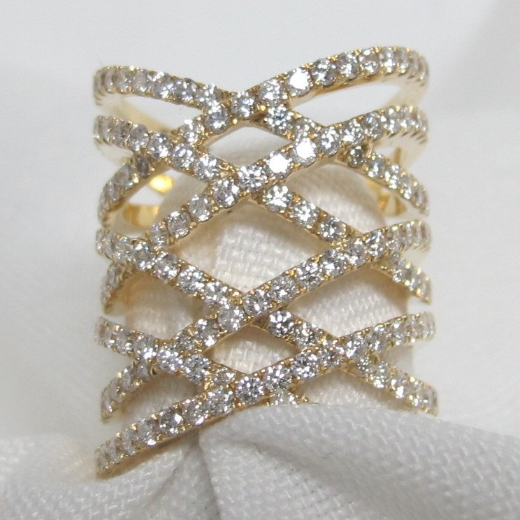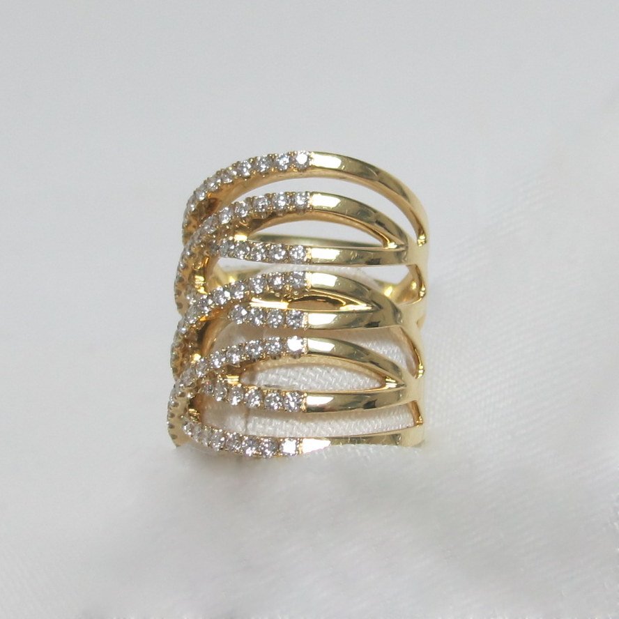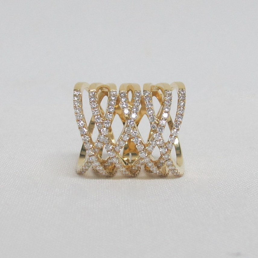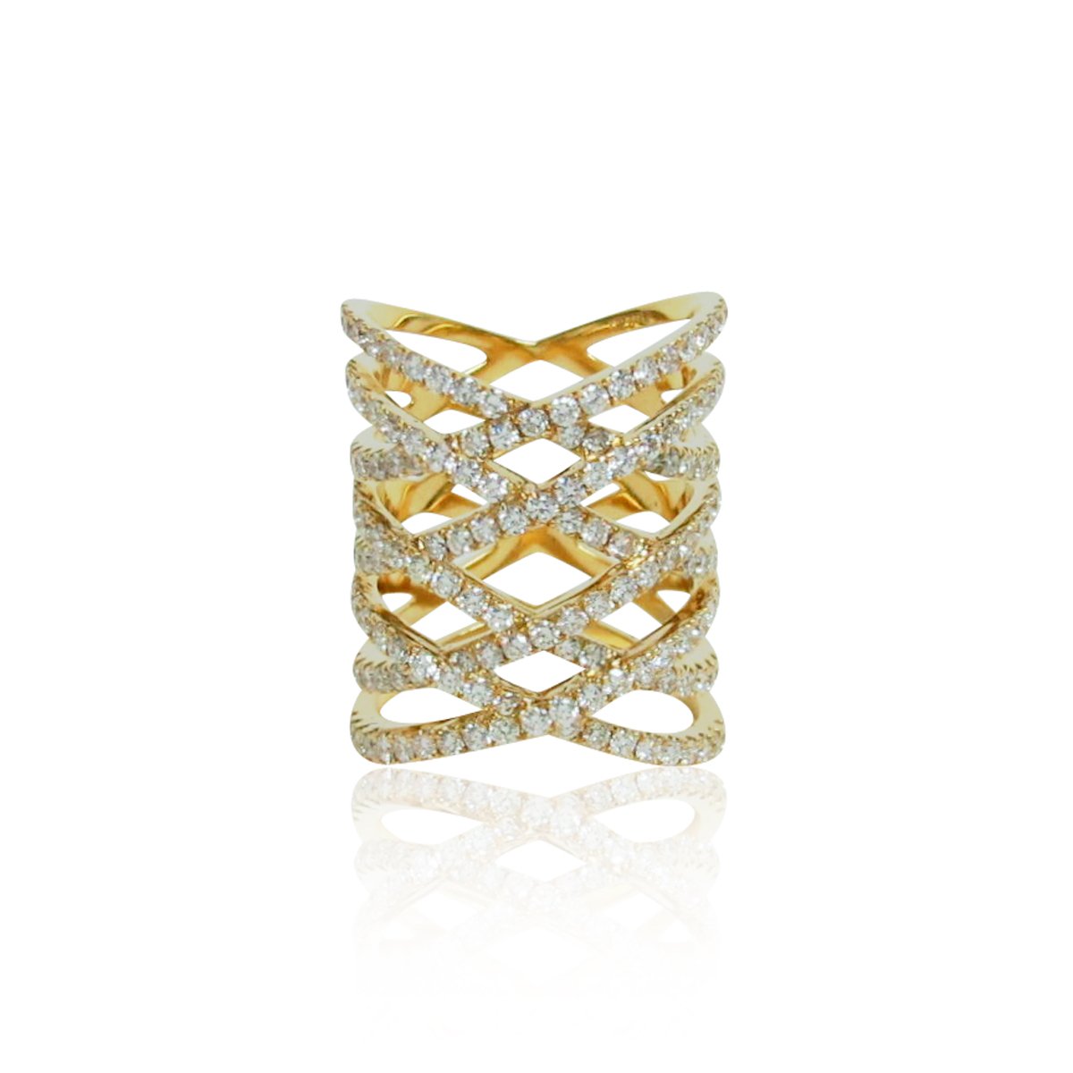 8 bands cross over and under one another with diamonds set in warm yellow gold.