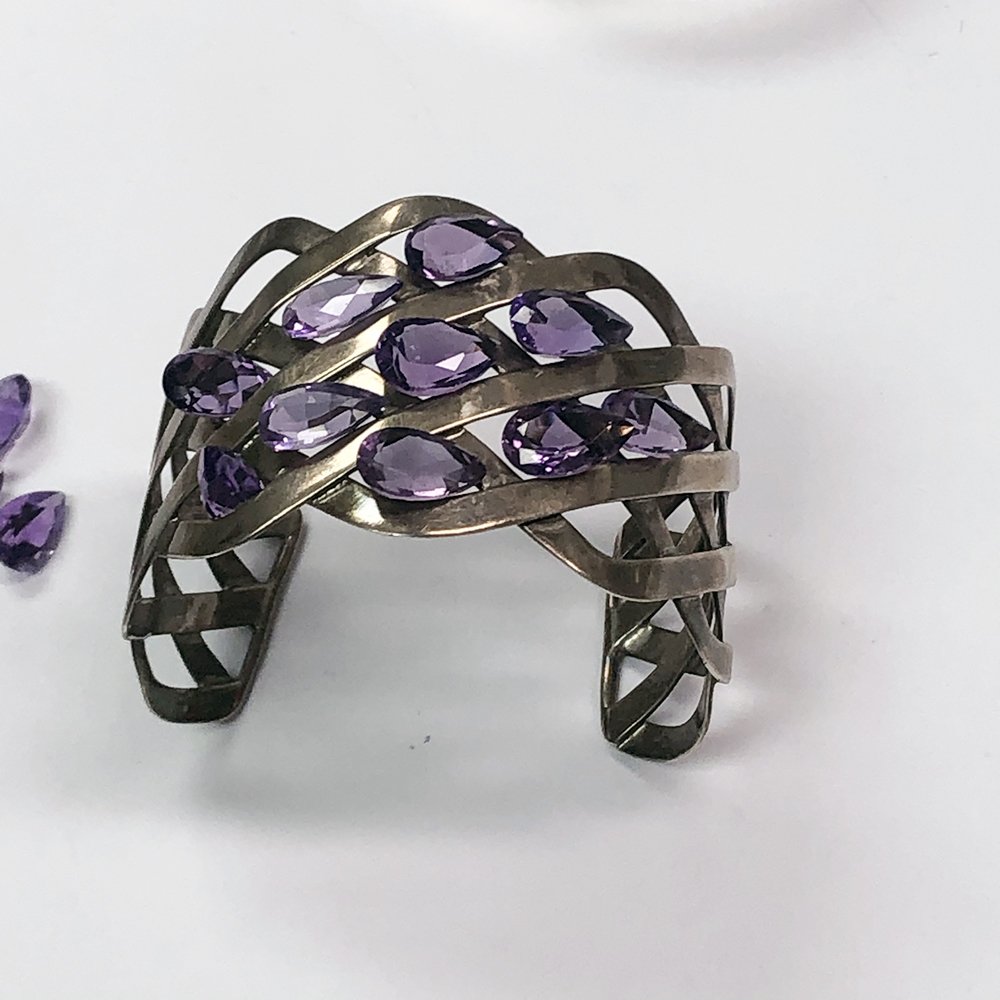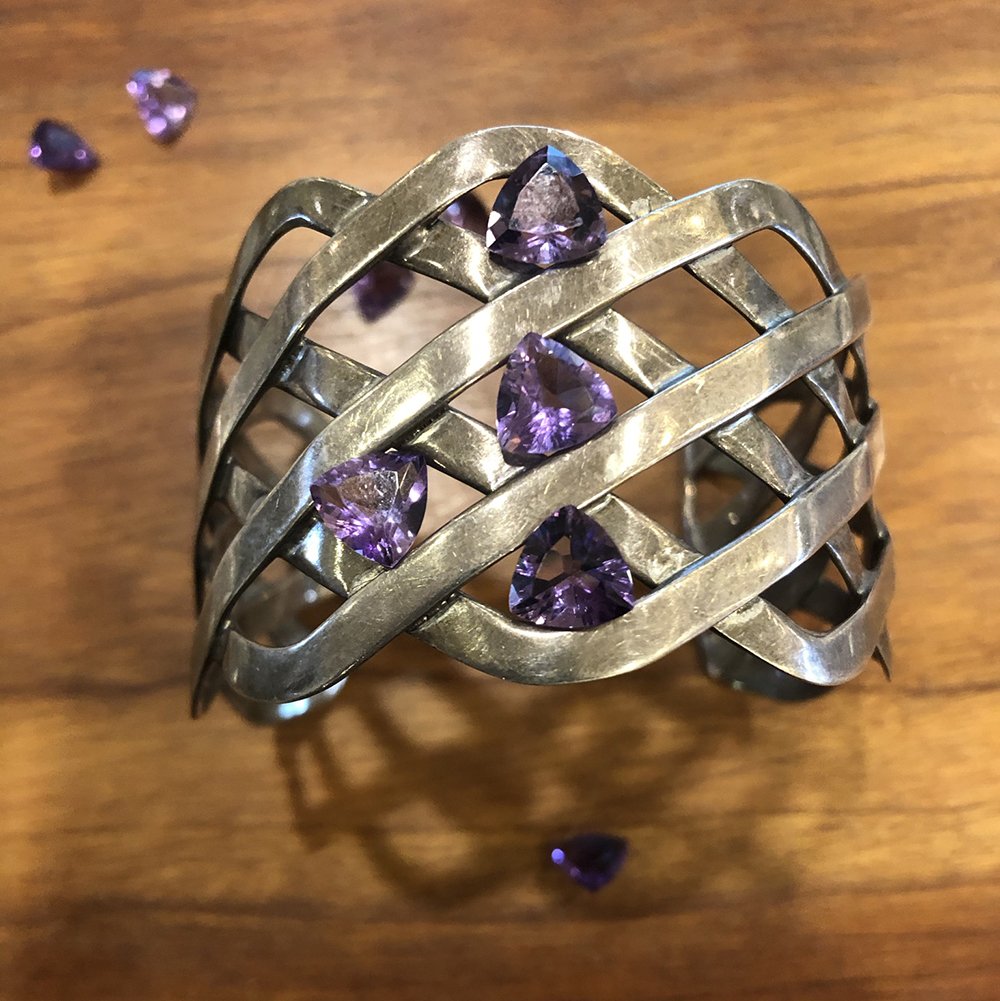 Translucent purple amethysts provide a delicate balance when set into this strong geometric hammered silver cuff bracelet.