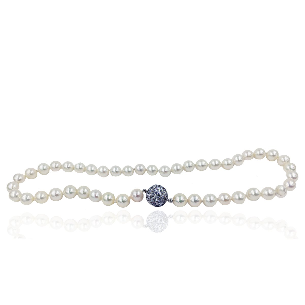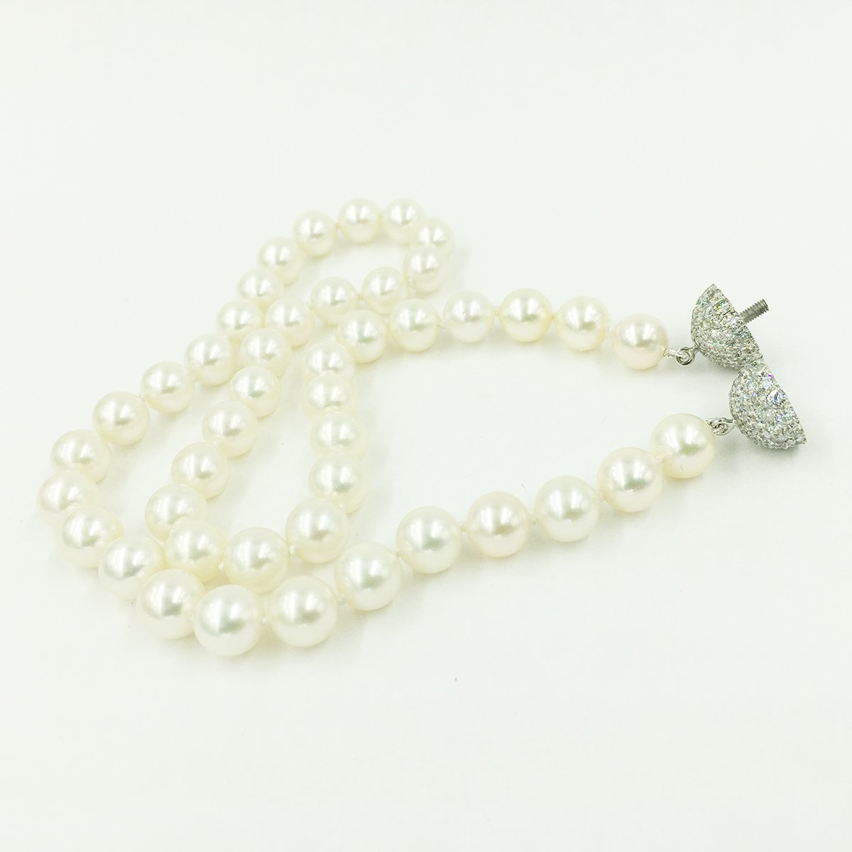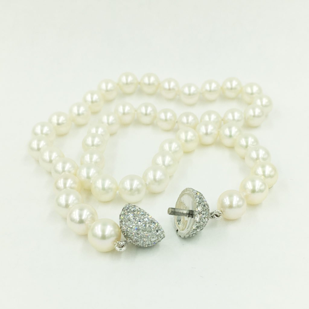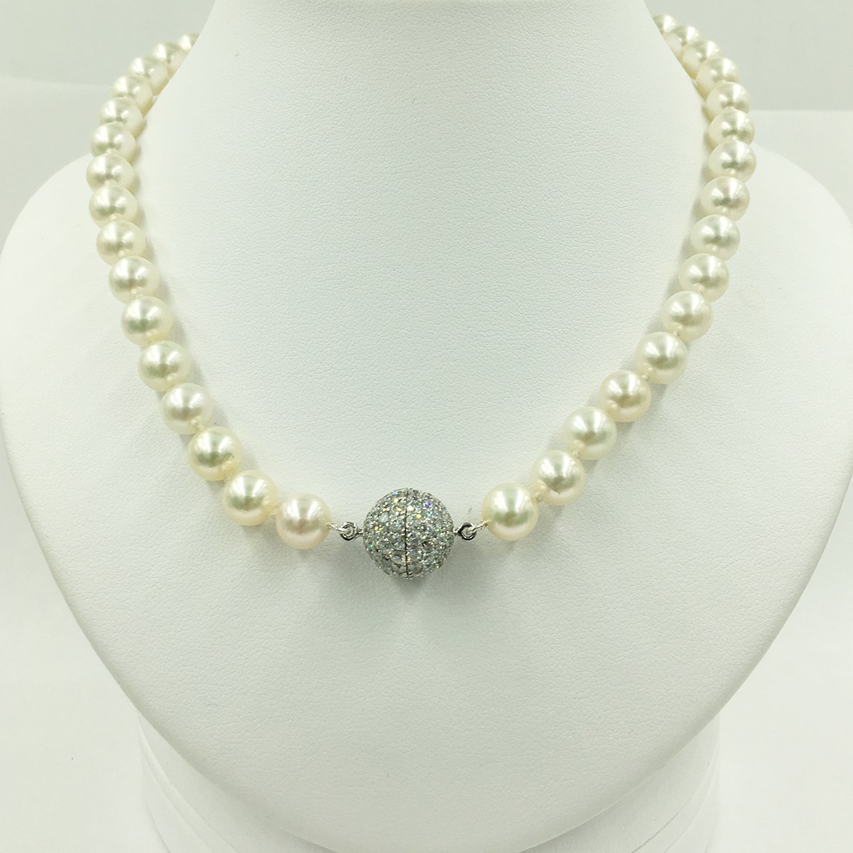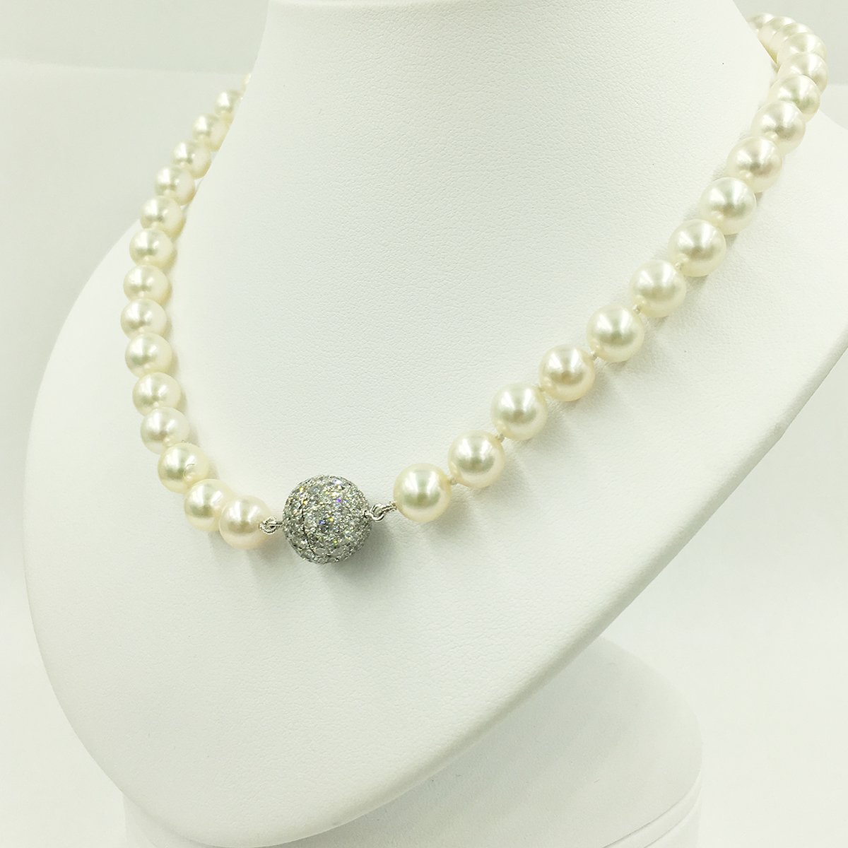Akoya cultured pearl choker with diamond ball clasp. Simple yet fancy.