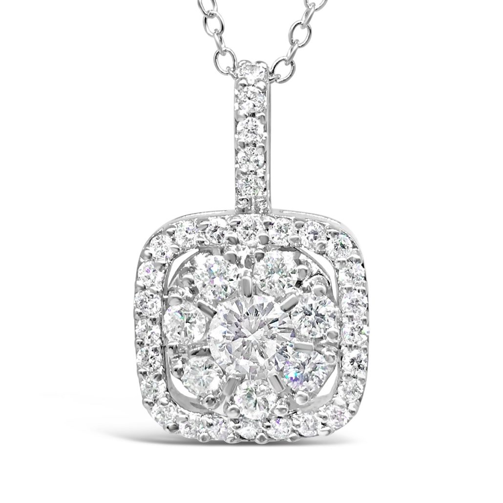 This diamond pendant has a cluster of round diamonds set inside square diamond frame. There are thirty seven natural round brilliant diamonds that have a combined total weight of 1.50 carats. The diamonds are H color and I1 clarity. They are prong set in a circle design and in a square design.
