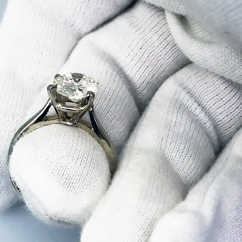 A 14K white gold diamond solitaire engagement ring, with the diamond set in a four prong cathedral mounting.