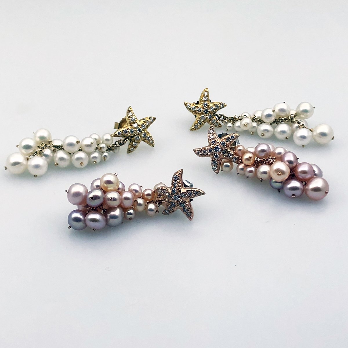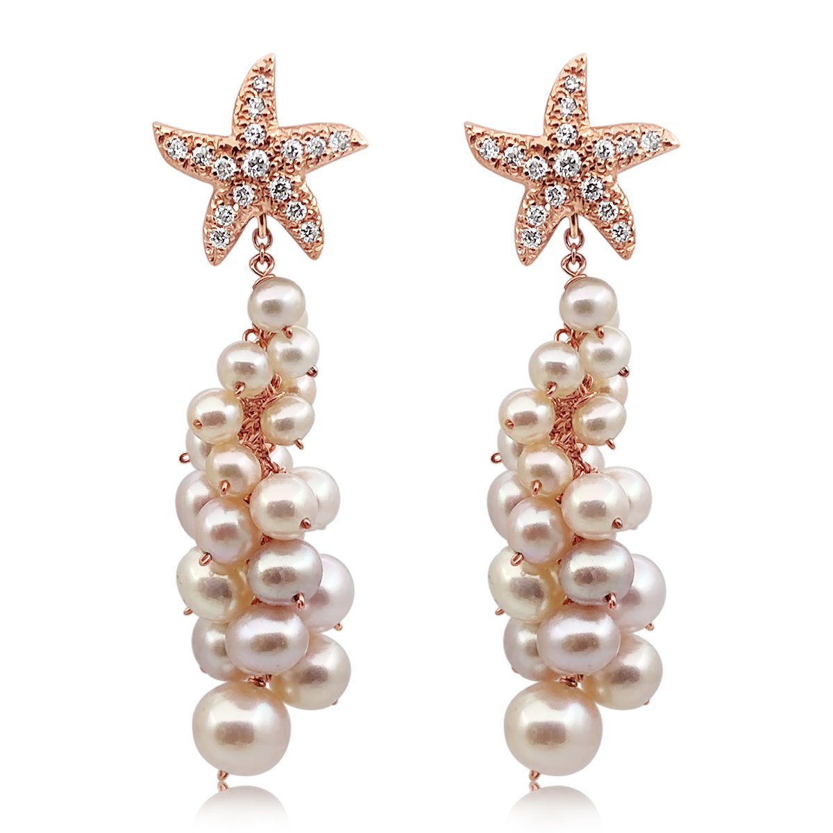 Hand Crafted Pearl Cluster suspended from Diamond Set Starfish Earrings – Every Piece Is Unique!