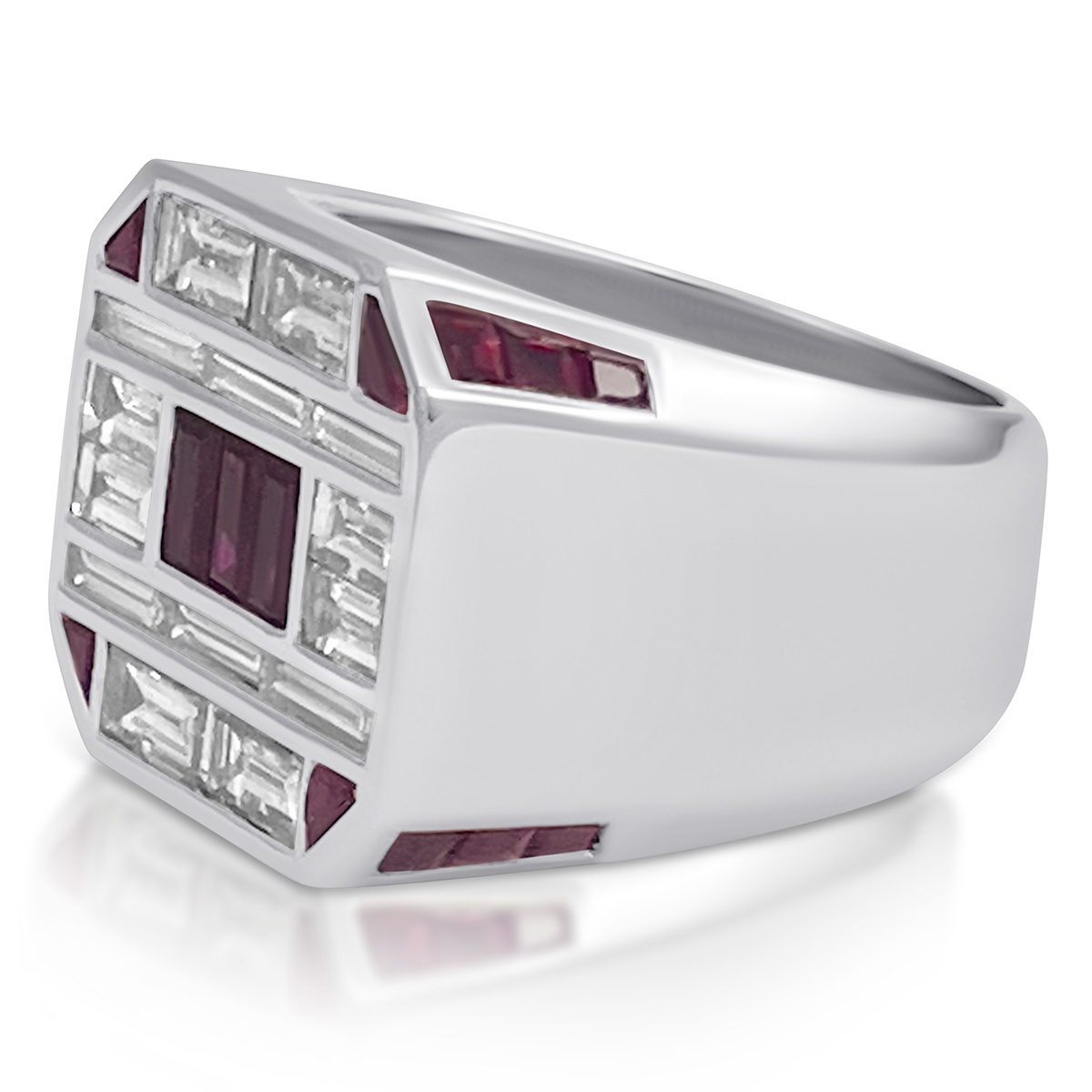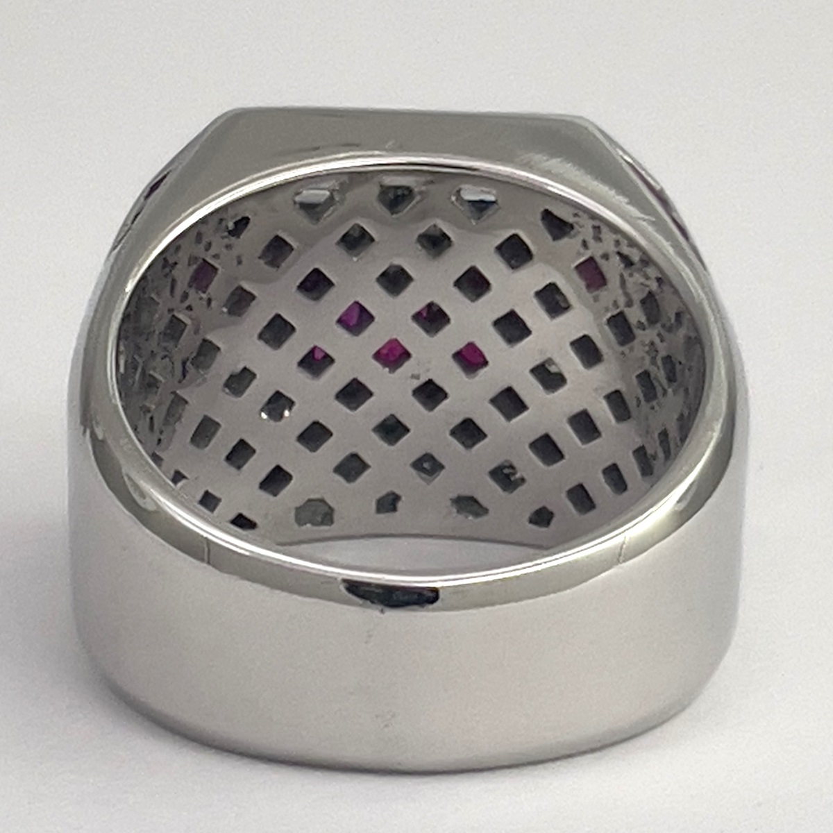 This handsome ring is made with 14k white gold and burnished set with diamonds and rubies.