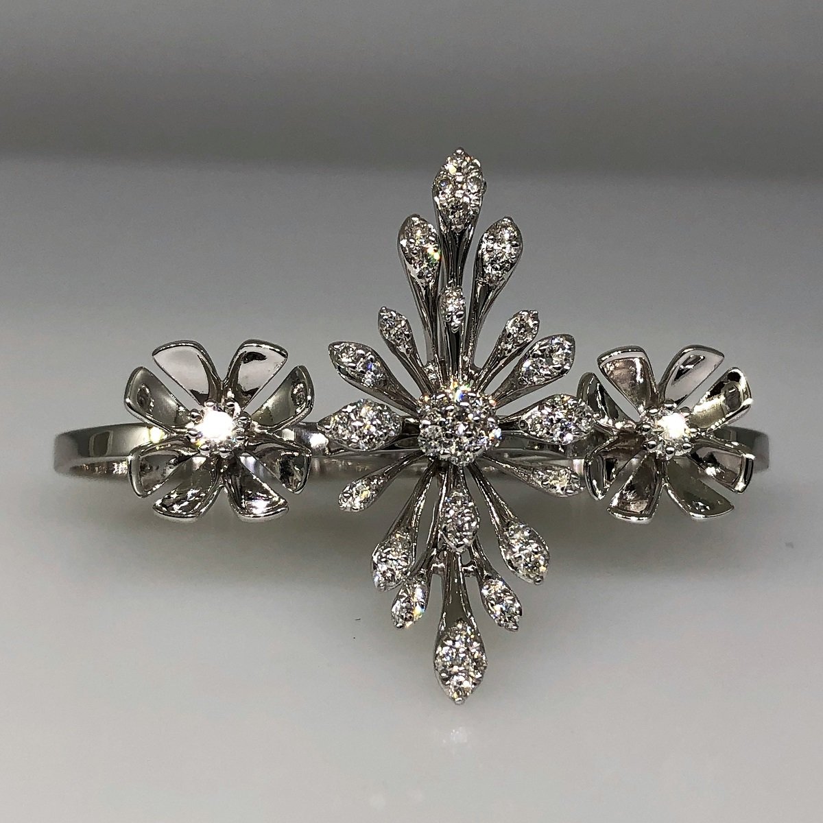 This custom two finger design is delicate and dainty – a perfect expression of style! Diamonds form a floral design that sparkles just so.