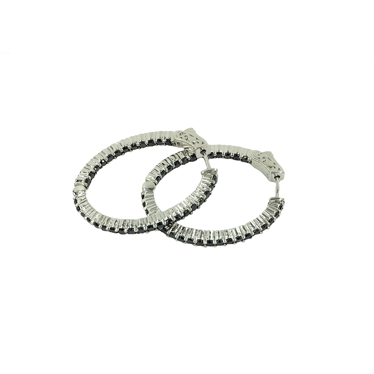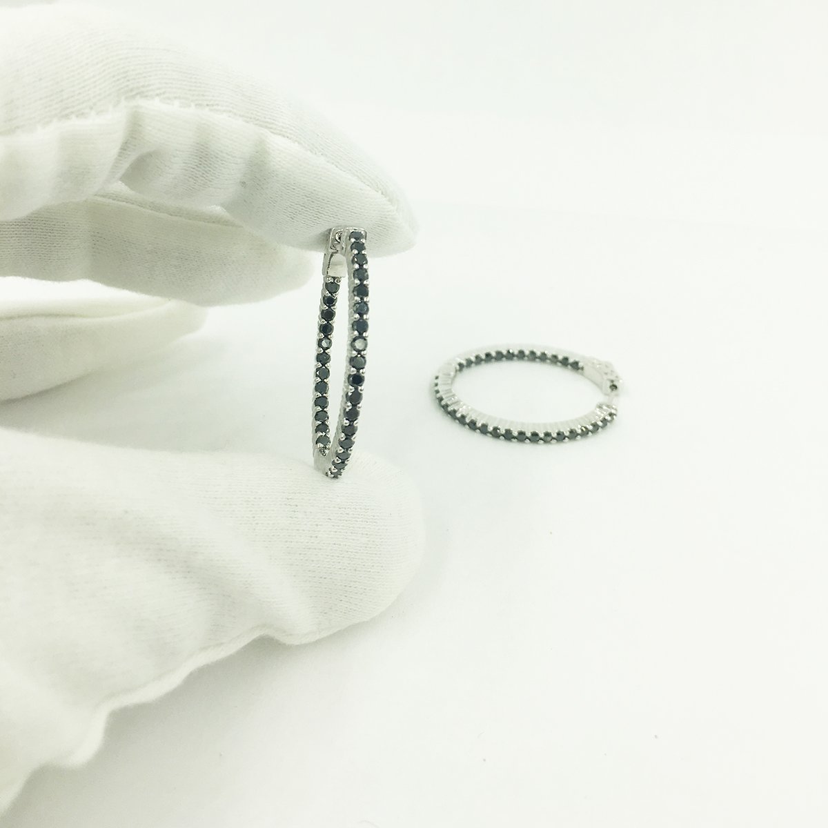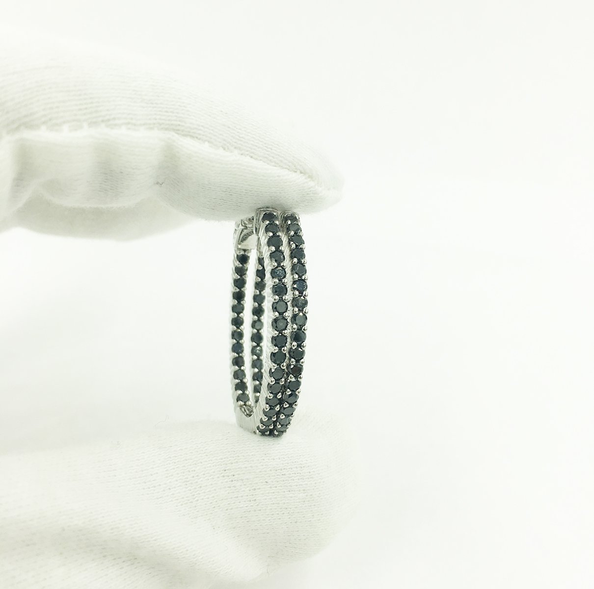 14k White gold hoops, holding natural round brilliant black diamonds in shared prongs.