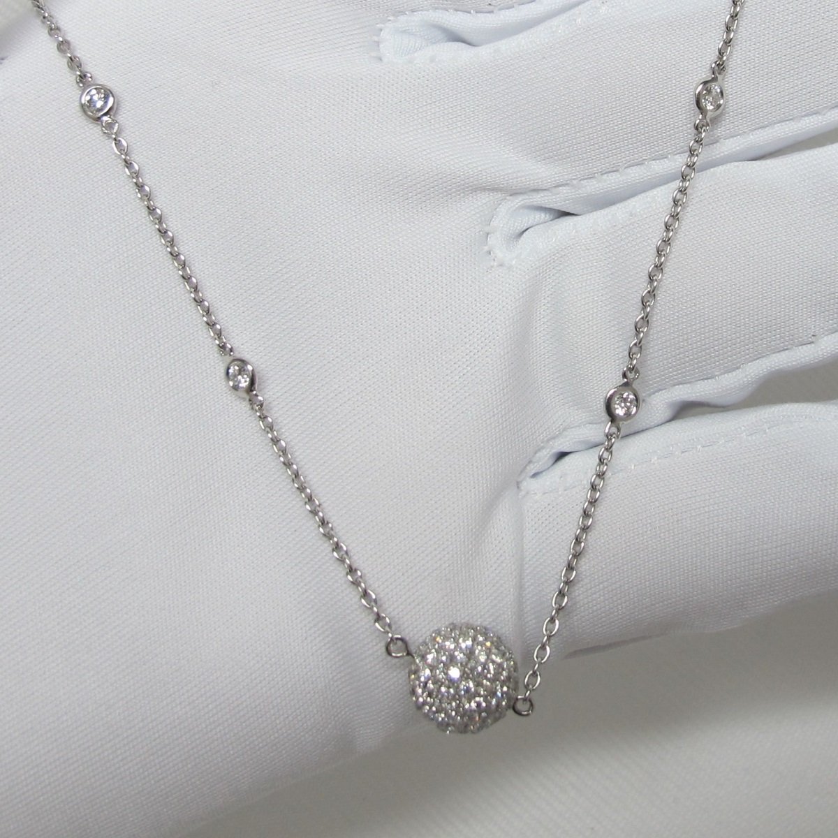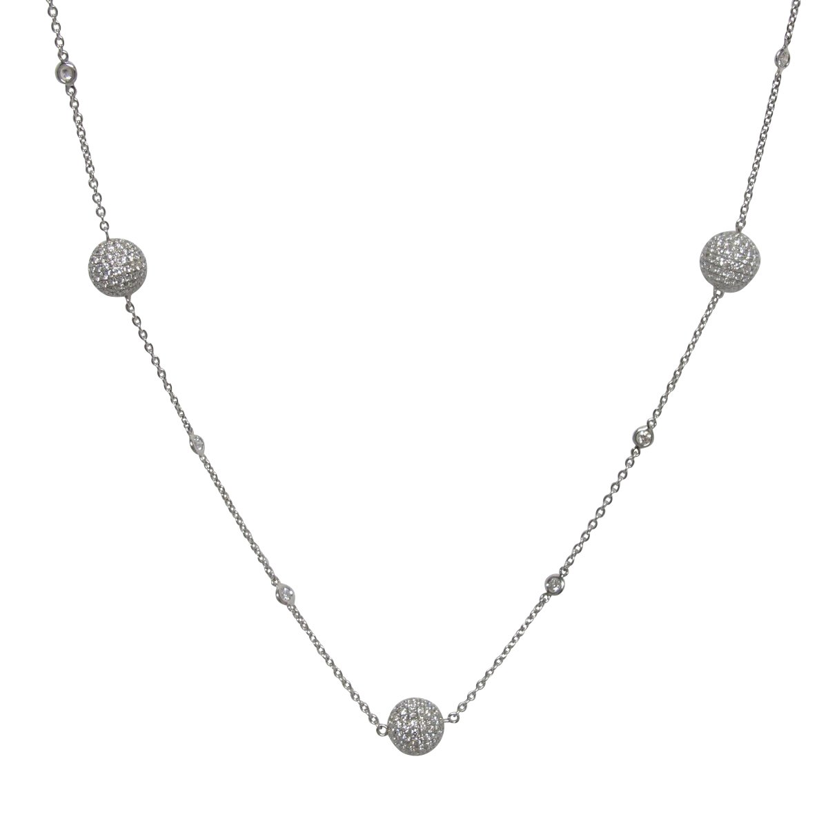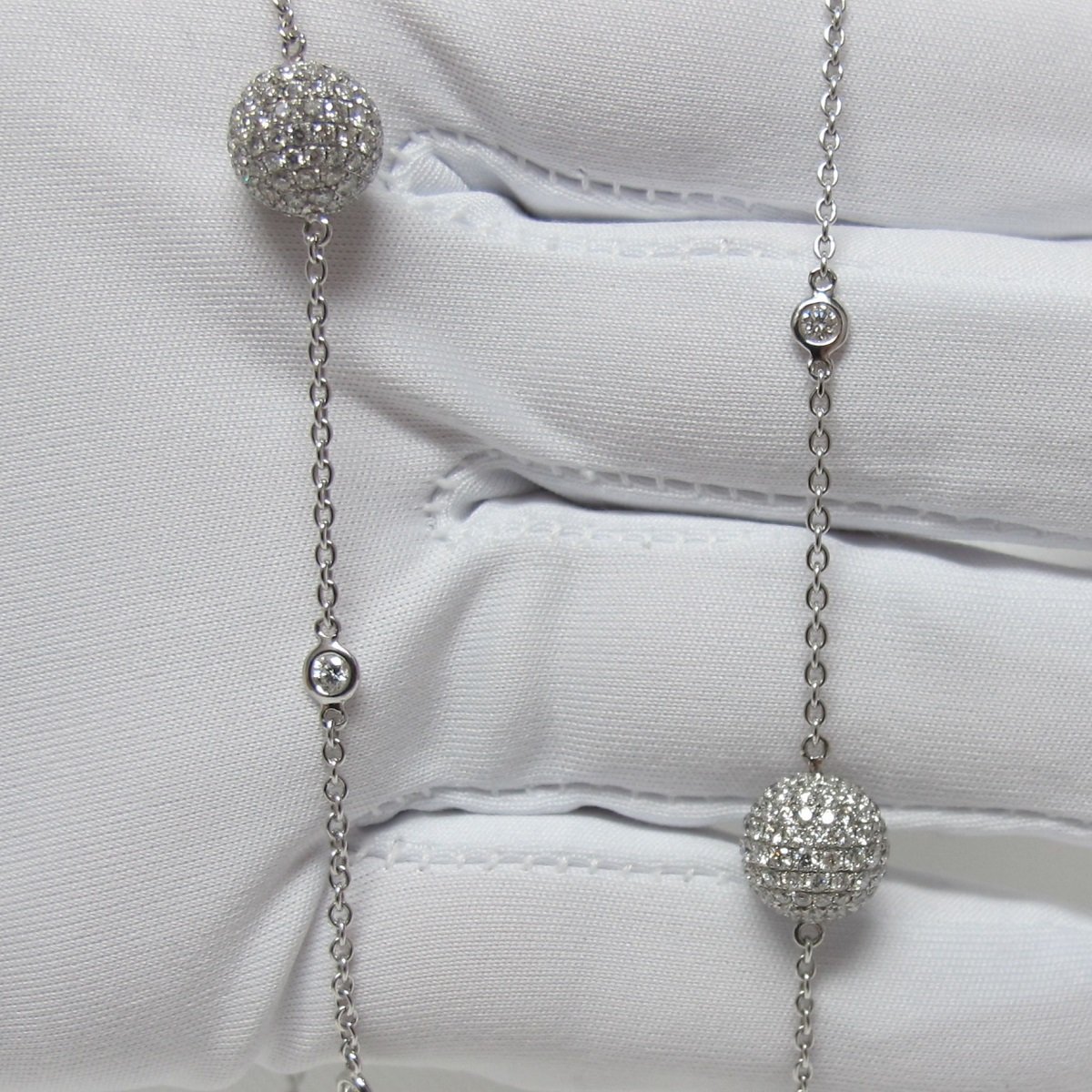 This necklace is 18k white gold and weigh 38 grams. Â It is thirty six inches long. Â And has nine diamond balls. The balls are encrusted with 3 carats of diamonds each.