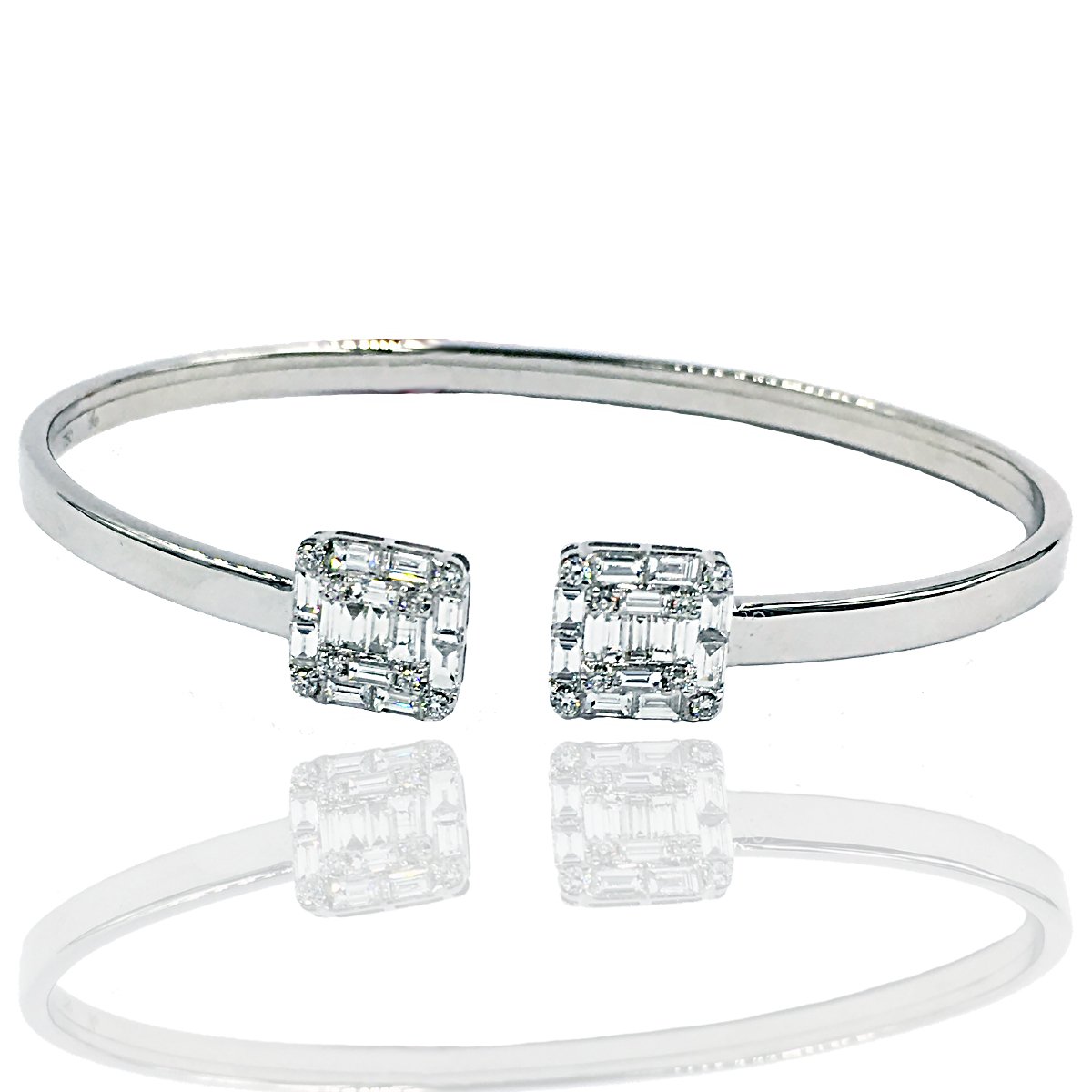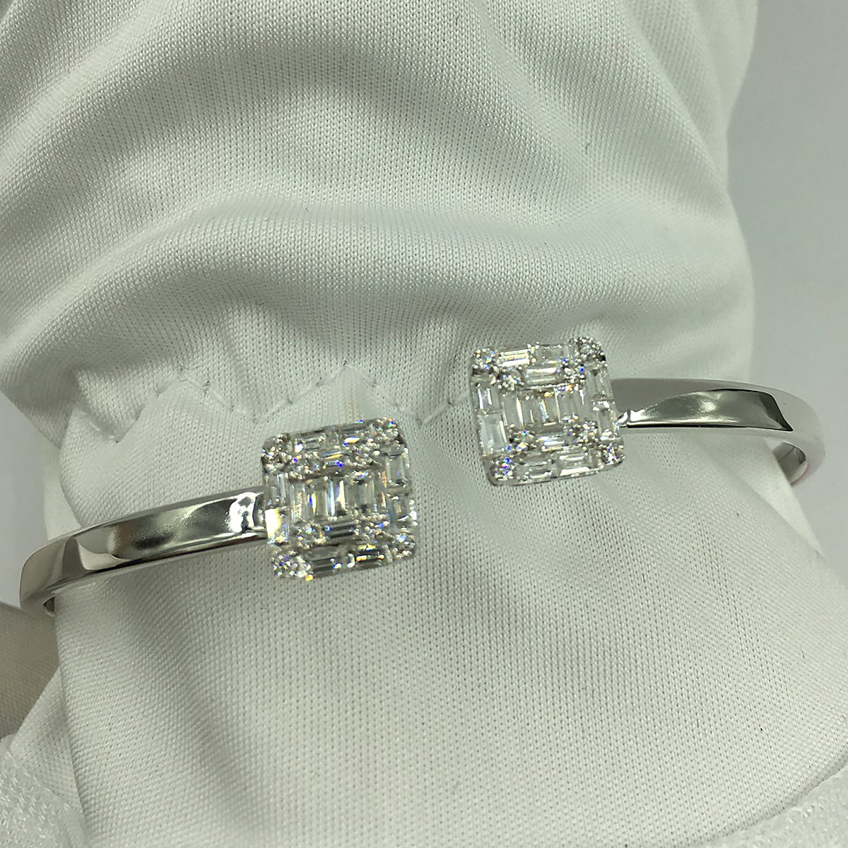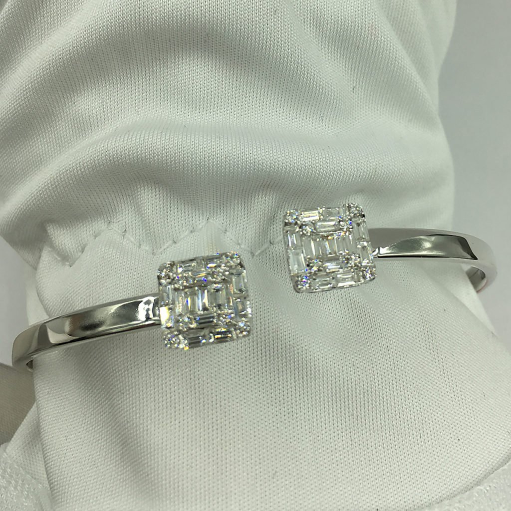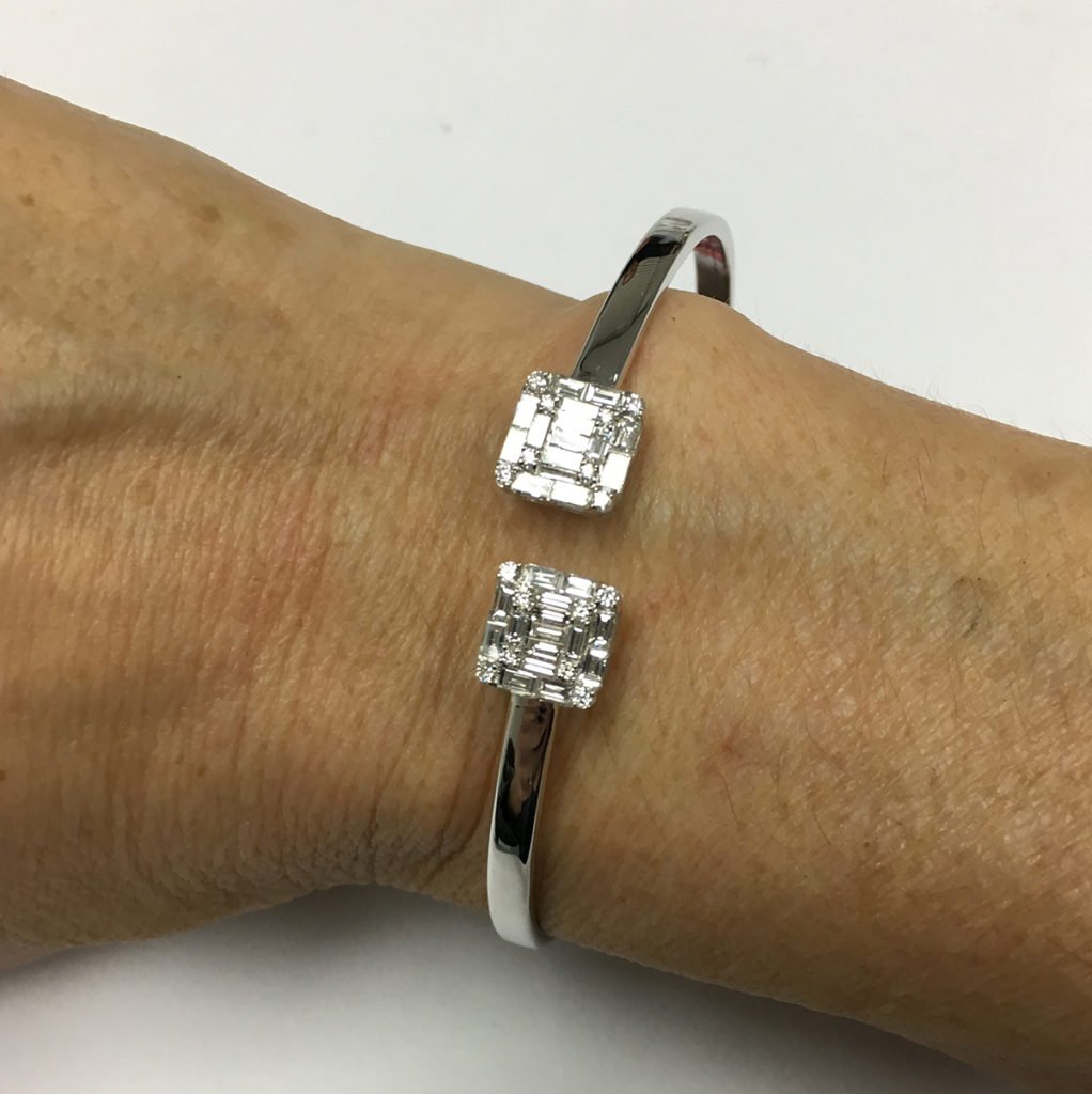 This 18k white gold bracelet is a flexible cuff that opens on the top.