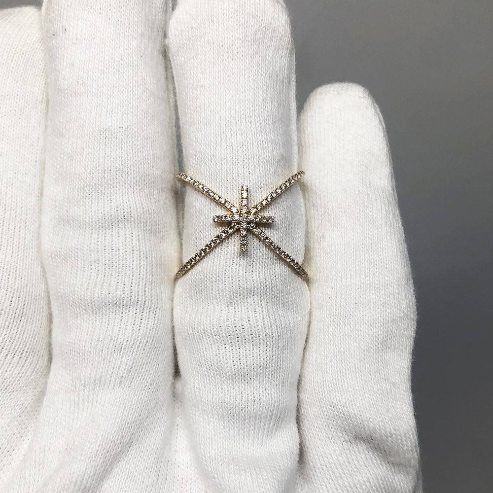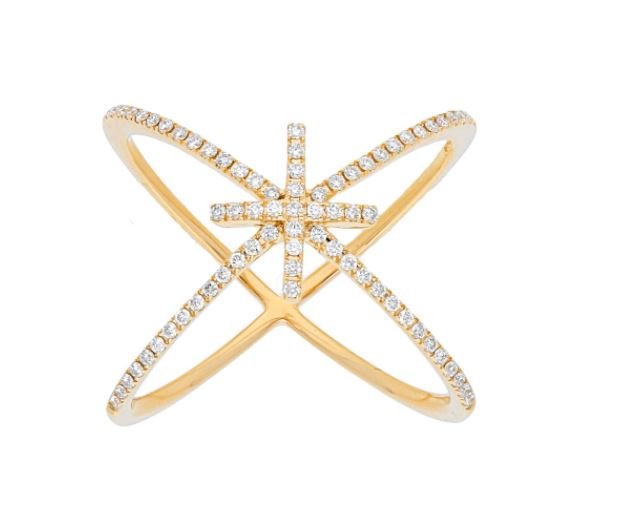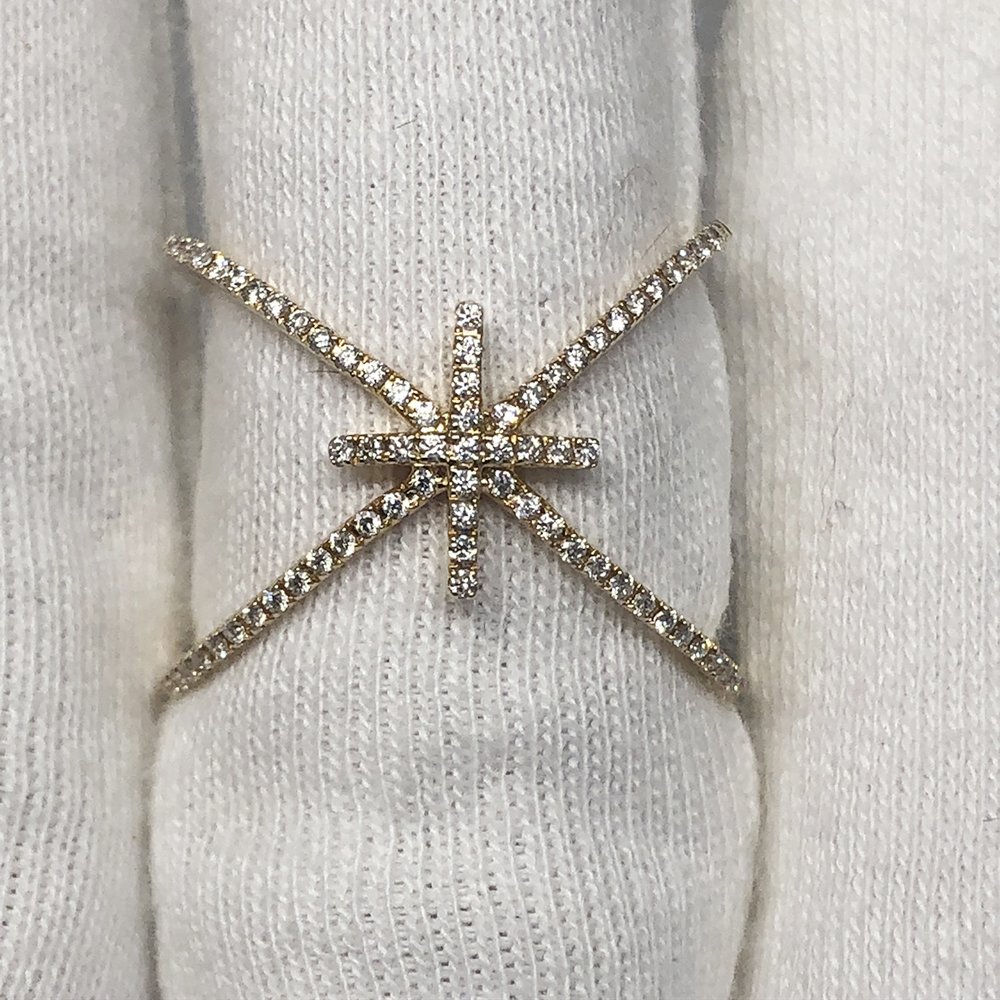 Criss-crossed diamond orbs with a cross on top come together to create this unique and stylish ring!