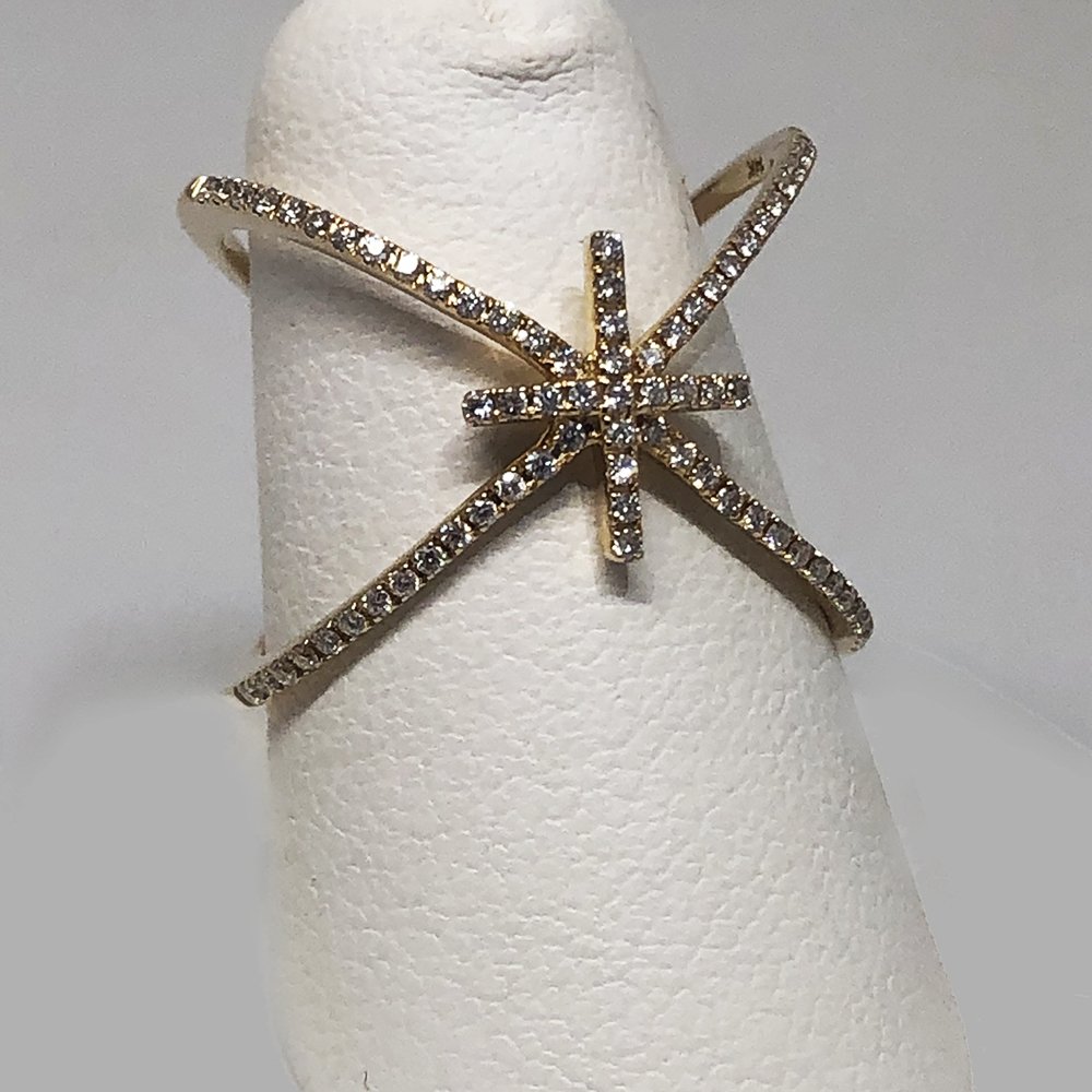 Unique and stylish, this clever design features shimmering diamonds arranged in a fun and trendy criss-cross design with a cross at center.