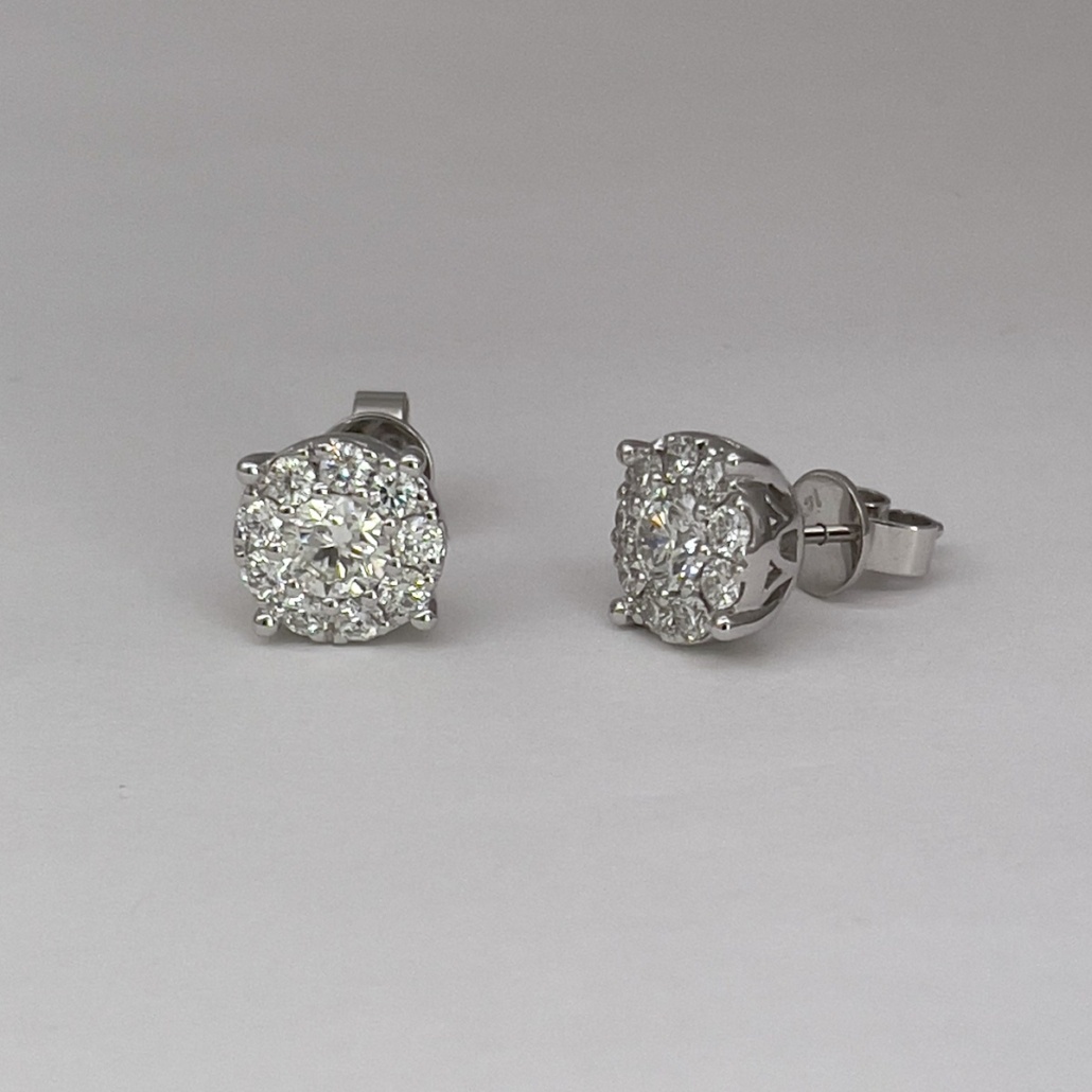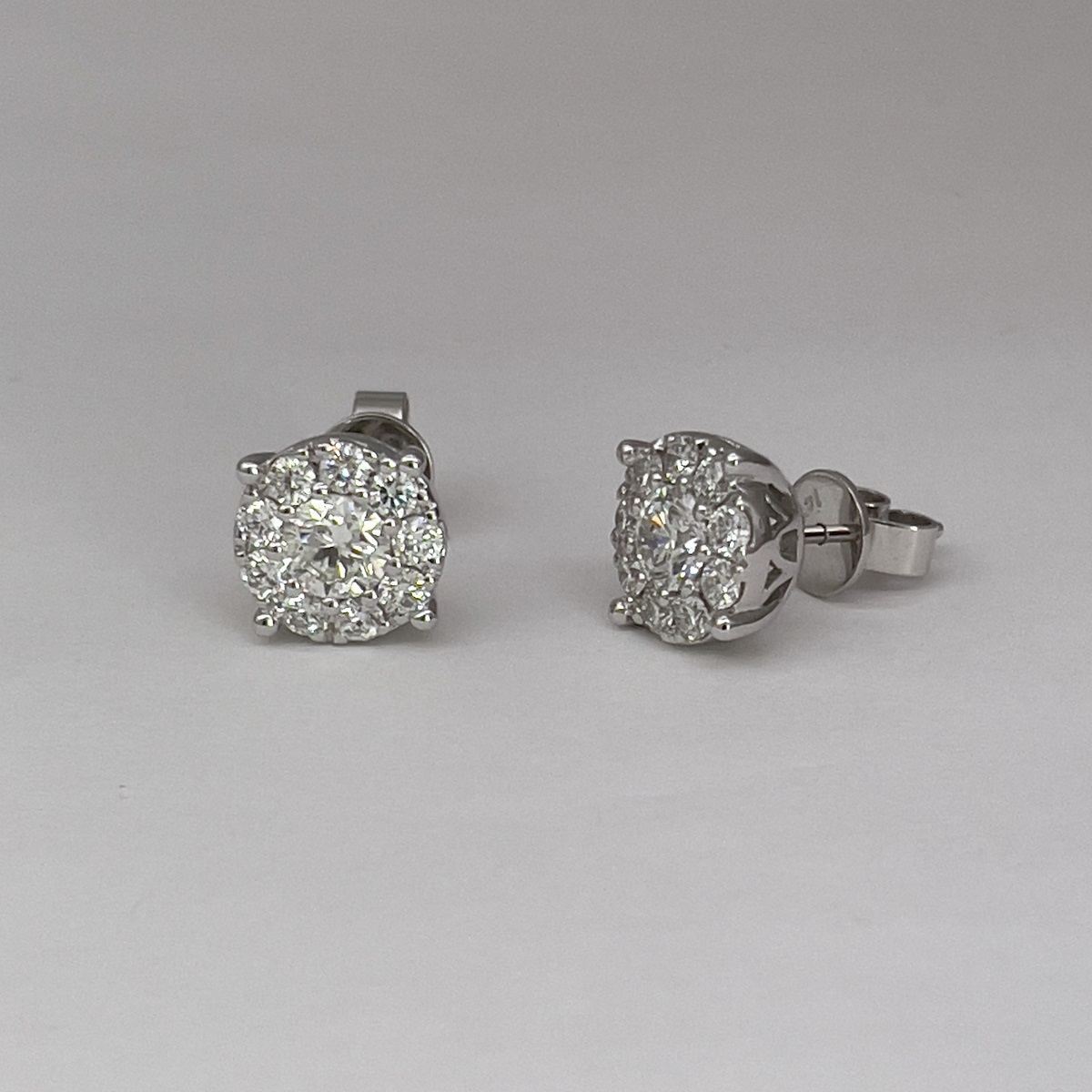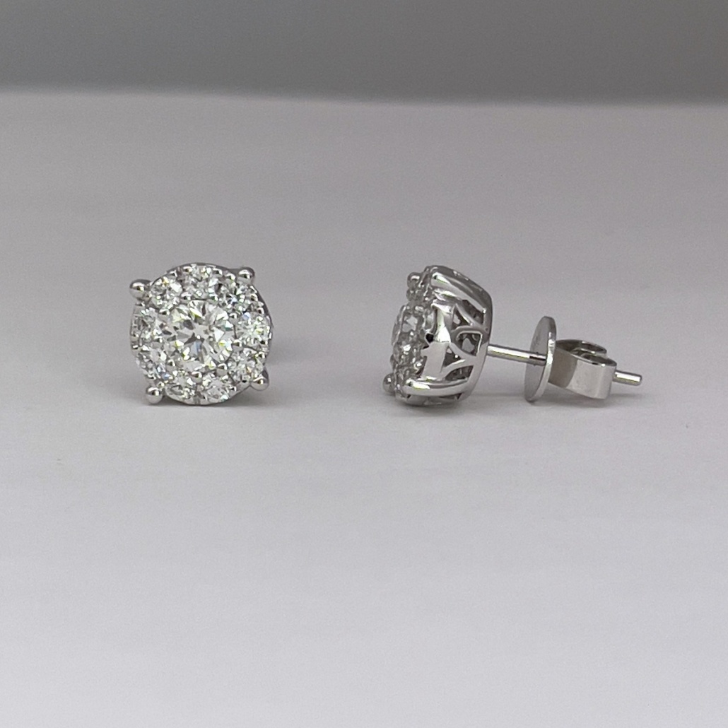 Stud earrings with a halo made with 14k white gold and prong set with diamonds.