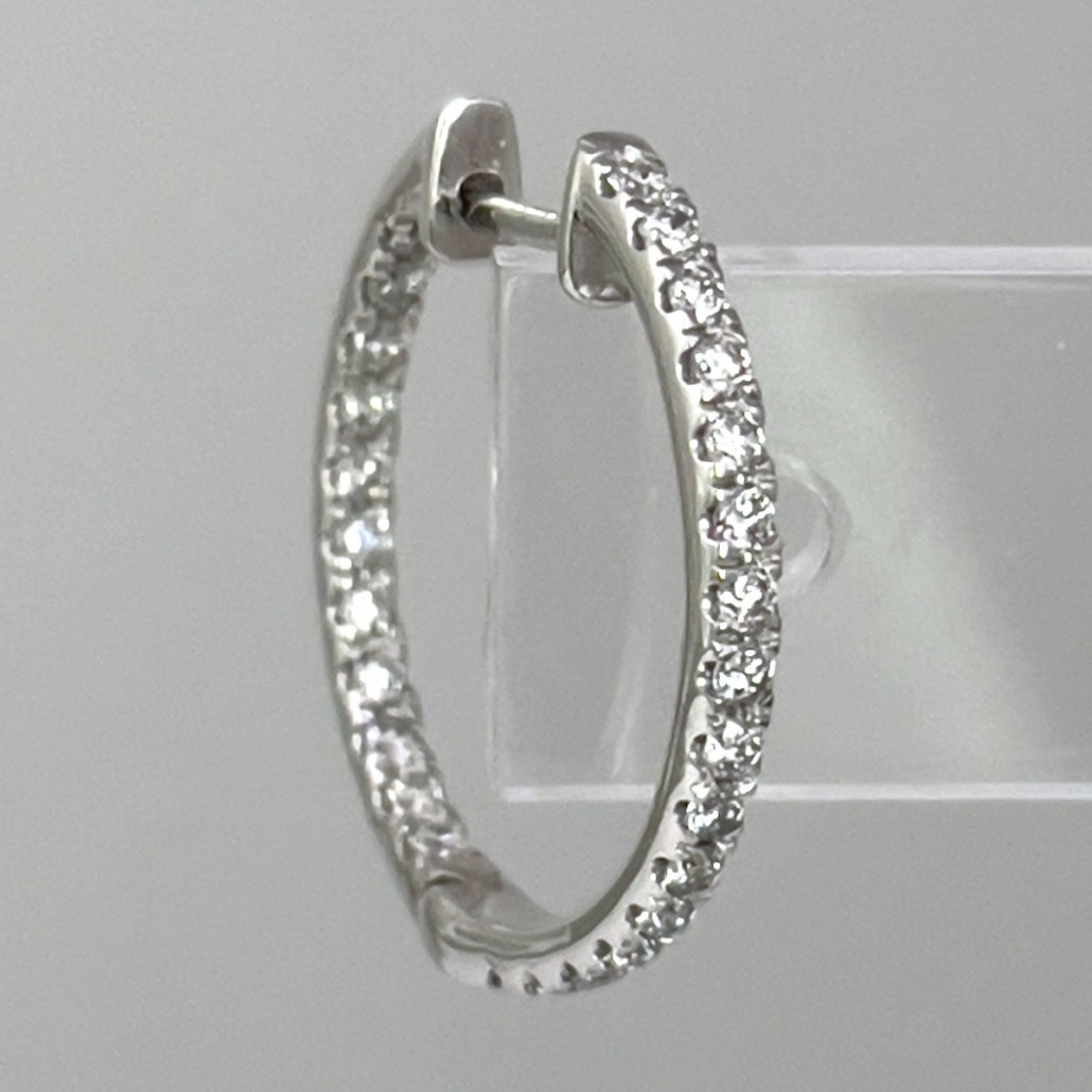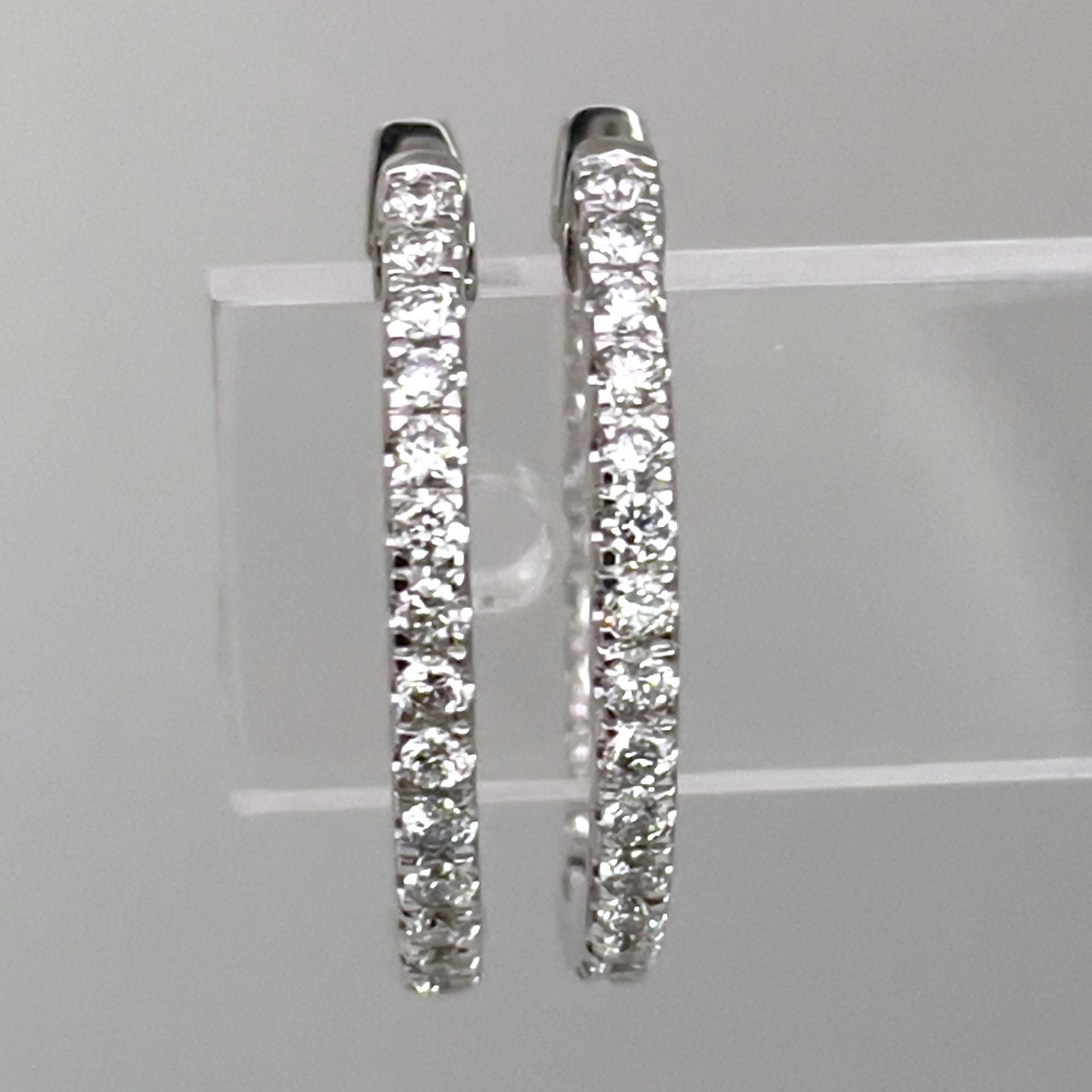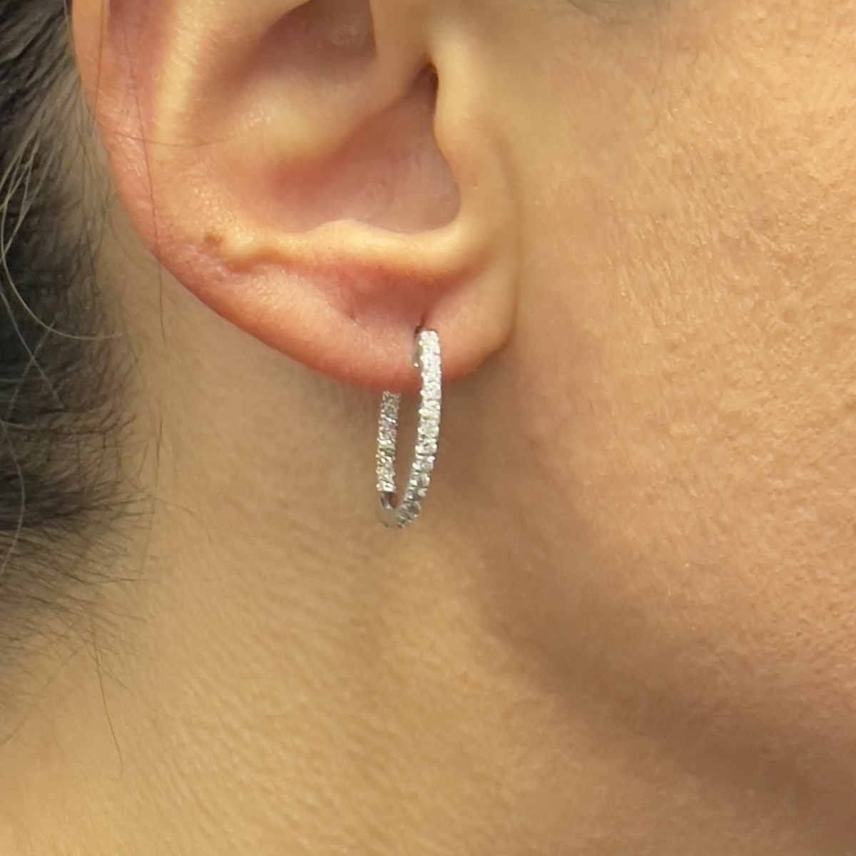 These diamond round hoop earrings are made with 14k white gold and four prong set diamonds.