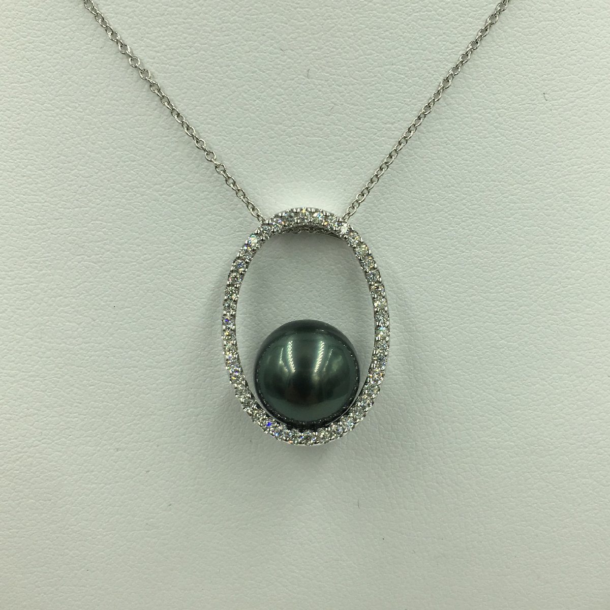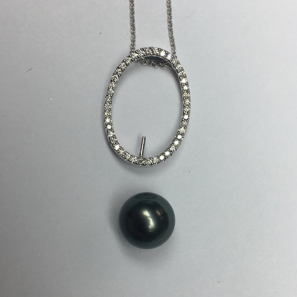 Open, Diamond Encrusted, Oval Pendant with Tahitian Pearl in the bottom center.