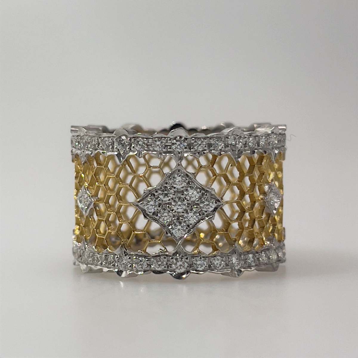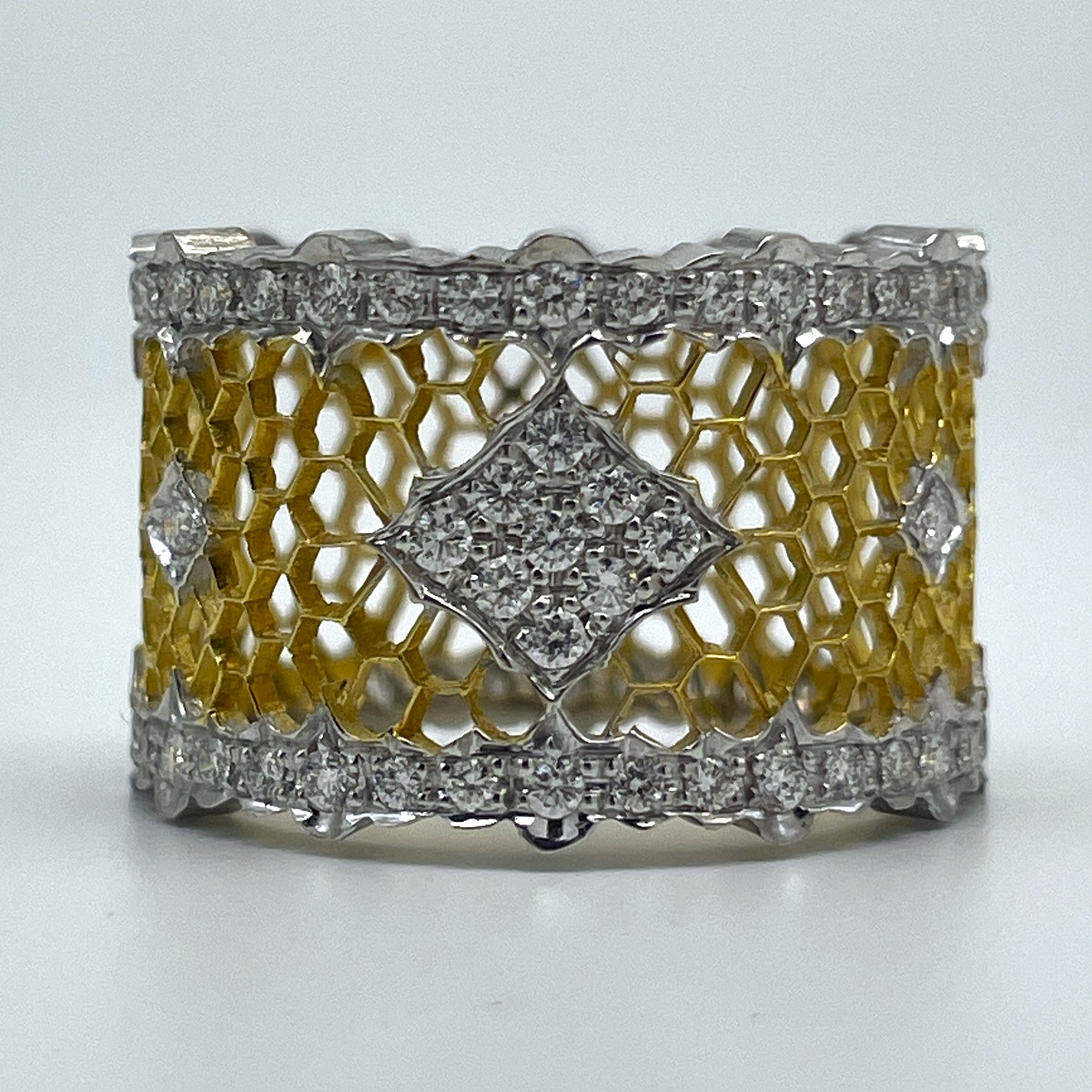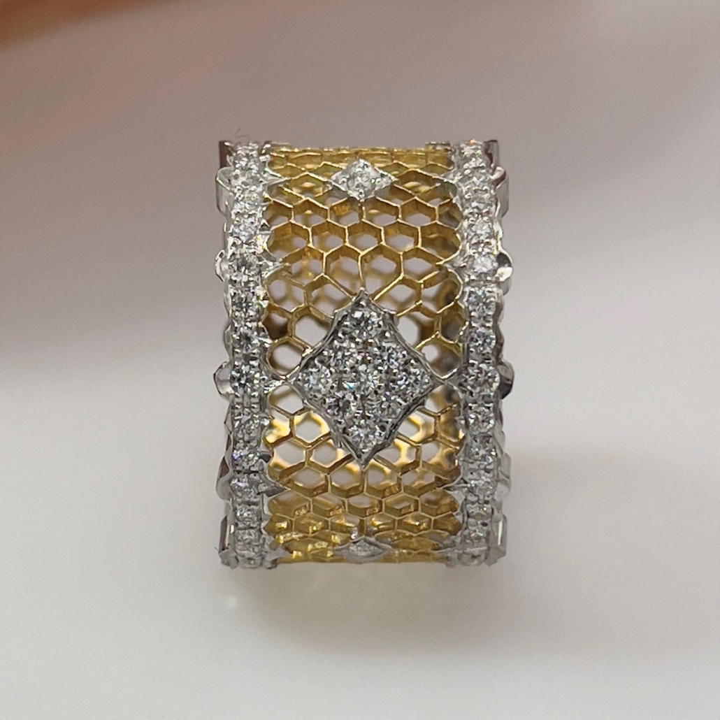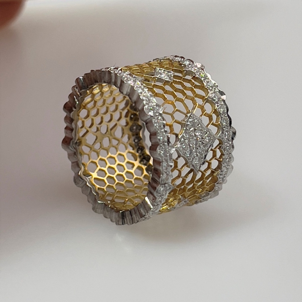This ring is made of 18k yellow and white with honeycomb design in yellow gold and the outer edges are diamond encrusted in white gold ribbon shaped design. Center is cluster of diamonds set in shared prongs.