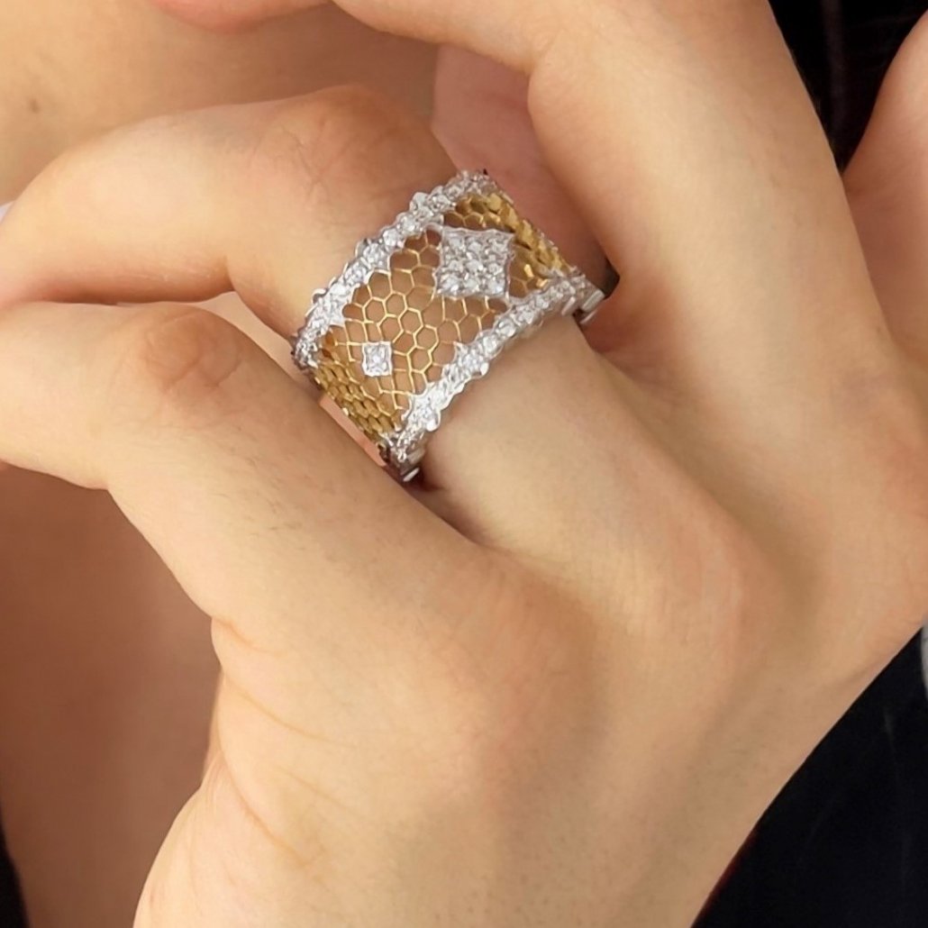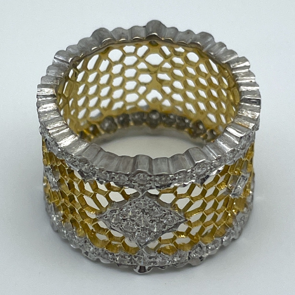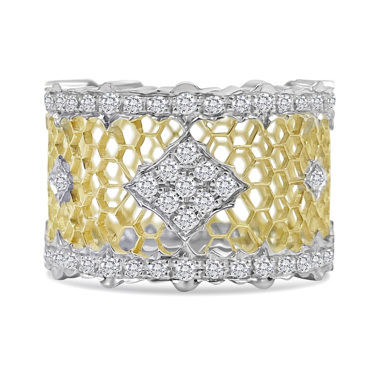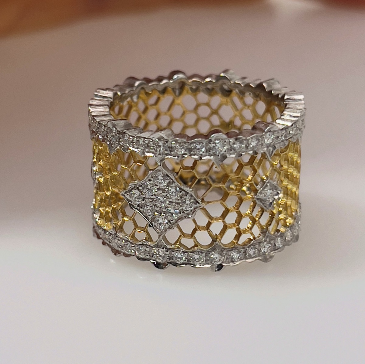 This ring is made of 18k yellow and white with honeycomb design in yellow gold and the outer edges are diamond encrusted in white gold ribbon shaped design. Center is cluster of diamonds set in shared prongs.