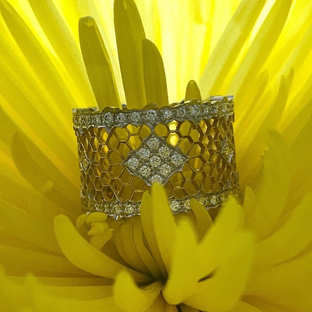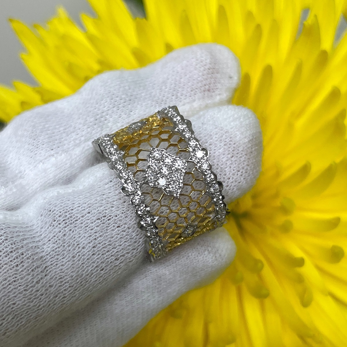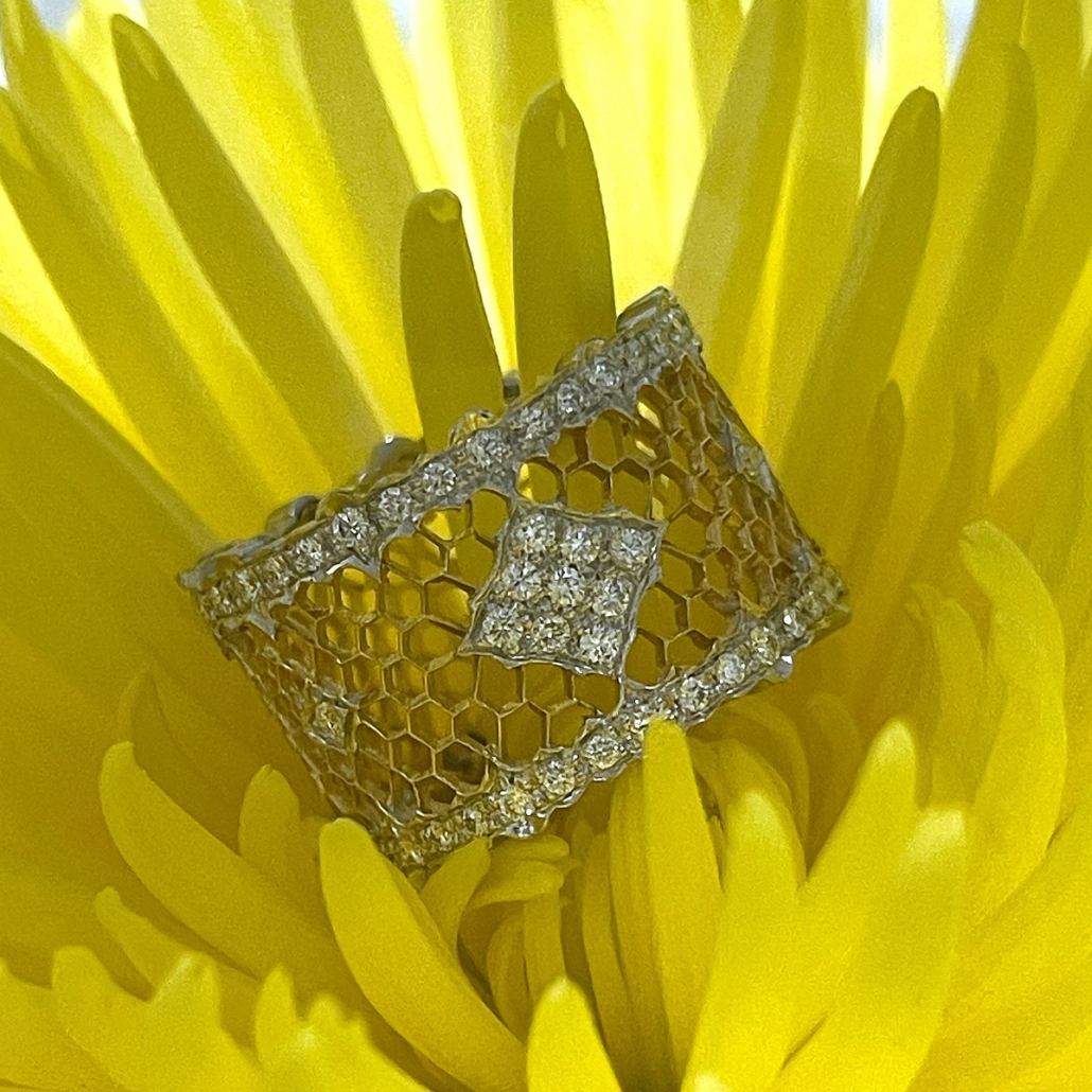 Tags 18k White, 18k Yellow, Bees, Cluster, Diamond, Honeycomb, Ring, Two Tone