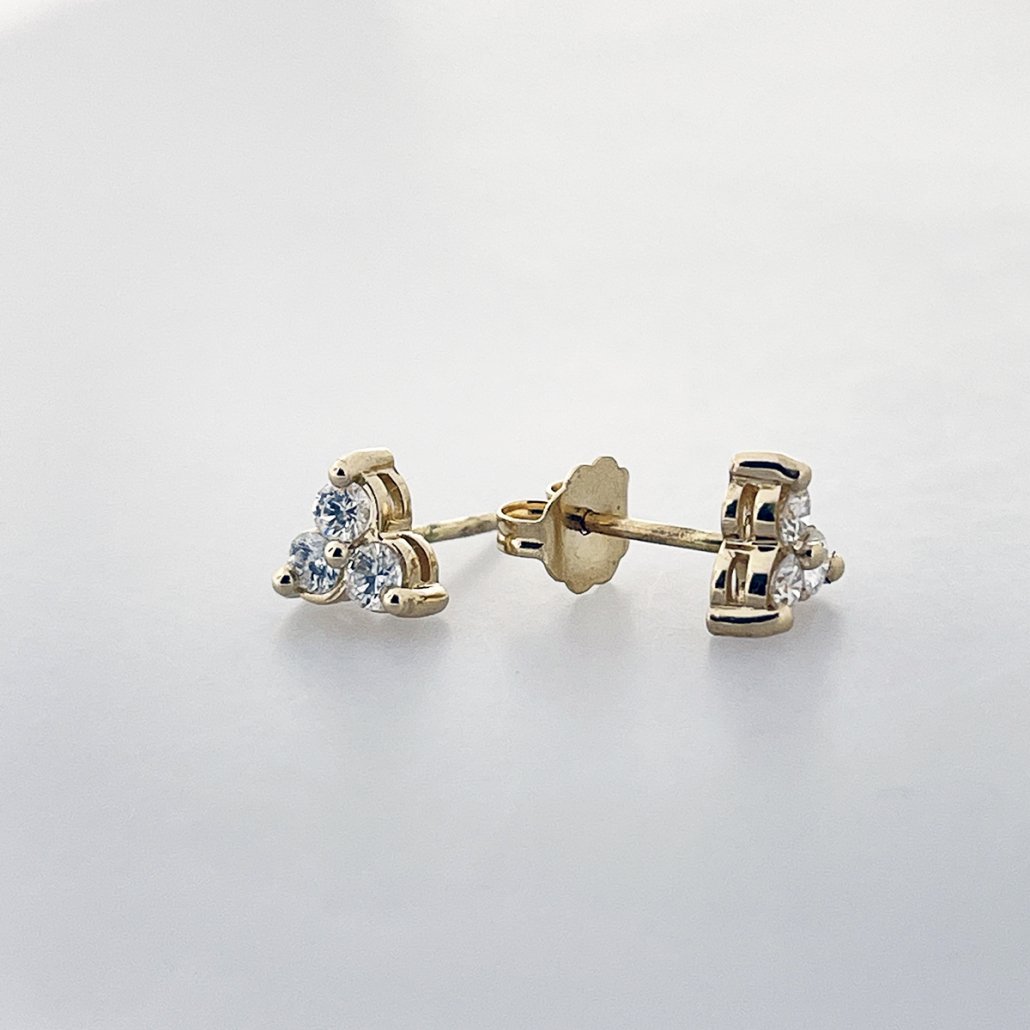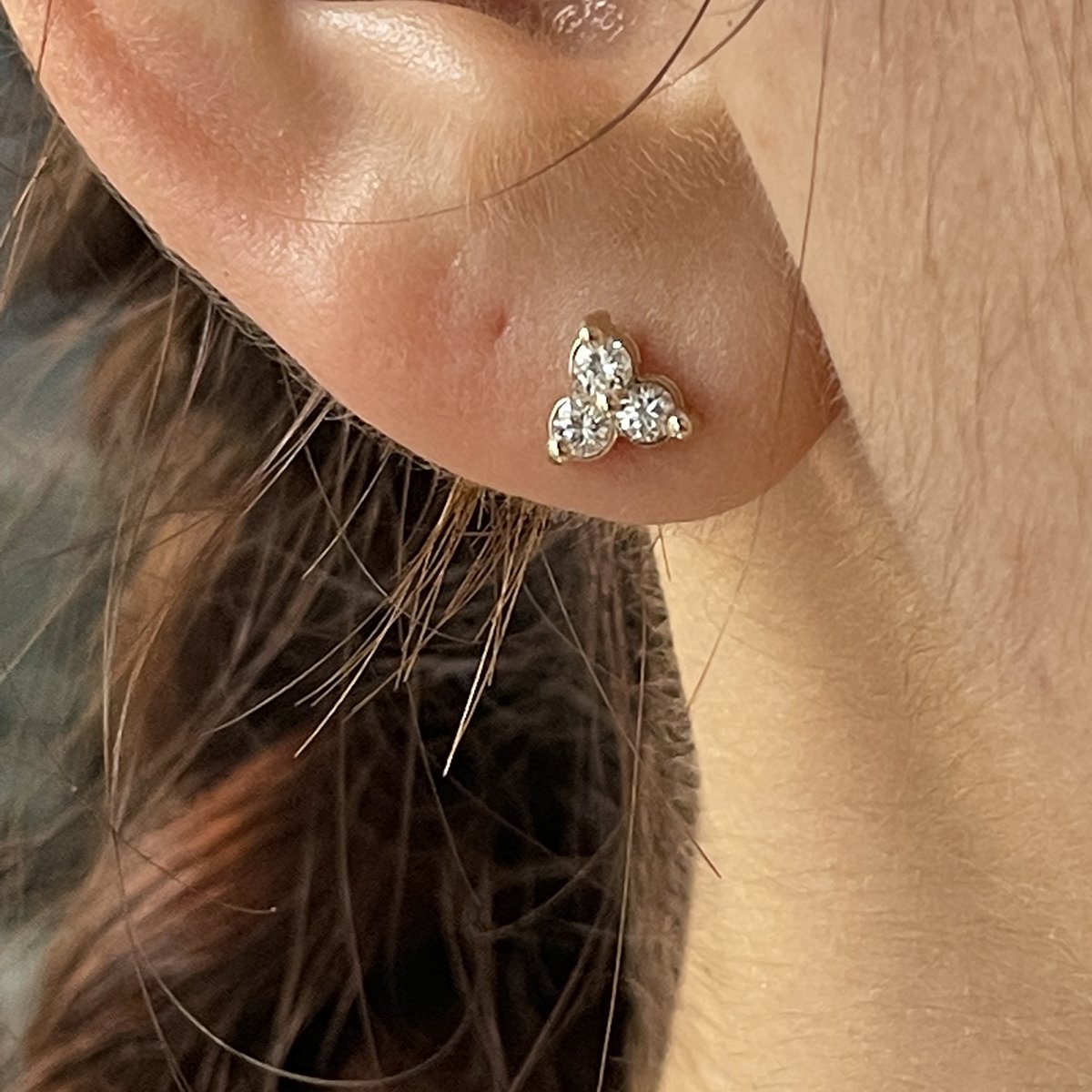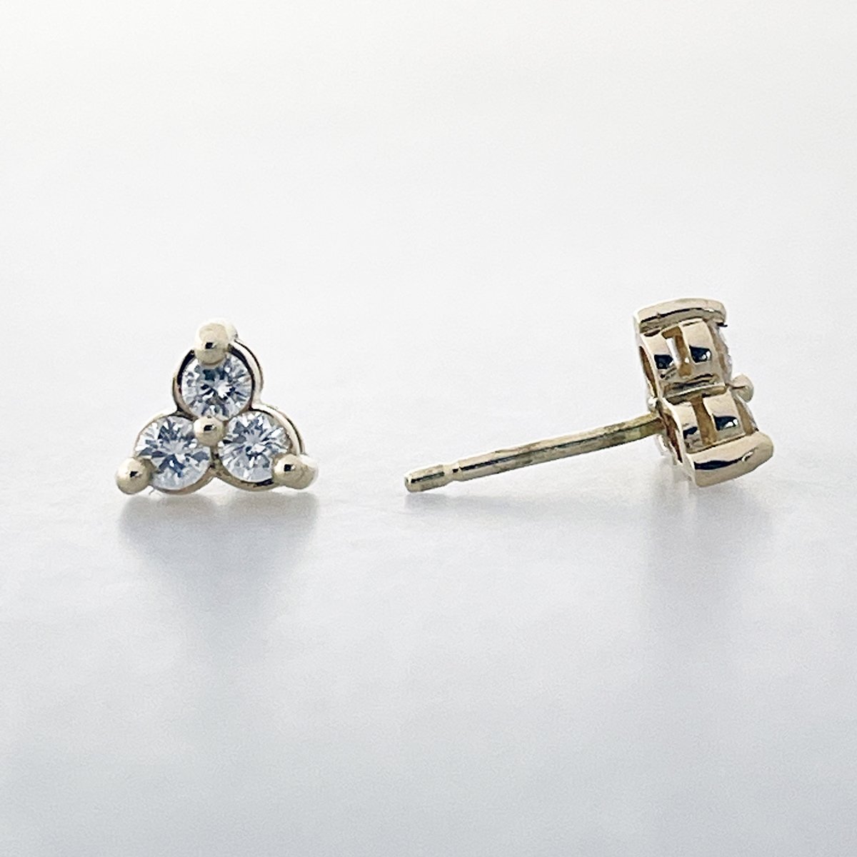 This petite trio of diamonds is a simple but elegant stud.  The element of three promises good things are coming.  Three prong setting looks like a bezel from the front!