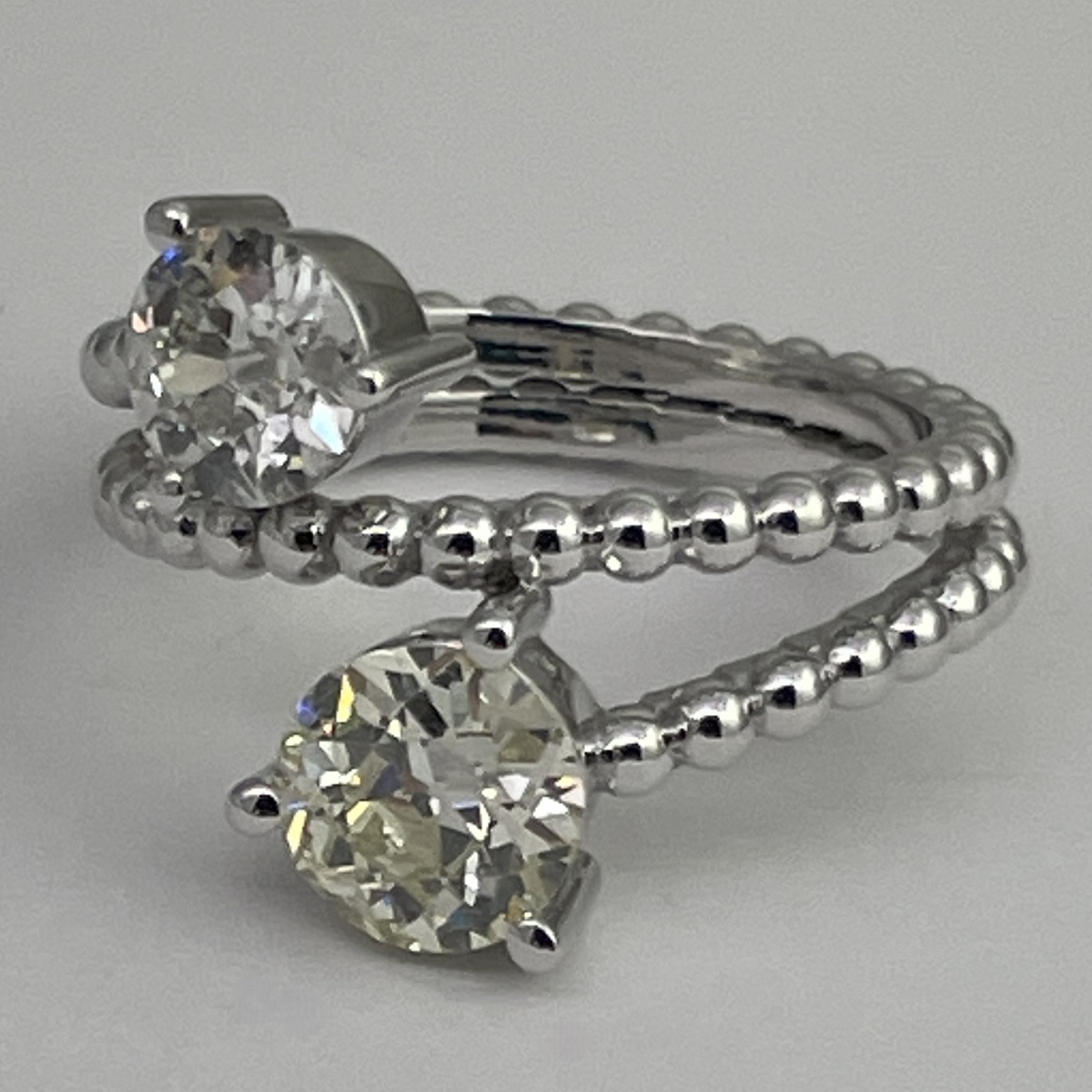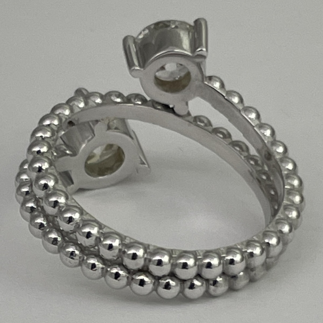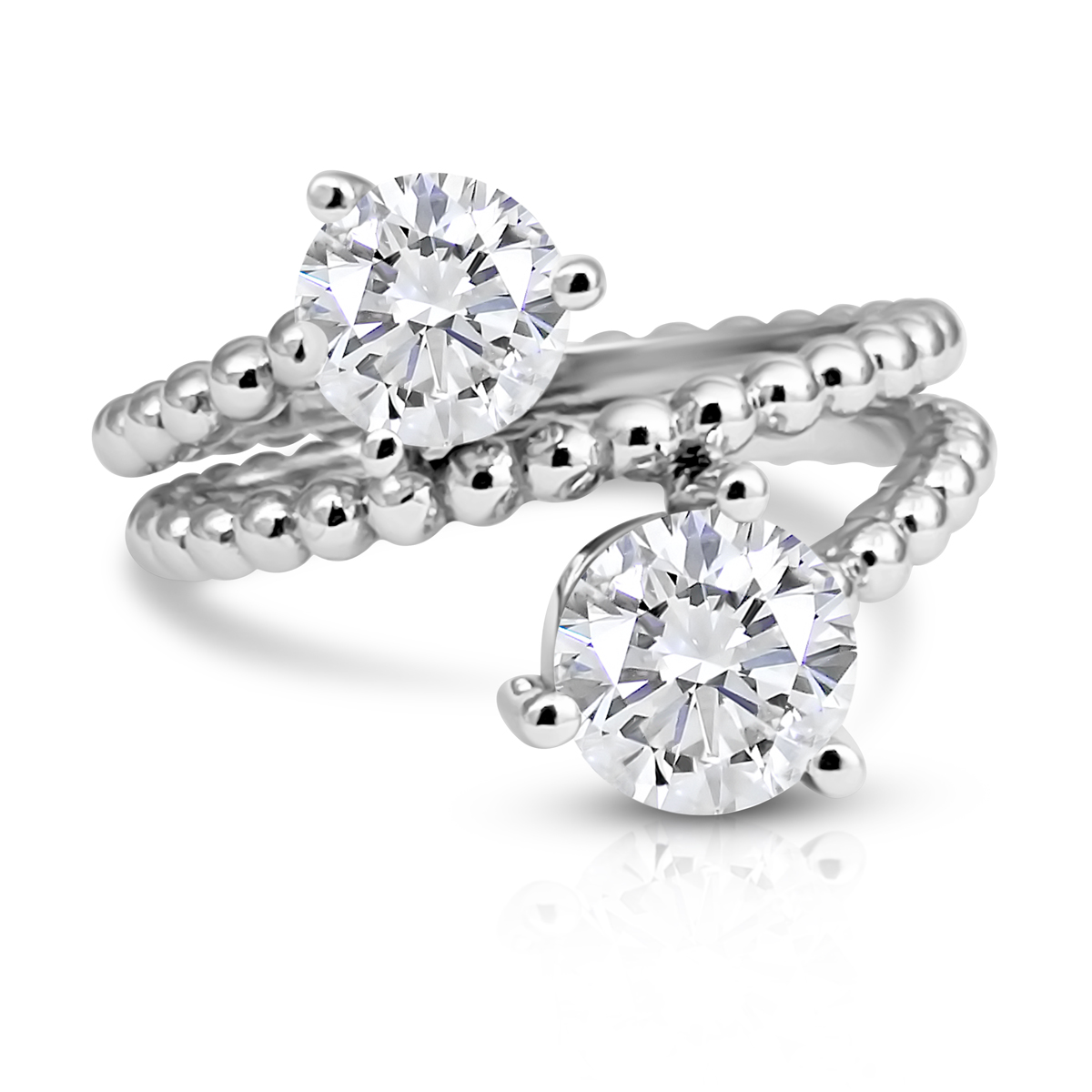 Turn heads with this dazzling diamond ring, featuring two brilliant round diamonds set in a playful bypass design. The beaded white gold band adds texture and modern elegance. This ring is for the woman who loves making a bold, beautiful statement—with twice the brilliance and twice the charm.