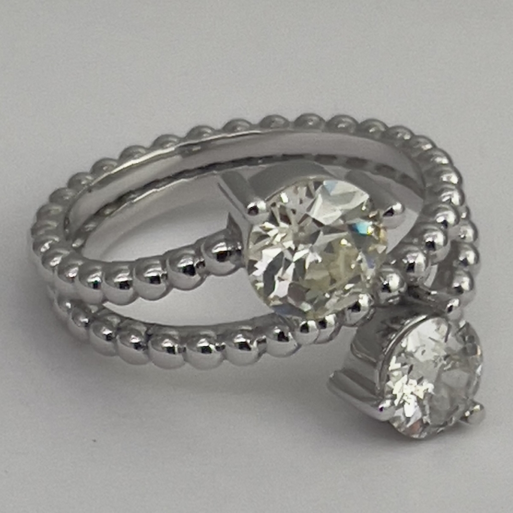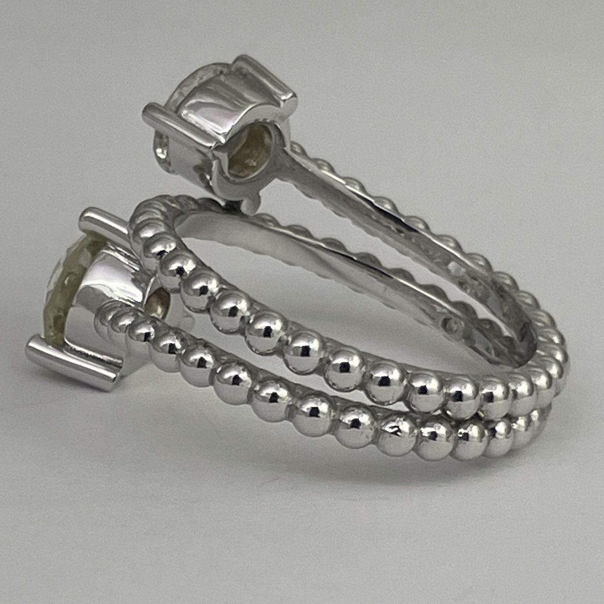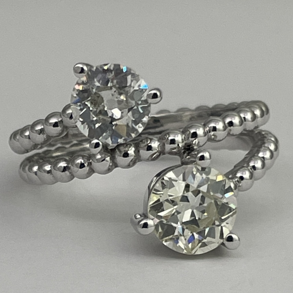 Turn heads with this dazzling diamond ring, featuring two brilliant round diamonds set in a playful bypass design. The beaded white gold band adds texture and modern elegance. This ring is for the woman who loves making a bold, beautiful statement—with twice the brilliance and twice the charm.