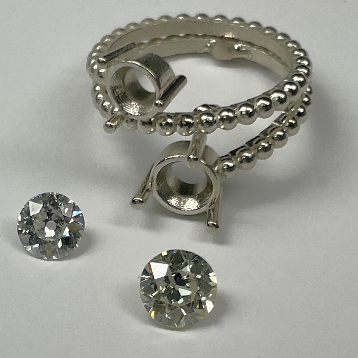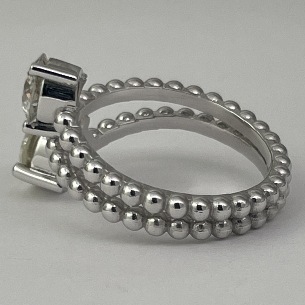 The beaded white gold band adds texture and modern elegance, perfectly complementing the timeless sparkle of each stone.