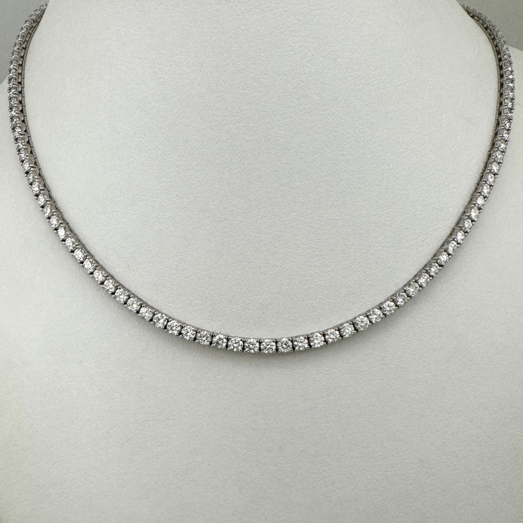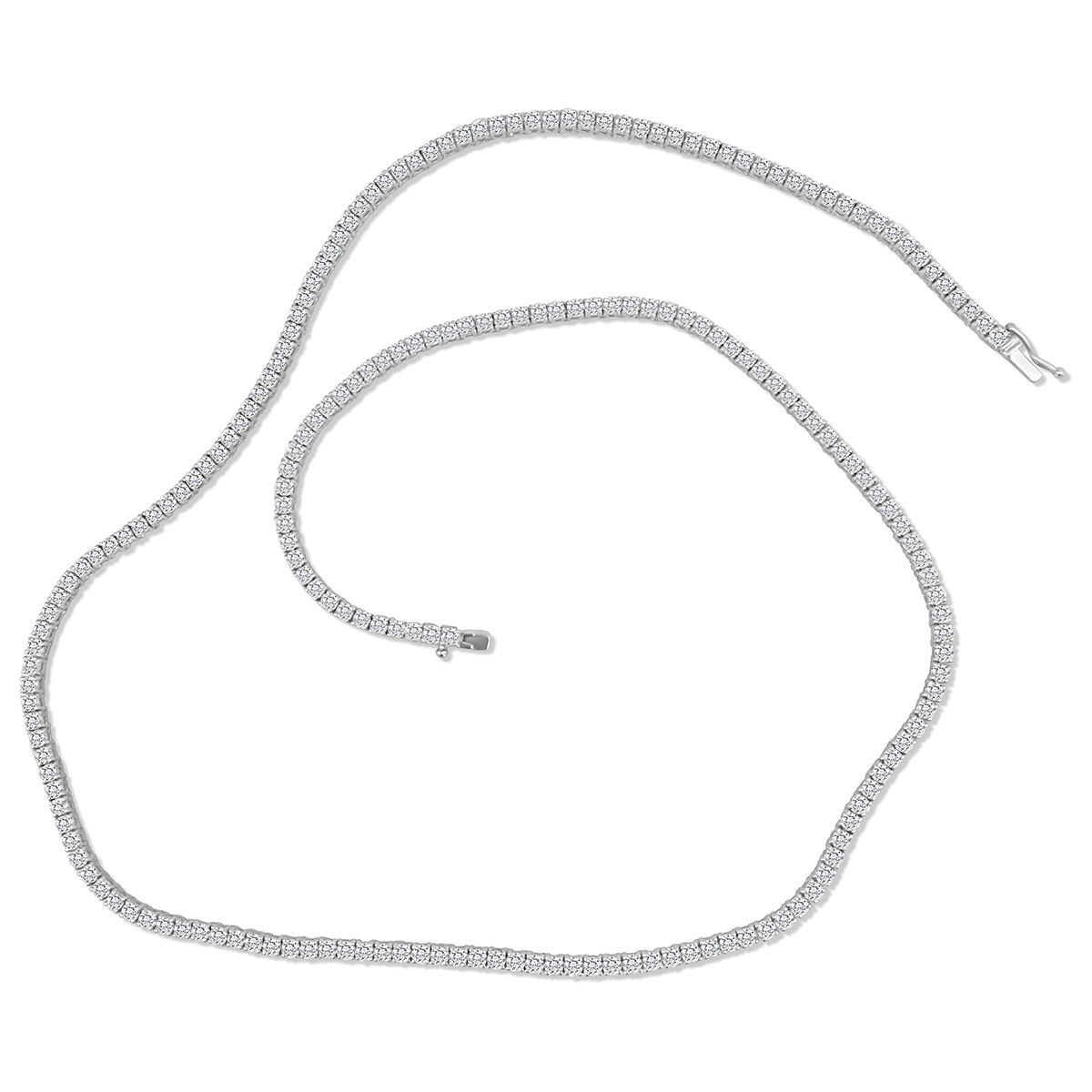 This in line necklace is made with 14k white gold and prong set with lab grown round brilliant diamonds.